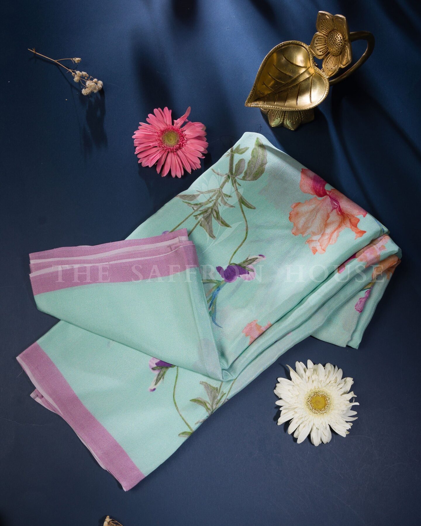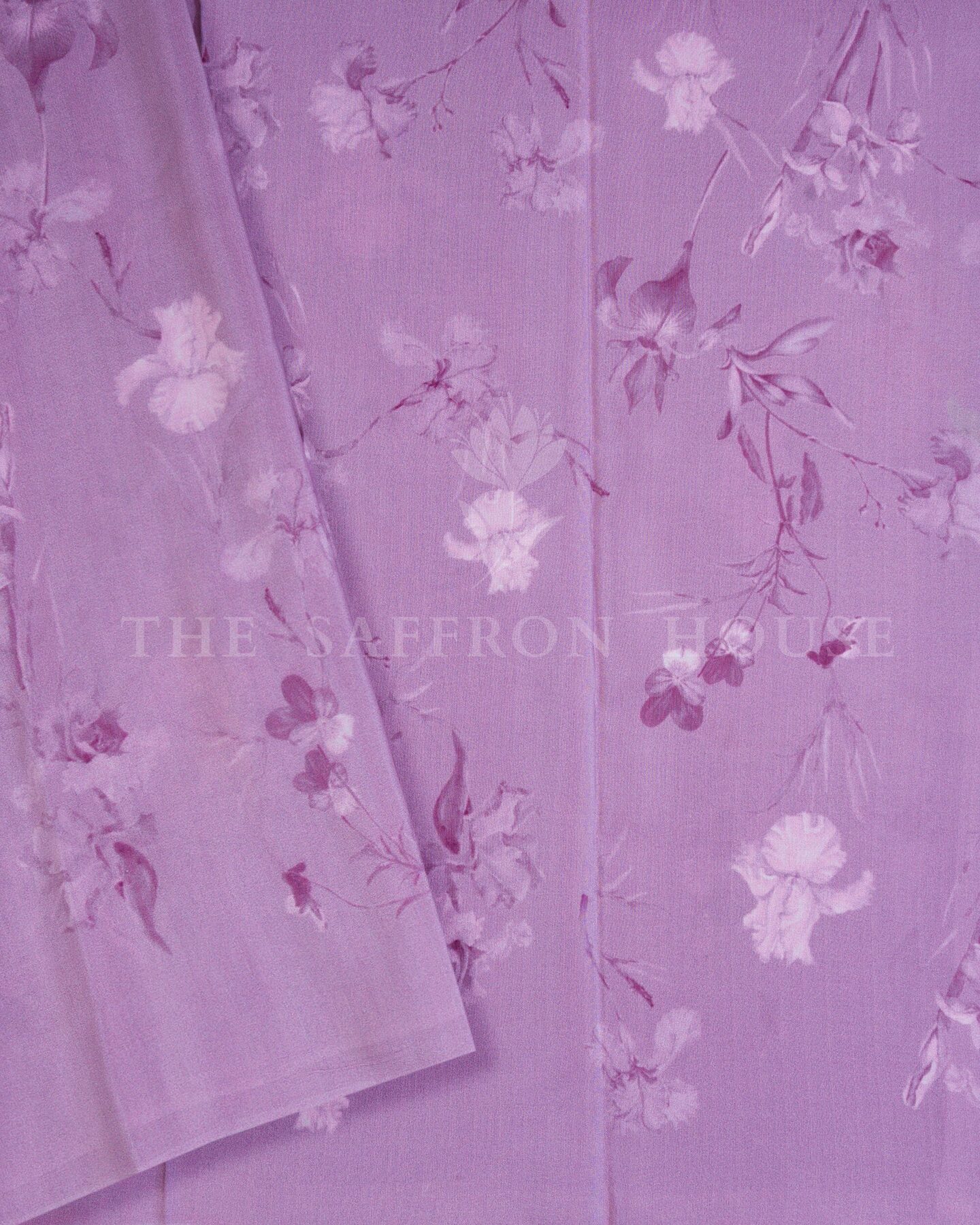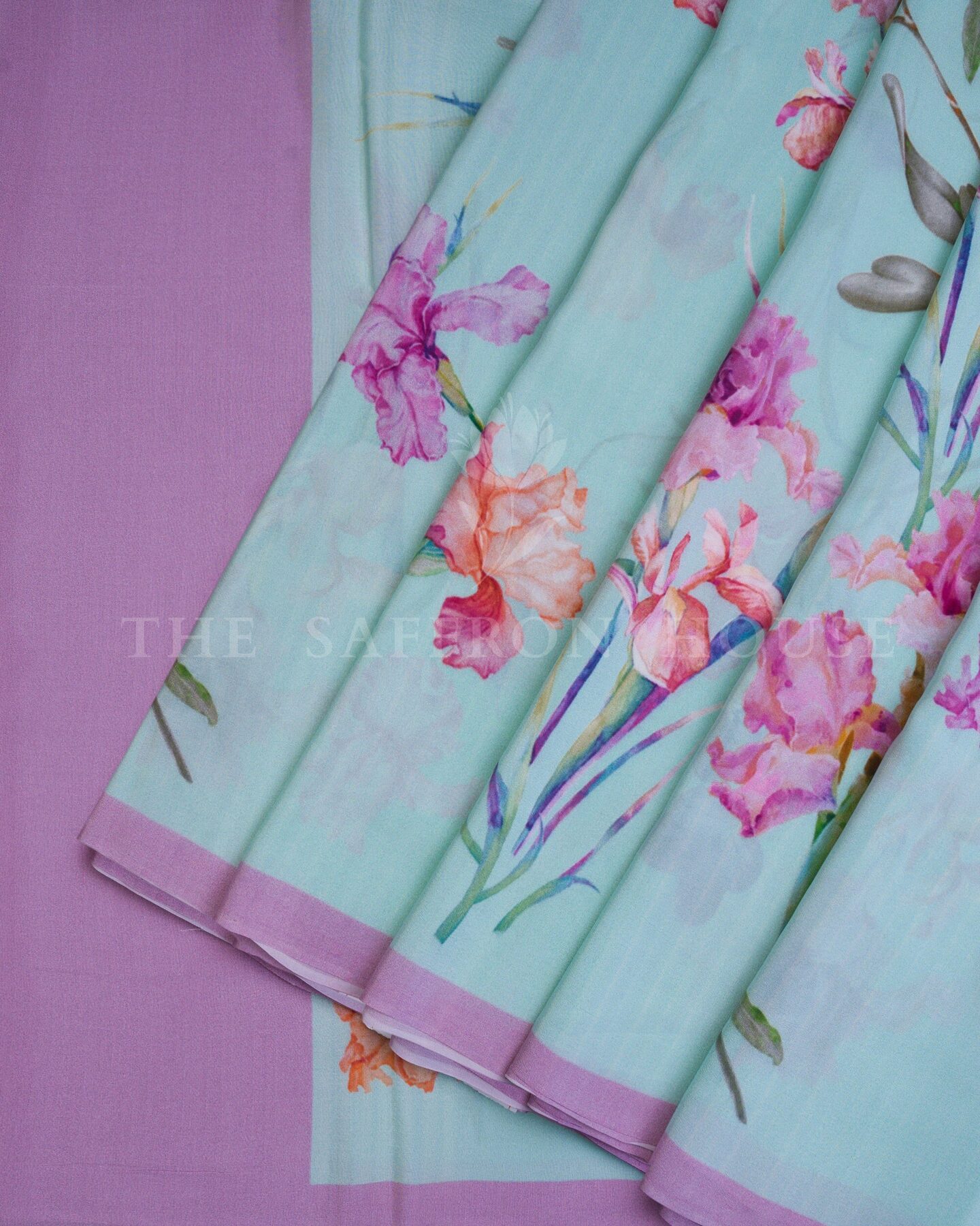 पेस्टल लैवेंडर और एक्वा रंगों में फूलों का एक नाज़ुक नृत्य, यह क्रेप प्रिंटेड सिल्क साड़ी, शान की एक झलक है। अपनी सहज ड्रेपिंग और कोमल चमक के साथ, यह गर्मियों के ब्रंच, गार्डन वेडिंग या रोज़मर्रा की शान के लिए एकदम सही है। आधुनिक महिला के लिए तैयार की गई जो आराम और आकर्षण को महत्व देती है। कपड़ा: क्रेप सिल्क तकनीक: डिजिटल फ्लोरल प्रिंट एहसास: हल्का, बहता हुआ कपड़ा स्टाइलिंग टिप: इसे लैवेंडर ब्लाउज और न्यूनतम मोतियों के साथ पहनें।