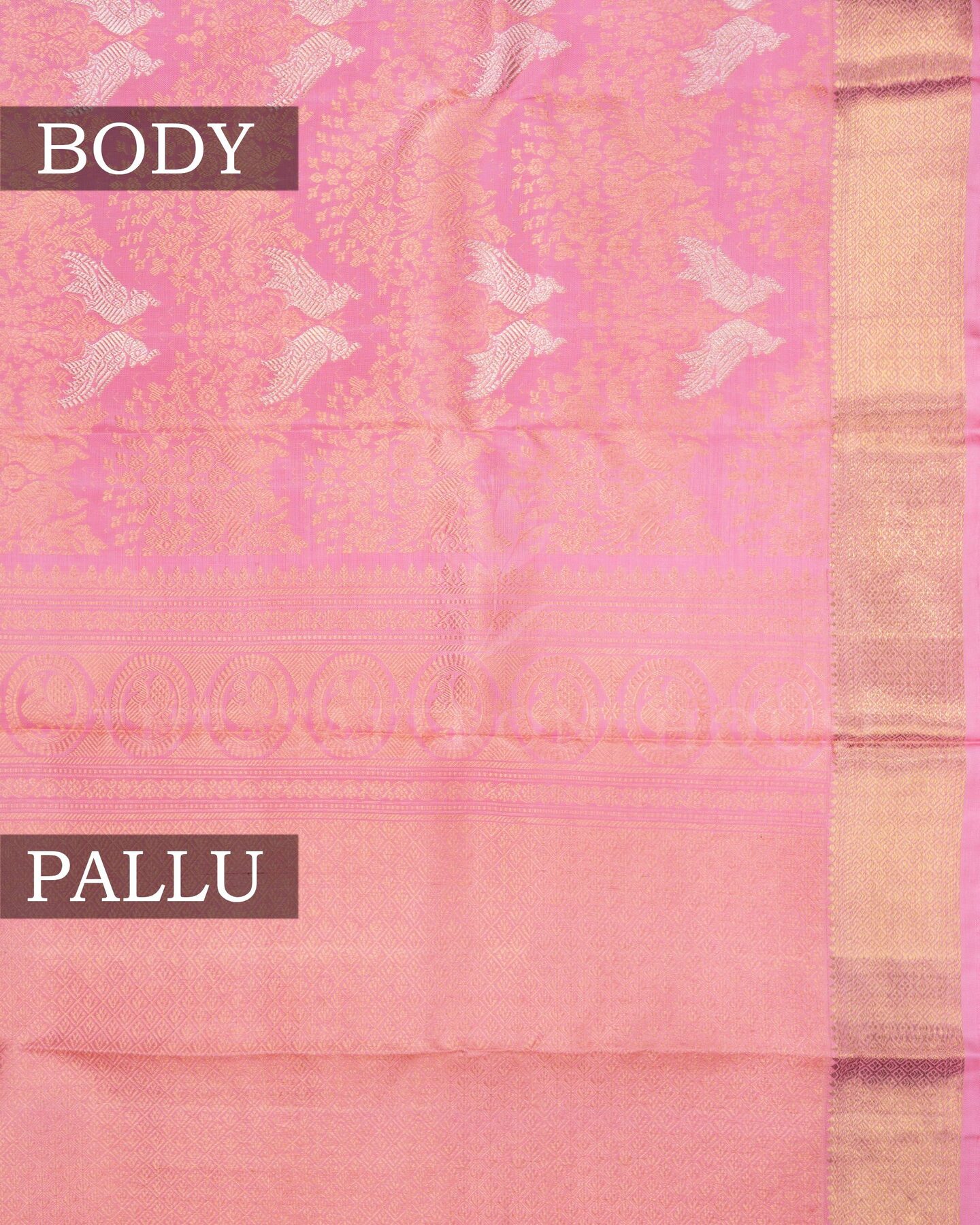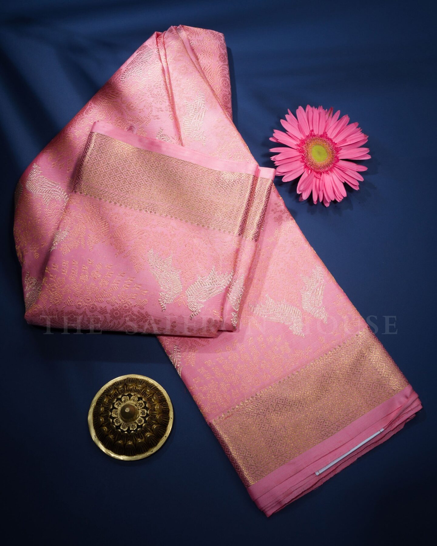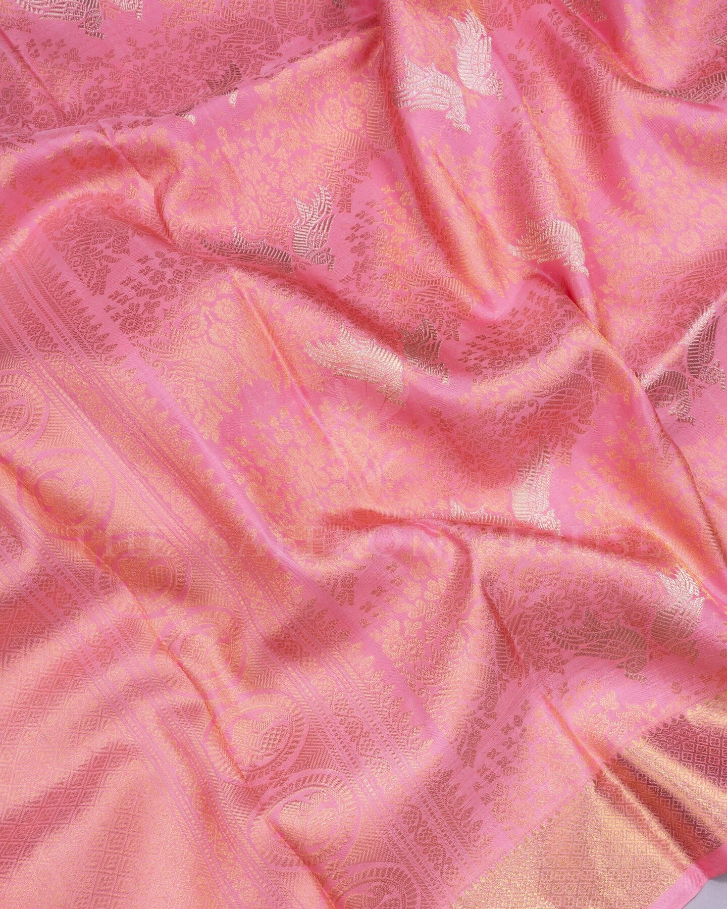 Some colours hold memory. Baby Pink — delicate as the first blush of morning light — becomes something entirely new when woven into pure Kanjivaram silk. This Brocade saree carries that colour with quiet authority and grace.