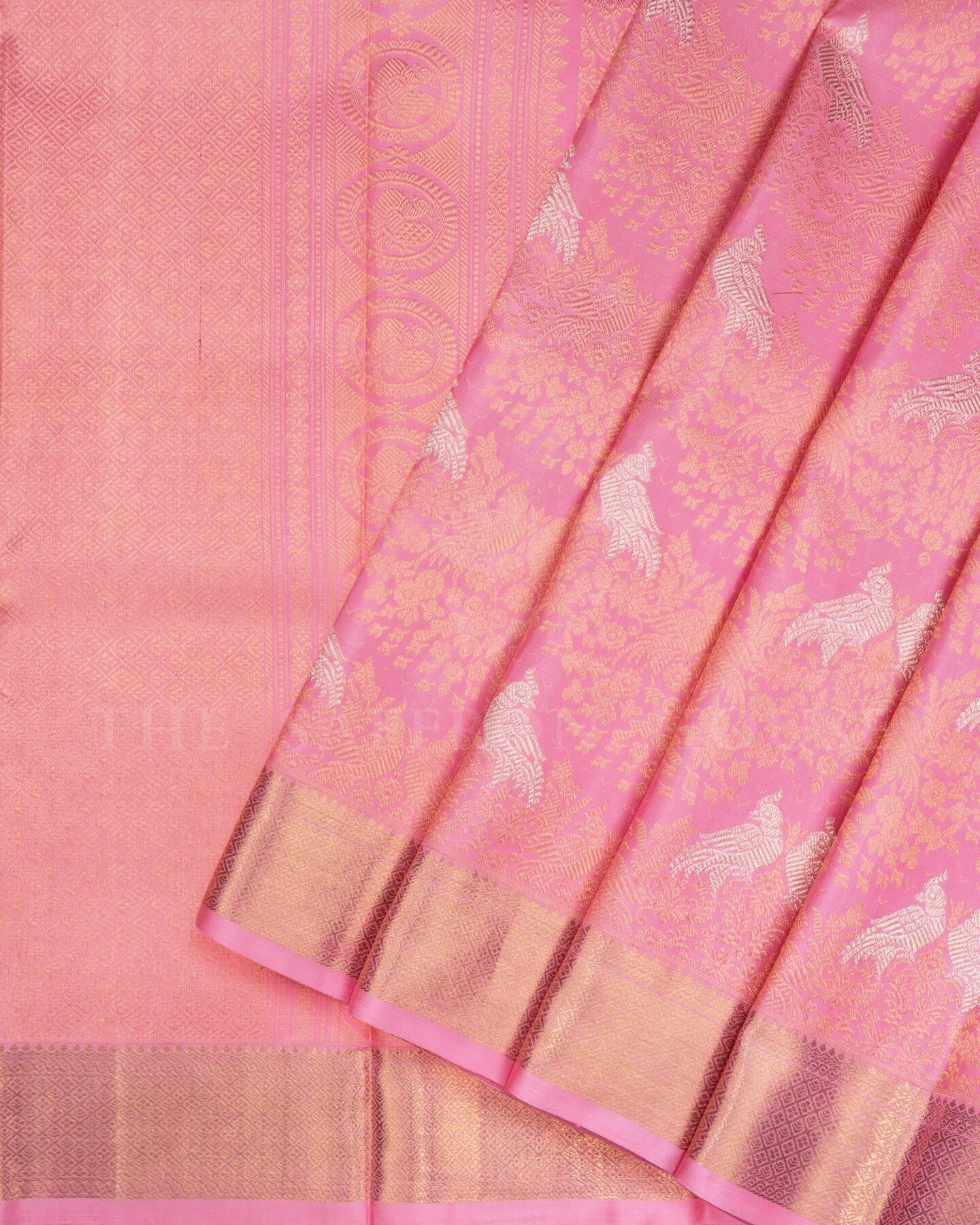 The body is adorned with bird with jal design silver & gold zari brocade, each thread placed with precision and purpose. The self border frames the drape with confident definition, while silver and gold zari runs through the weave, catching light the way temple gold does — slowly, deeply, unforgettably.