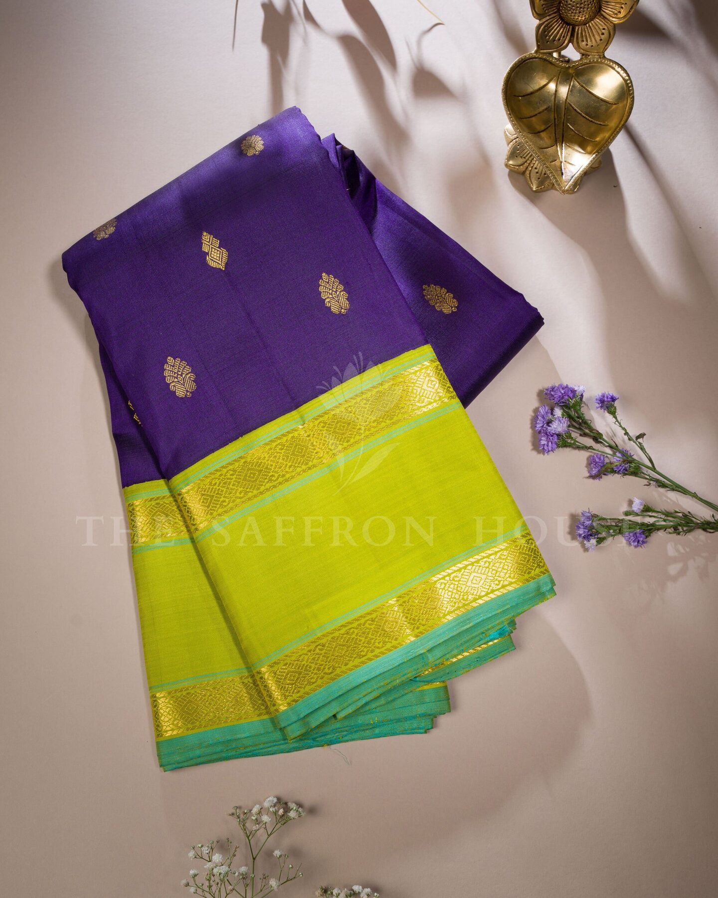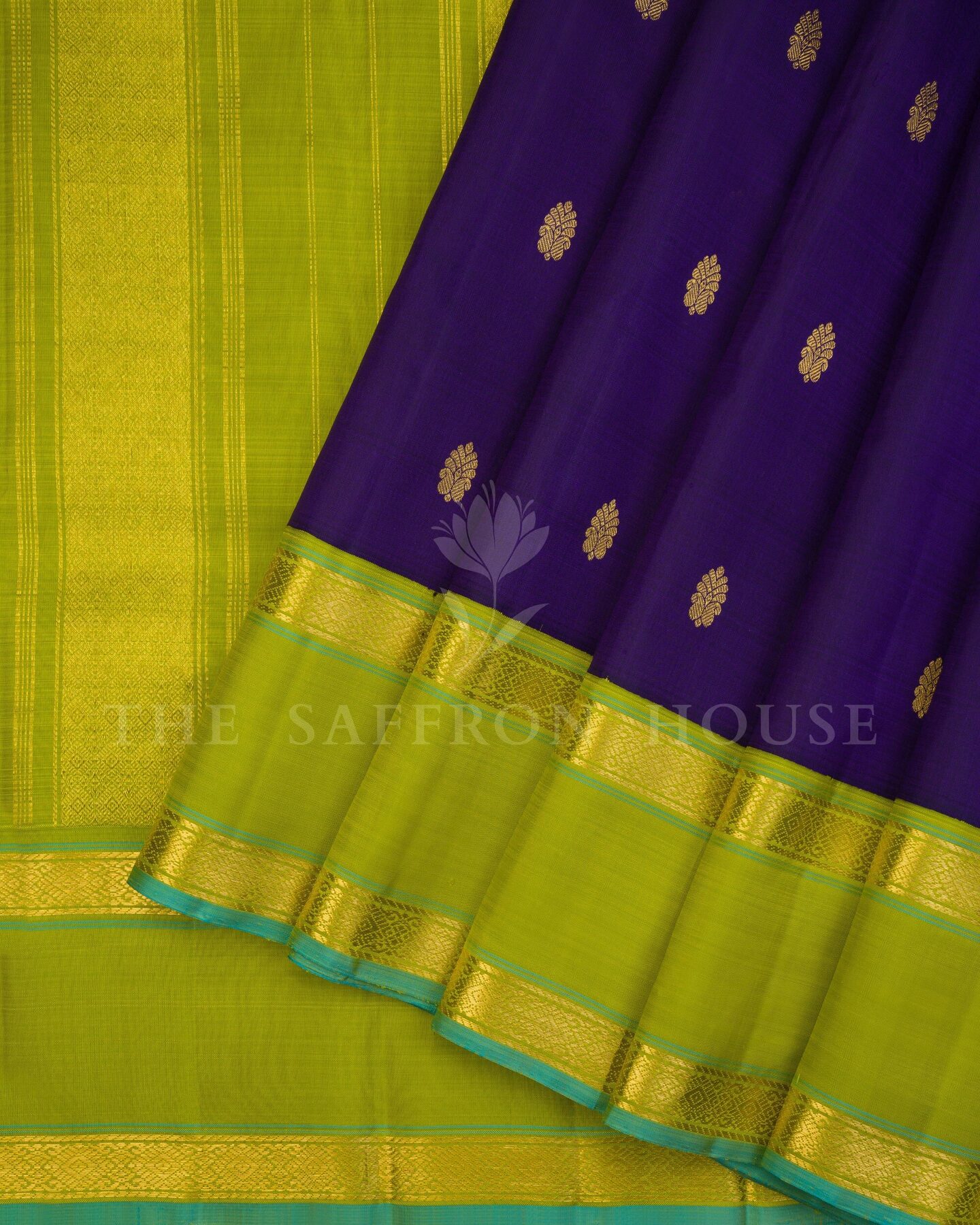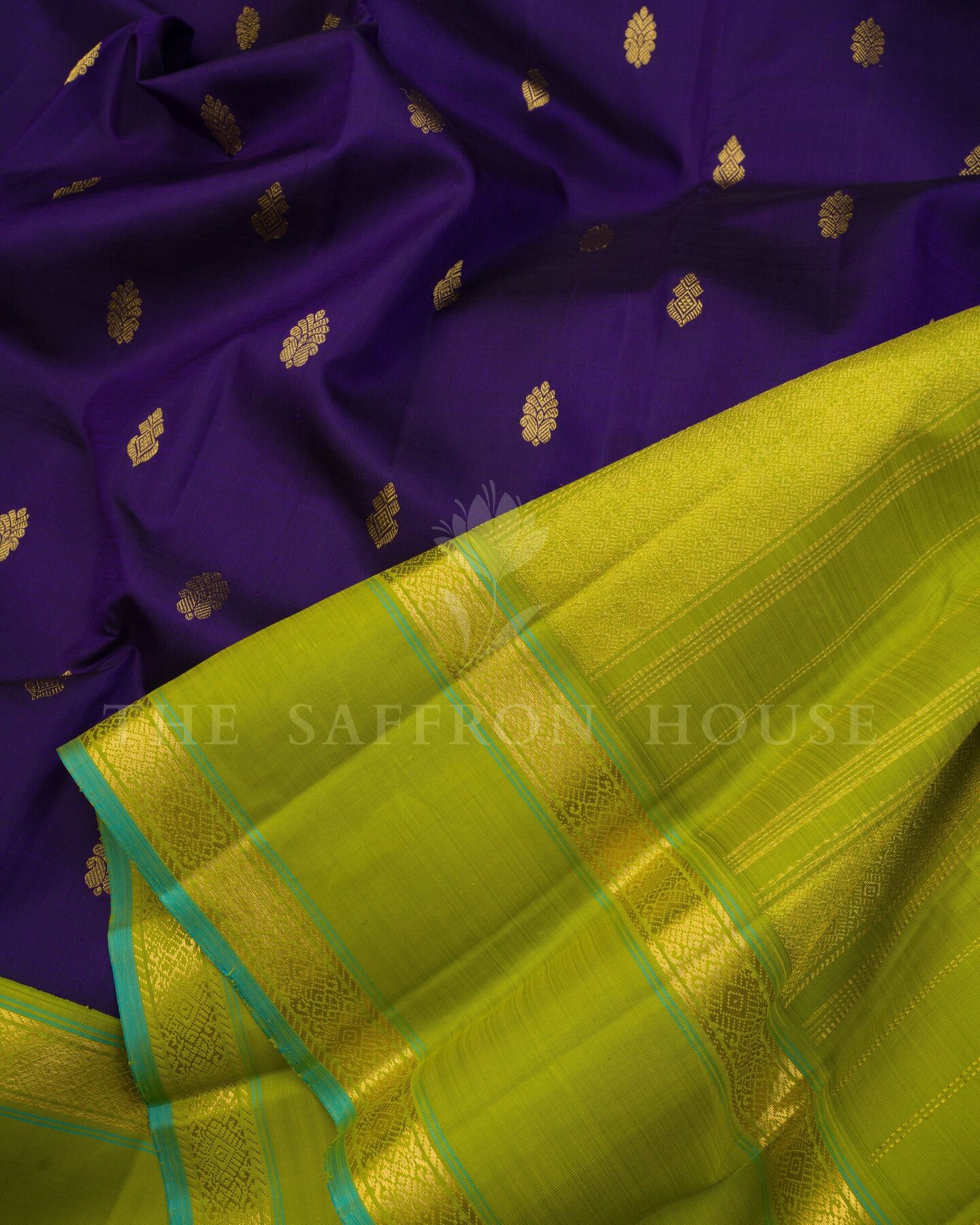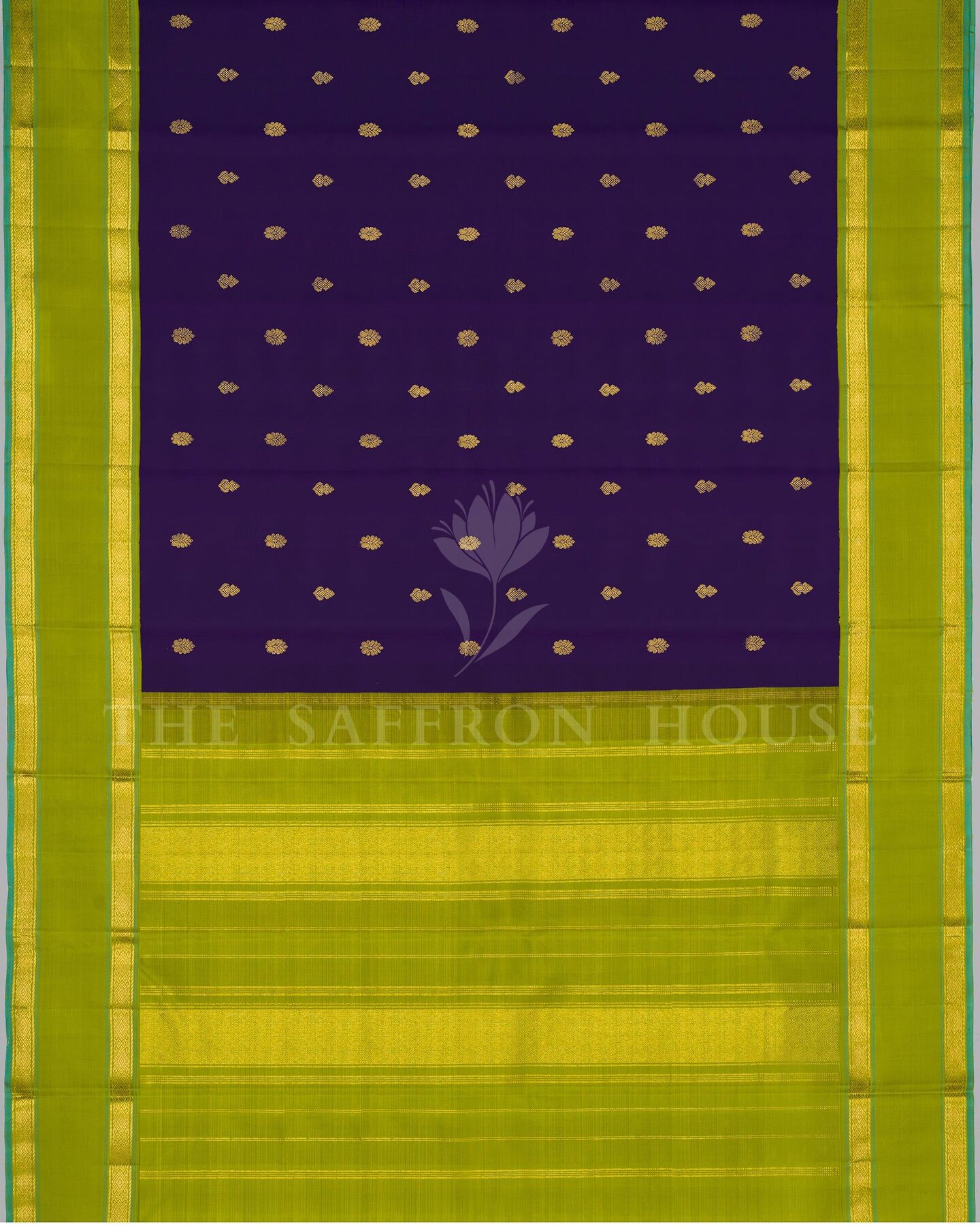 कंट्रास्ट और शिल्प कौशल का एक जीवंत उत्सव, यह कांचीवरम सिल्क साड़ी गहरे बैंगनी रंग के शरीर पर सुनहरे फूलों वाली ज़री के बूटों से सजी है। तोते के हरे रंग का रेट्टापेट बॉर्डर—जिस पर समृद्ध सुनहरी ज़री की दो रेखाएँ हैं—एक आधुनिक मोड़ के लिए एक सूक्ष्म फ़िरोज़ा किनारा के साथ समाप्त होता है। इसका पल्लू खड़ी ज़री की धारियों से चमकता है, जो इसके ड्रेप में गहराई और बनावट जोड़ता है। इस साड़ी के साथ मैचिंग बॉर्डर वाला एक सादा तोते के हरे रंग का ब्लाउज़ है।