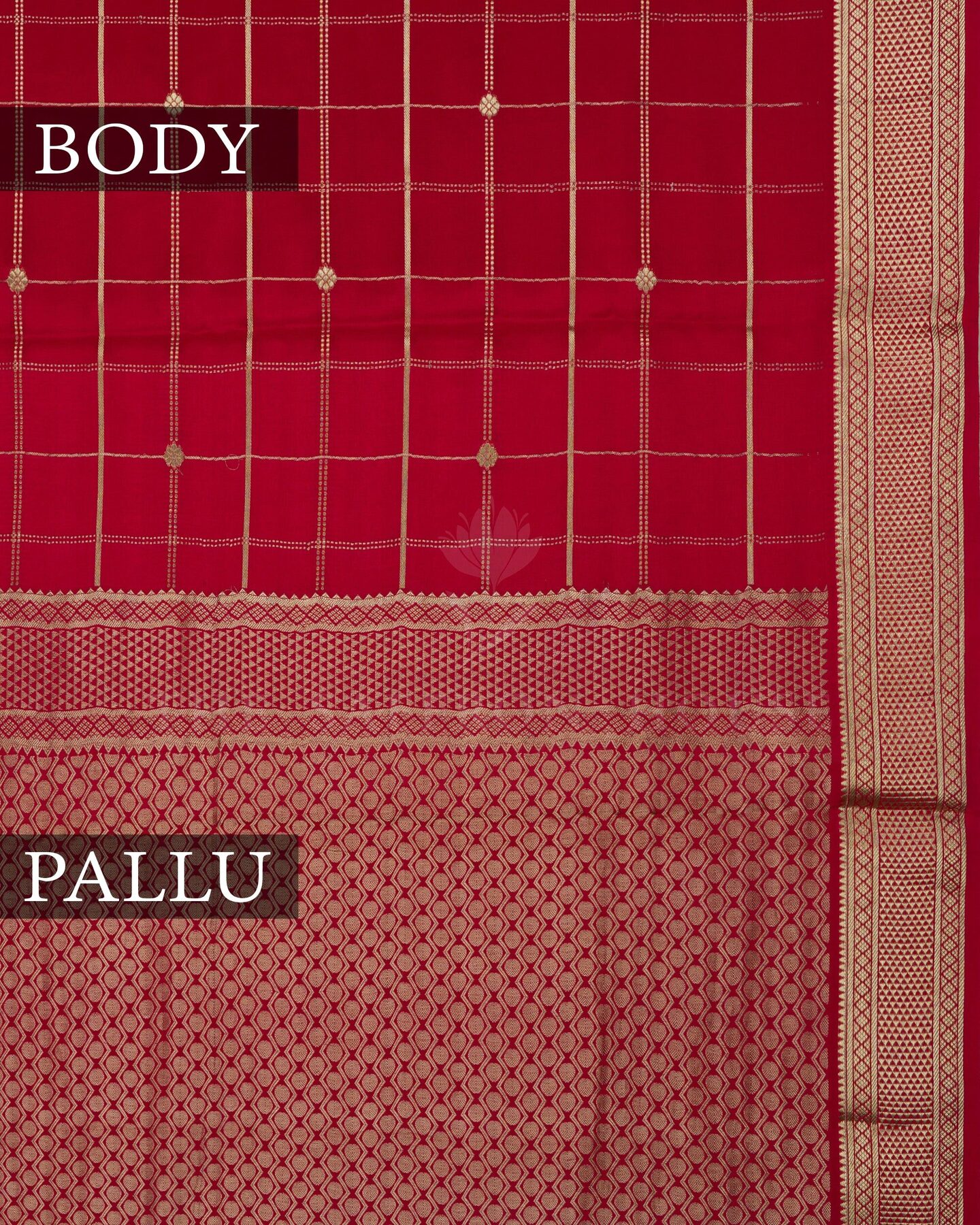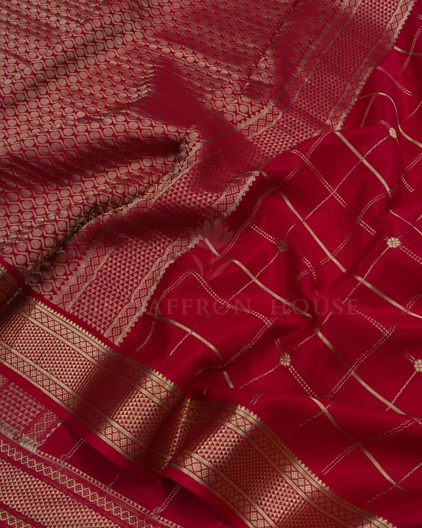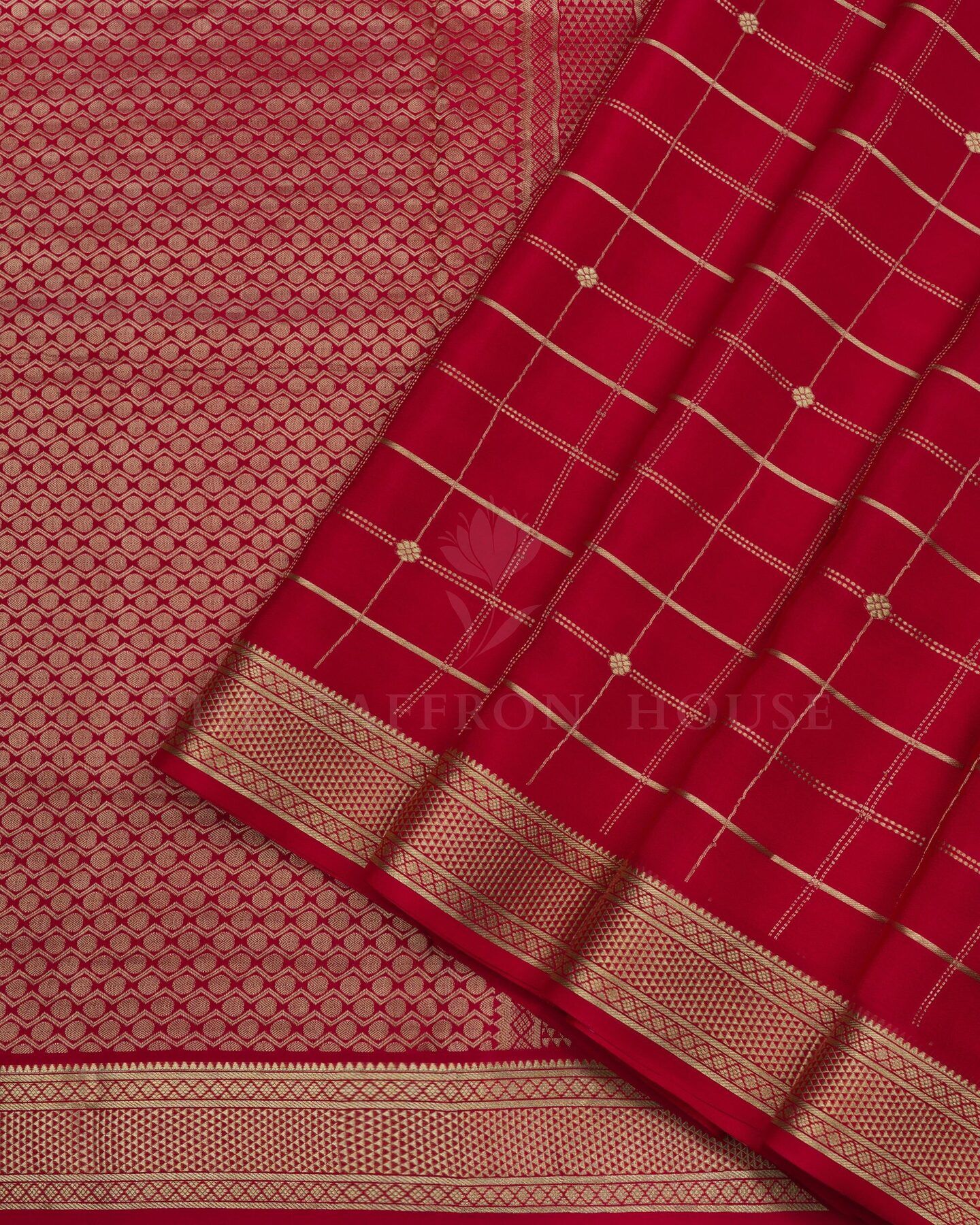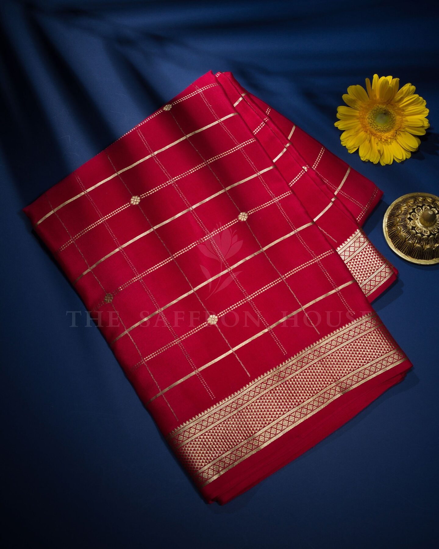 The body is adorned with golden checked pattern with small floral buttas, each thread placed with precision and purpose. The deep red border frames the drape with confident definition, while gold zari runs through the weave, catching light the way temple gold does — slowly, deeply, unforgettably.