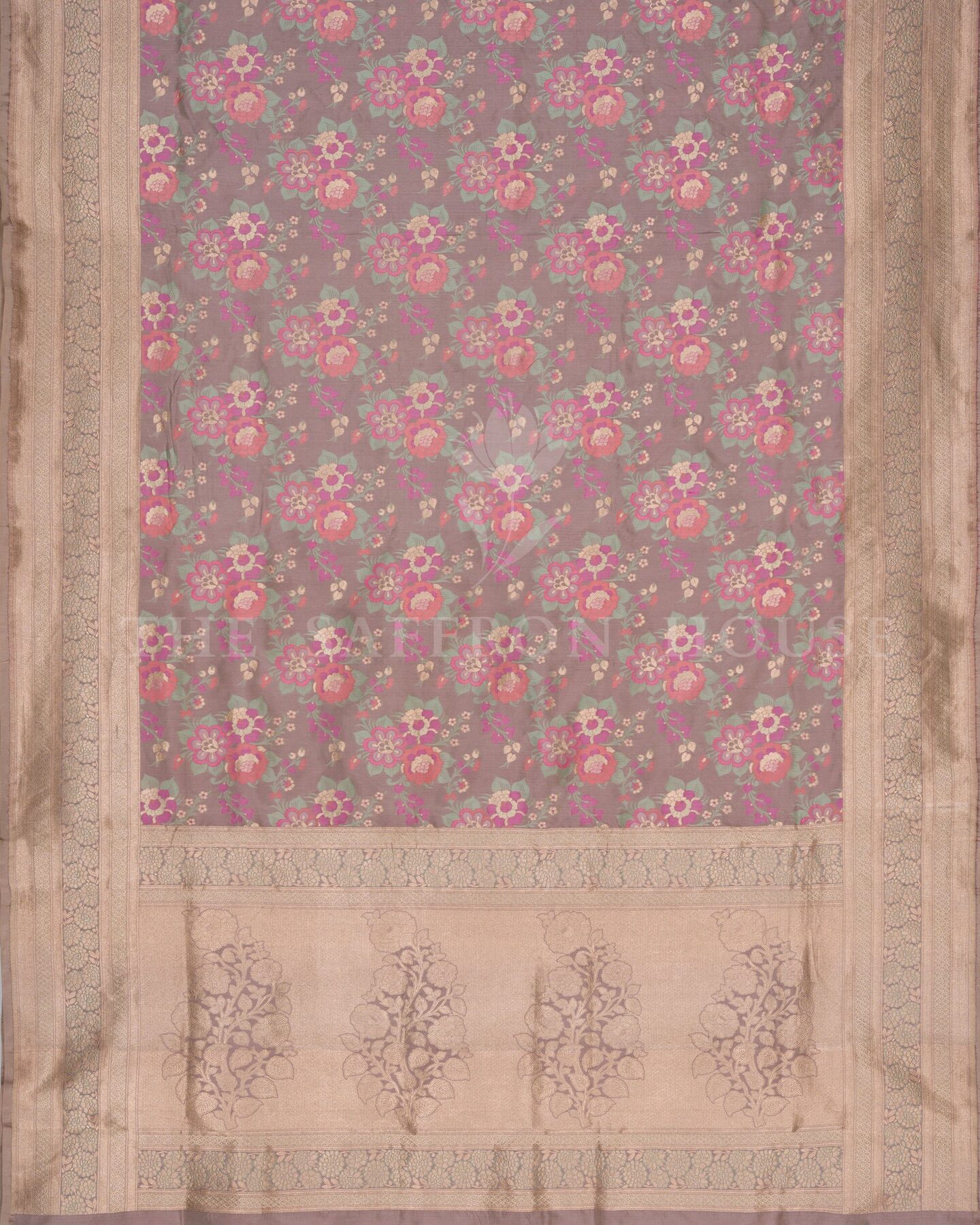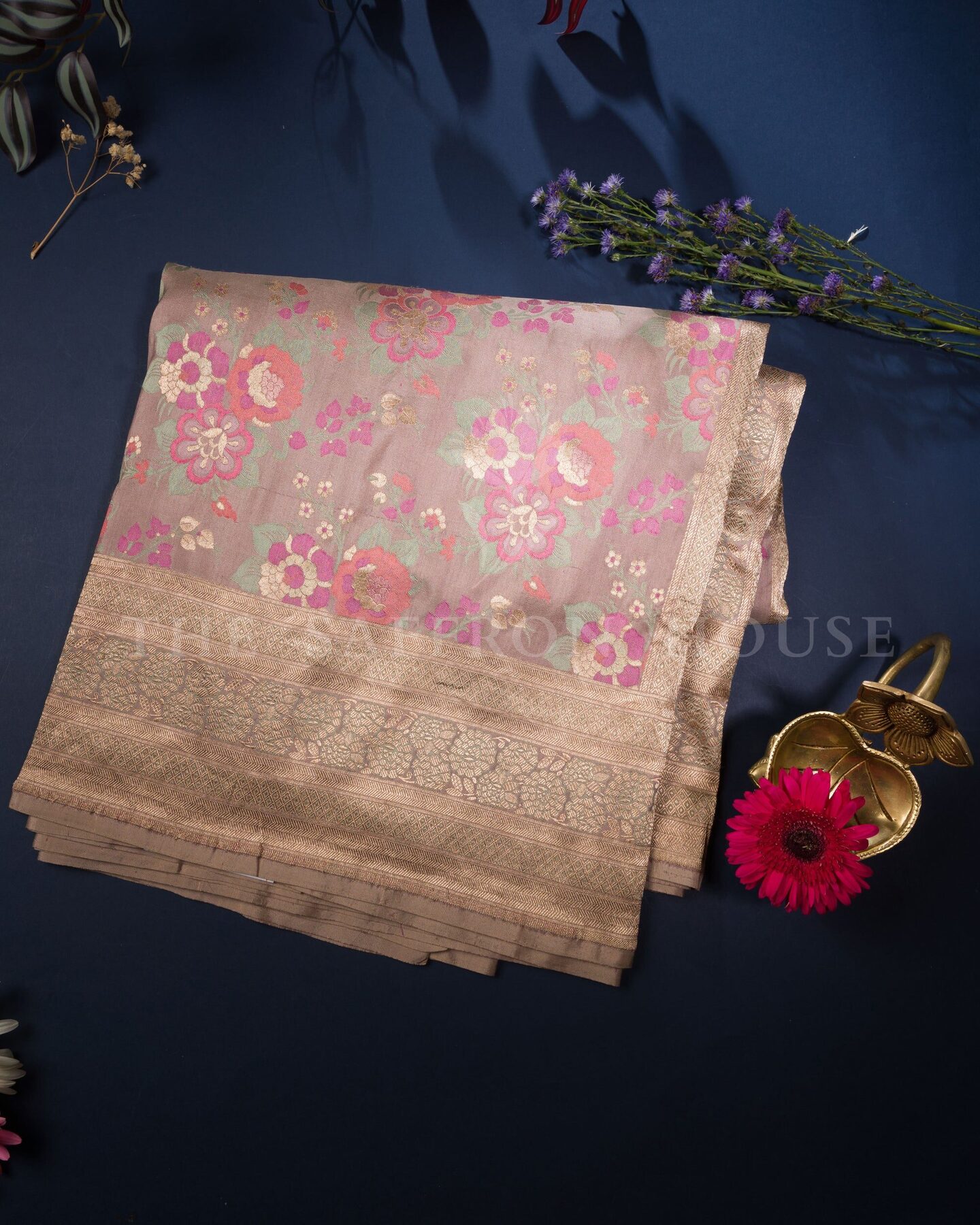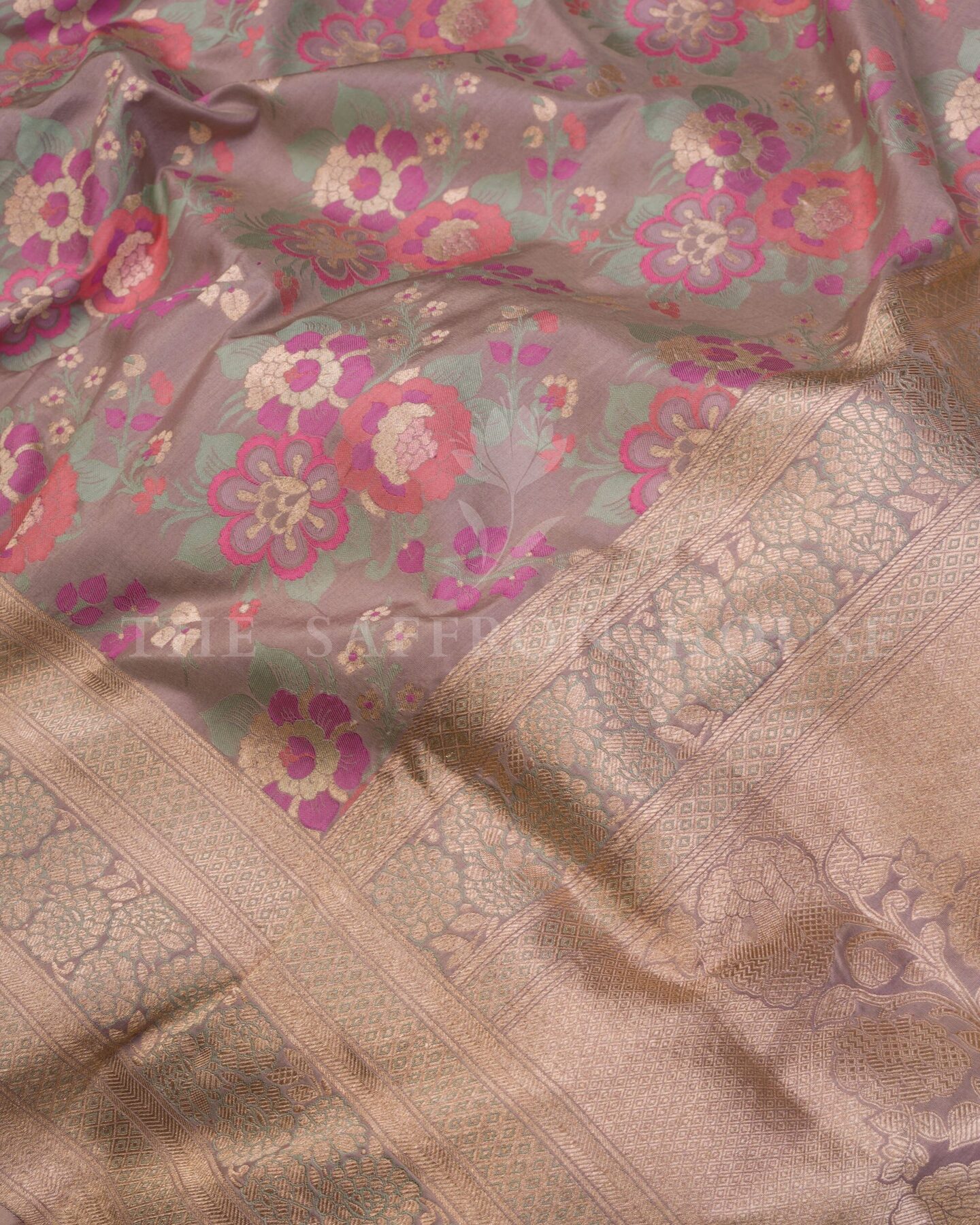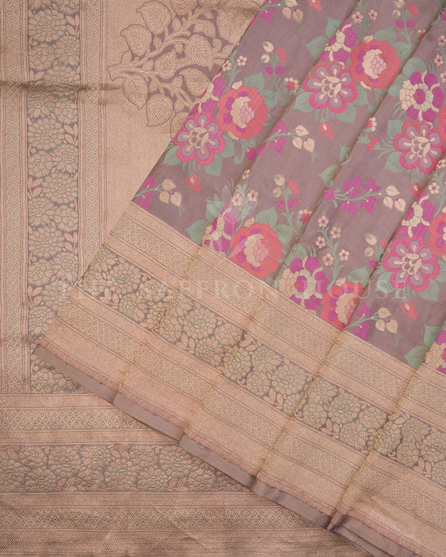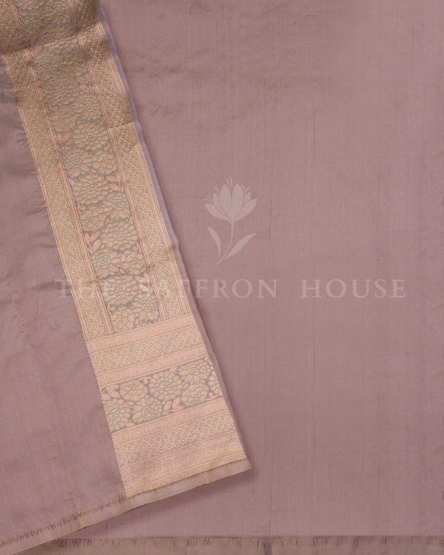 शालीनता और भव्यता का एक काव्यात्मक मिश्रण, यह धूल भरे बैंगनी रंग की कटान सिल्क साड़ी, बनारस बुनाई समूह की उत्कृष्ट कड़वा तकनीक का उपयोग करके हाथ से बुनी गई है। इसका पूरा भाग गुलाबी, आड़ू और हरे रंग के शानदार रंगों में बड़े आकार के पुष्प रूपांकनों से खिलता है, जो मुगल उद्यानों से प्रेरित हैं। साड़ी की भव्यता इसके भव्य सुनहरे ज़री के बॉर्डर और पल्लू से और भी बढ़ जाती है, जिसमें जटिल जंगला-शैली के पुष्प बेलें हैं। यह एक उत्कृष्ट कृति है जो दिन की शादियों से लेकर शाम की पार्टियों तक सहजता से ढल जाती है, यह एक आधुनिक विरासत है जिसे समय के साथ टिकने के लिए तैयार किया गया है।