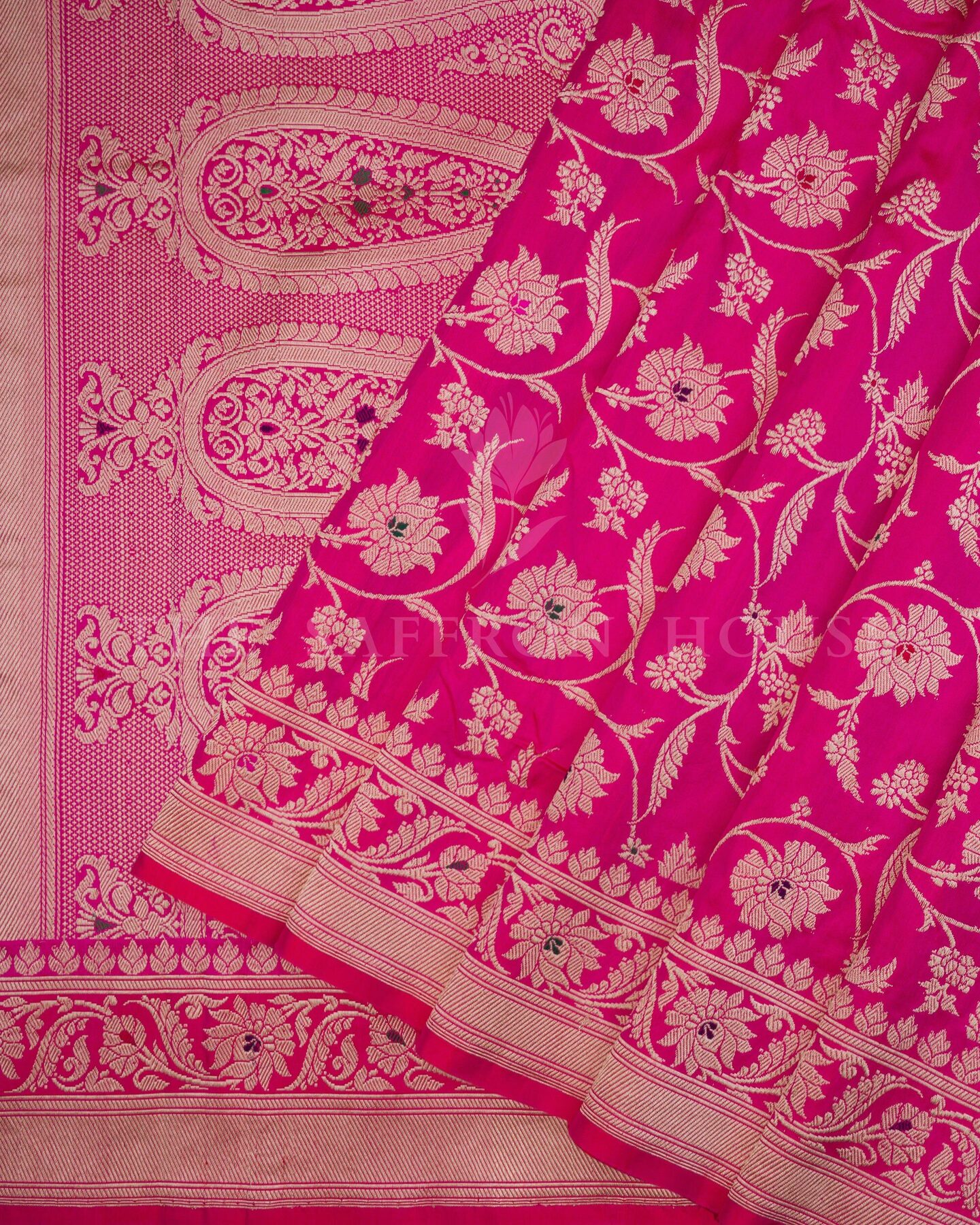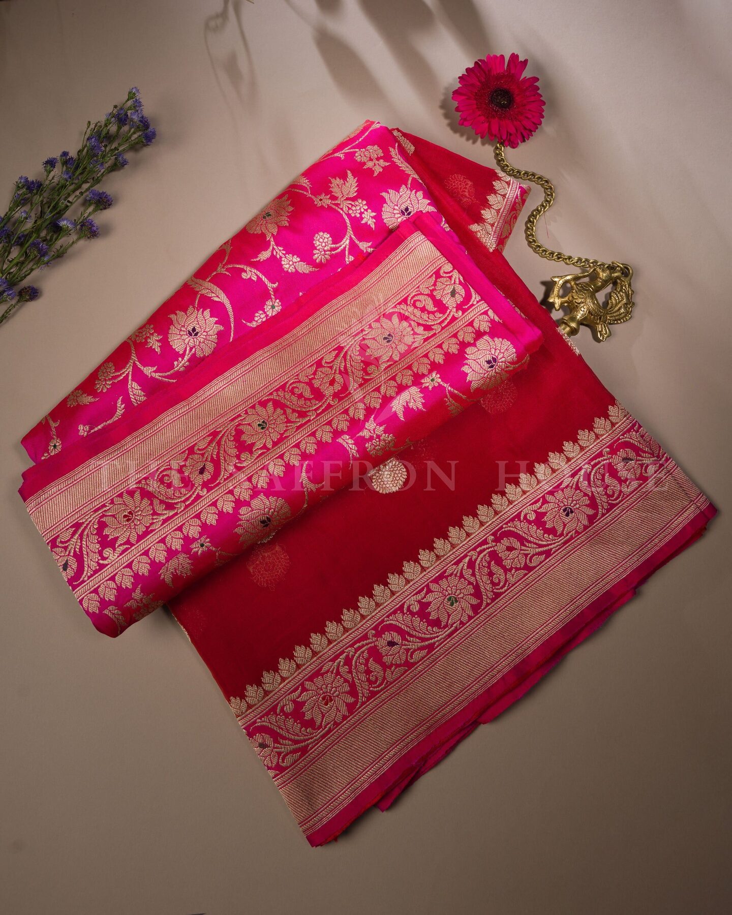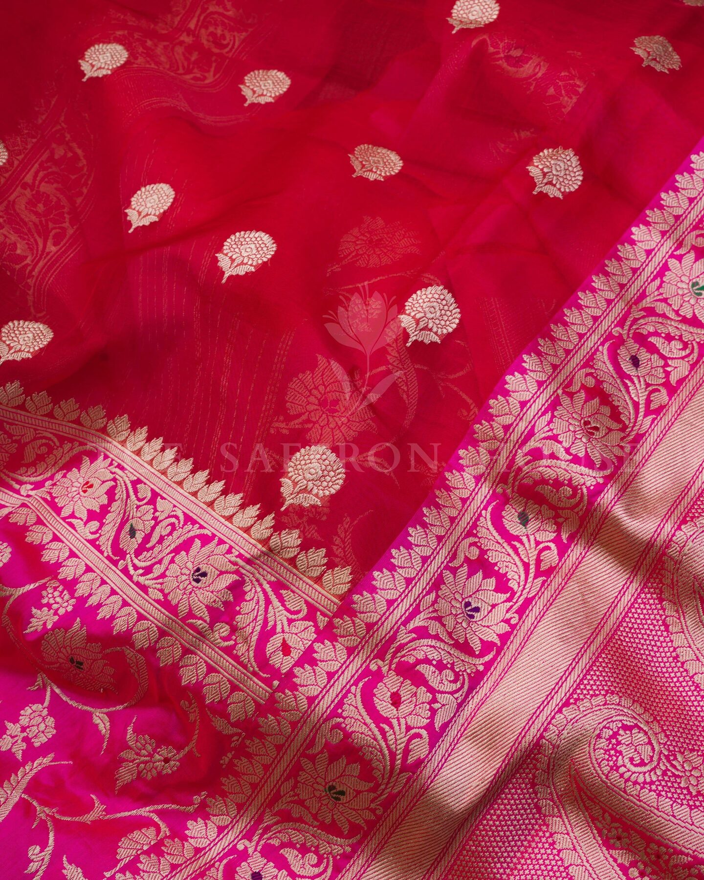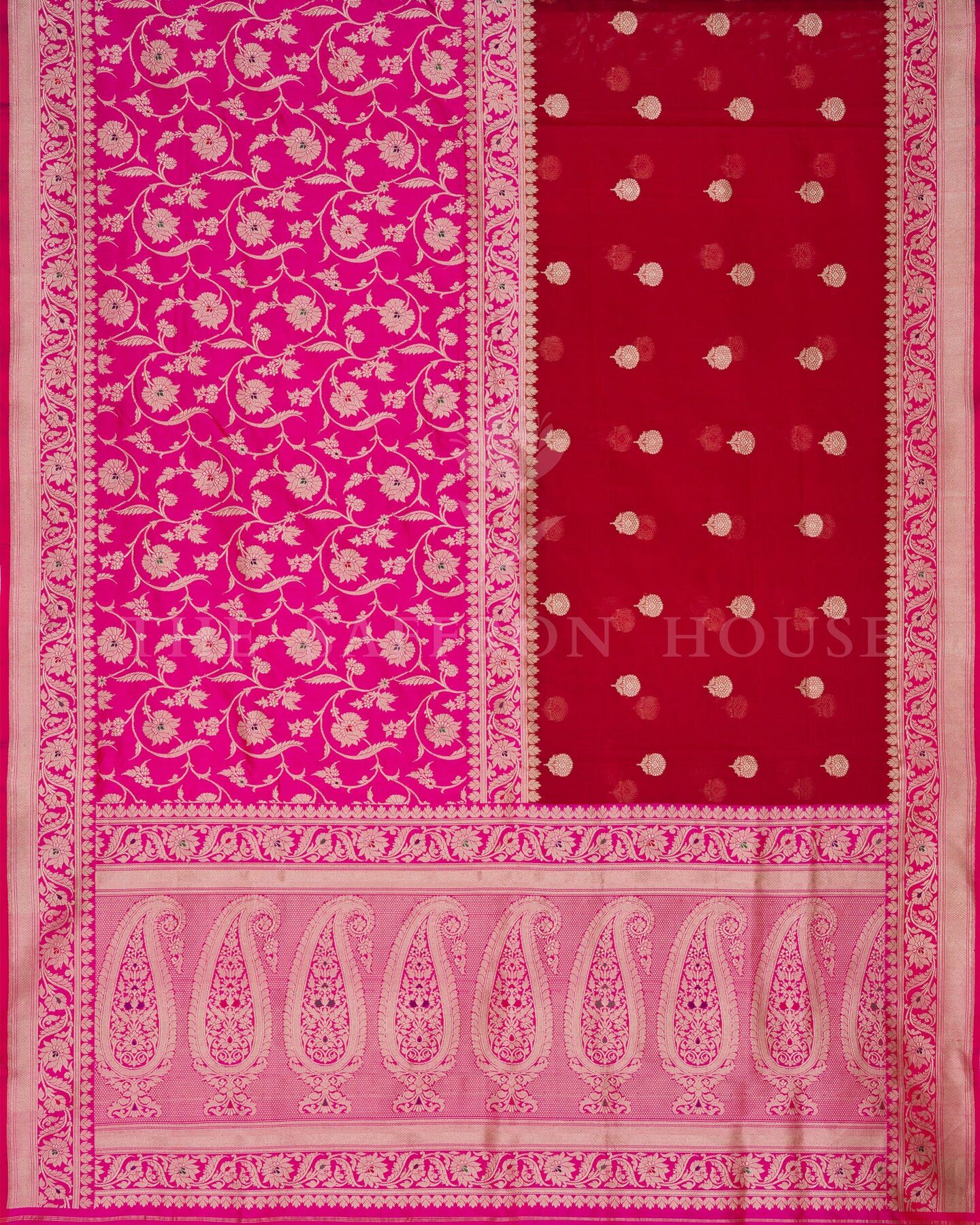 बोल्ड और विशिष्ट, यह बनारसी साड़ी दो शानदार बनावटों—शीयर कोरा (ऑर्गेंज़ा) और समृद्ध रेशम—को एक आकर्षक रूप में प्रस्तुत करती है। इसके एक हिस्से में गहरे लाल कोरा रेशम को सोने की ज़री वाली फूलों की बूटियों से सजाया गया है, जबकि दूसरे हिस्से में रानी गुलाबी रेशम है जिसे फूलों की लताओं से बारीकी से बुना गया है और पल्लू पर पैस्ले डिज़ाइनों की एक शाही पंक्ति है। पूरी तरह से बारीक बनारसी बॉर्डर से सजी यह साड़ी दुल्हन के साज-सज्जा, उत्सव की शामों या किसी भी समारोह में एक नए अंदाज़ में शान दिखाने के लिए एकदम सही है।