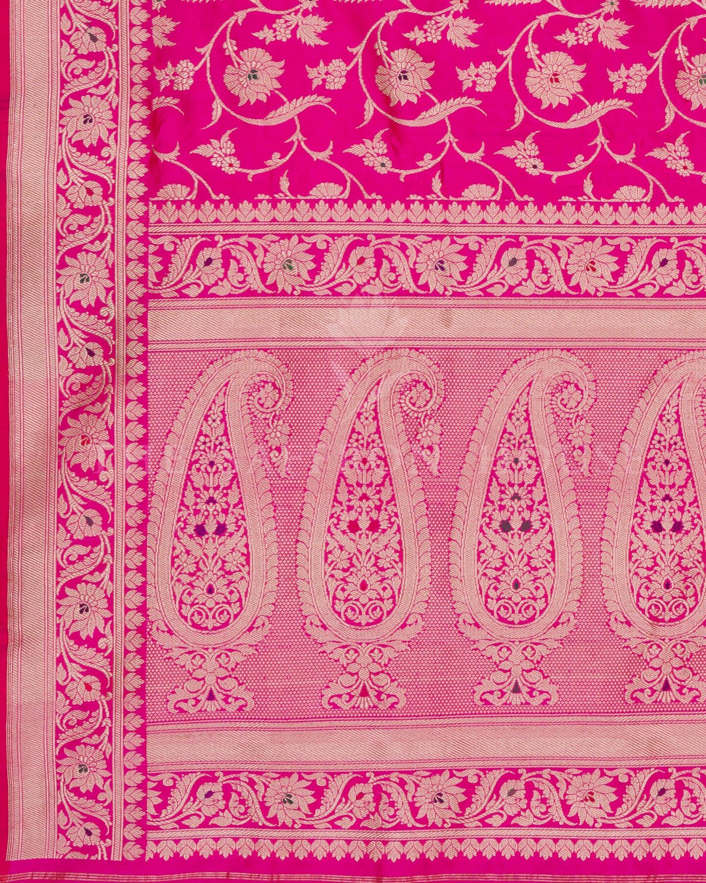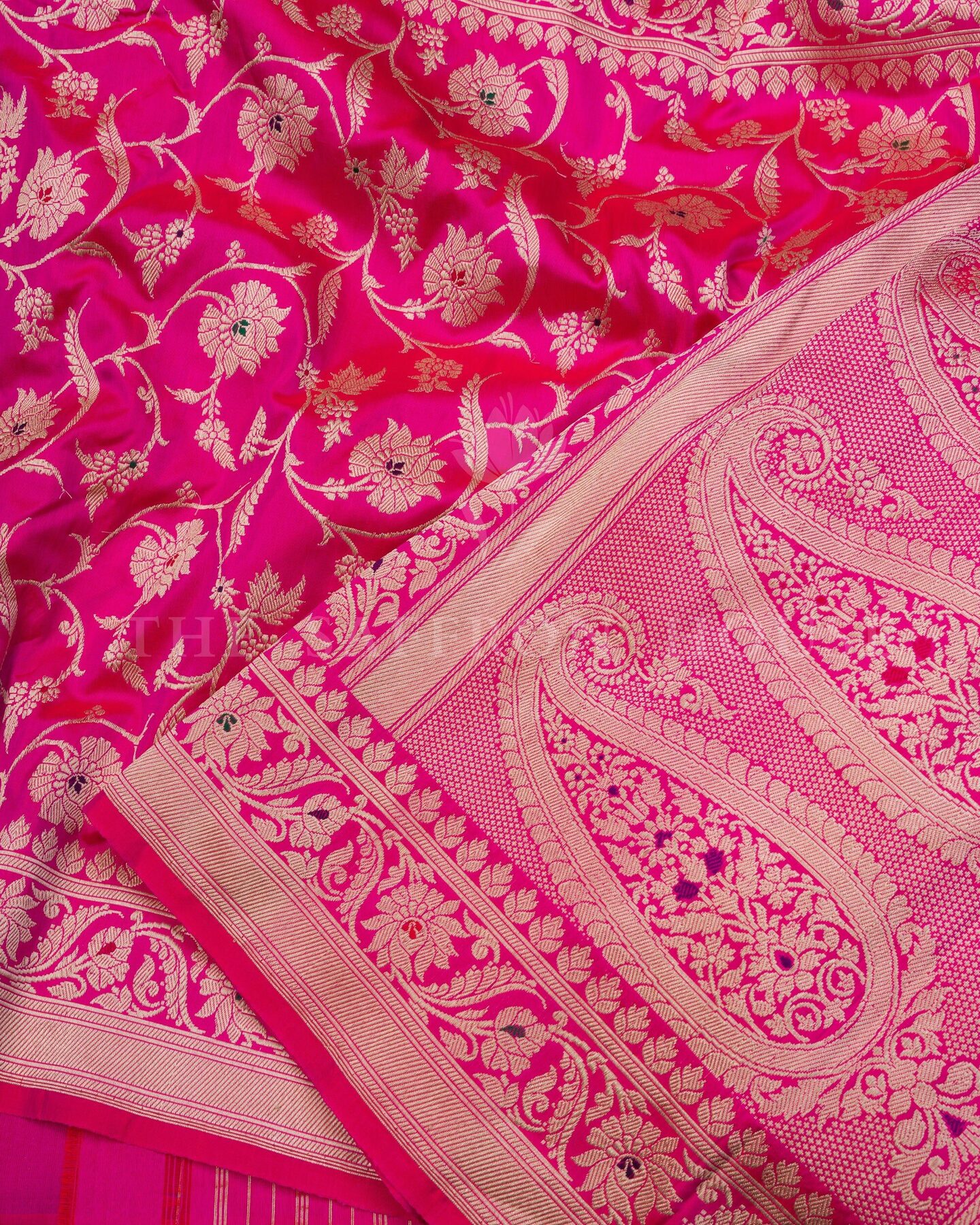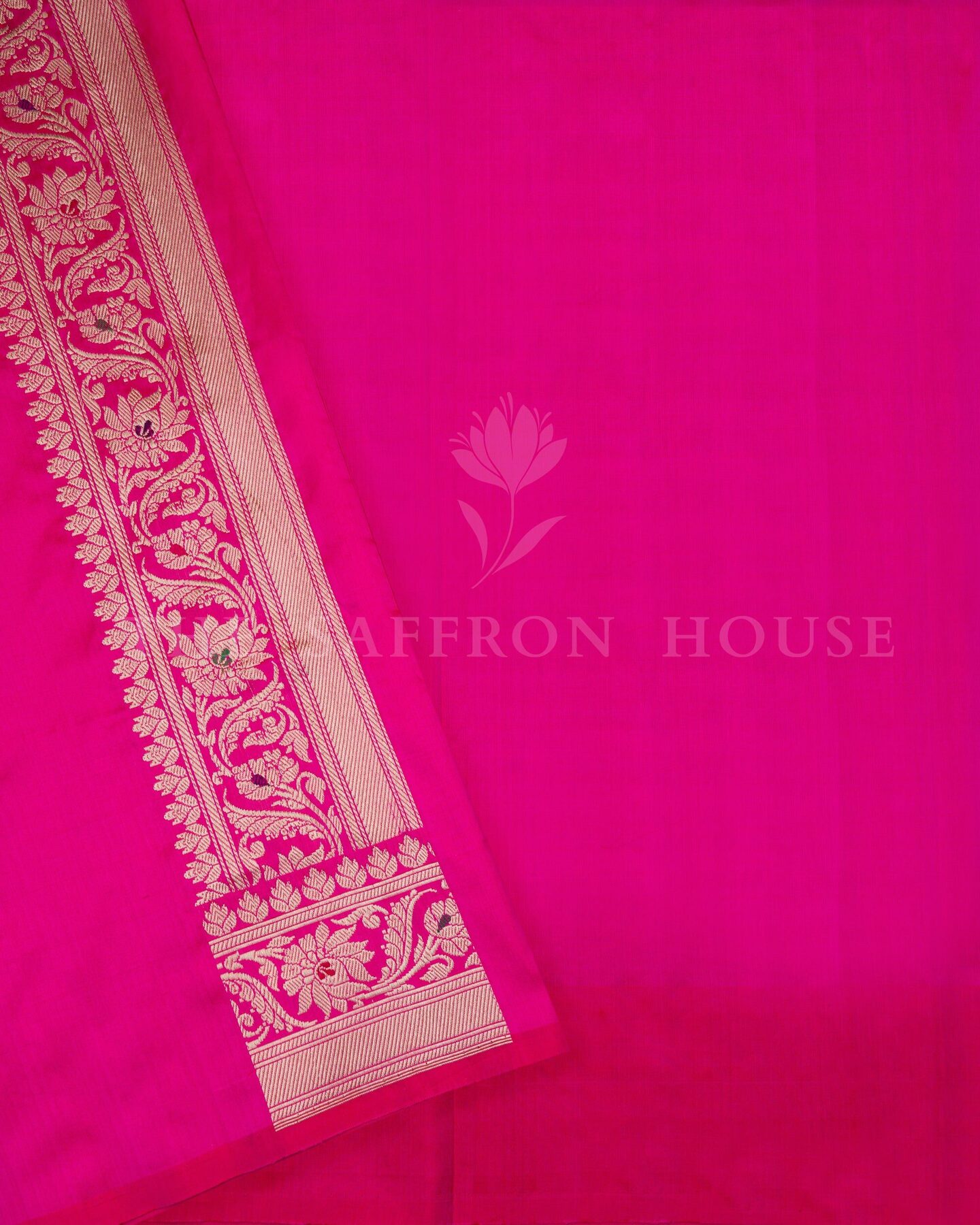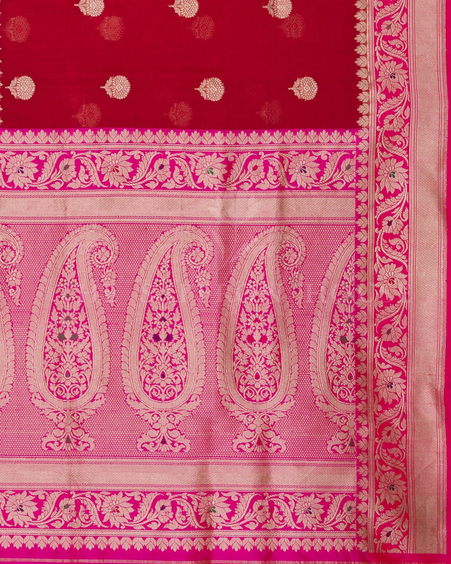 बोल्ड और विशिष्ट, यह बनारसी साड़ी दो शानदार बनावटों—शीयर कोरा (ऑर्गेंज़ा) और समृद्ध रेशम—को एक आकर्षक रूप में प्रस्तुत करती है। इसके एक हिस्से में गहरे लाल कोरा रेशम को सोने की ज़री वाली फूलों की बूटियों से सजाया गया है, जबकि दूसरे हिस्से में रानी गुलाबी रेशम है जिसे फूलों की लताओं से बारीकी से बुना गया है और पल्लू पर पैस्ले डिज़ाइनों की एक शाही पंक्ति है। पूरी तरह से बारीक बनारसी बॉर्डर से सजी यह साड़ी दुल्हन के साज-सज्जा, उत्सव की शामों या किसी भी समारोह में एक नए अंदाज़ में शान दिखाने के लिए एकदम सही है।