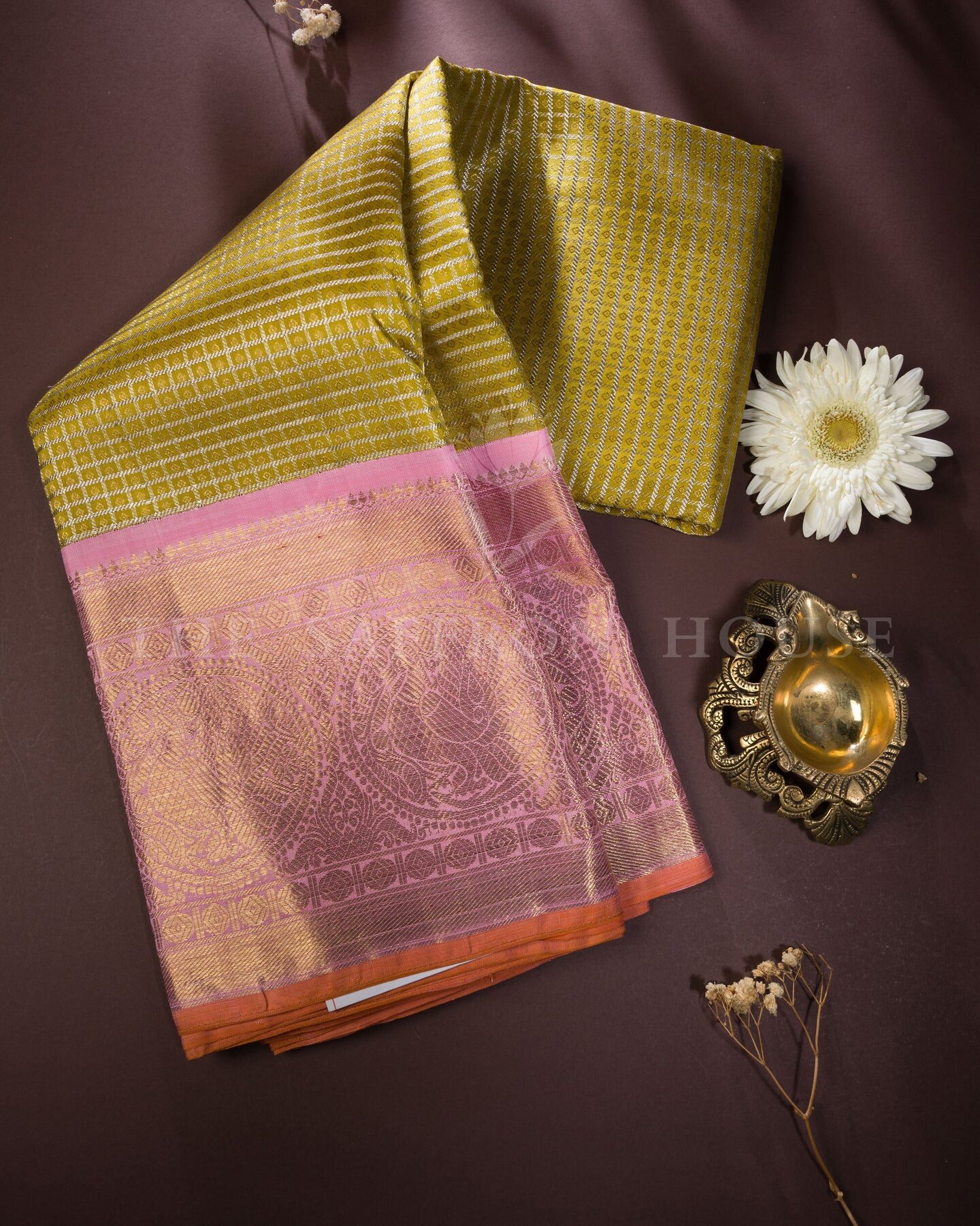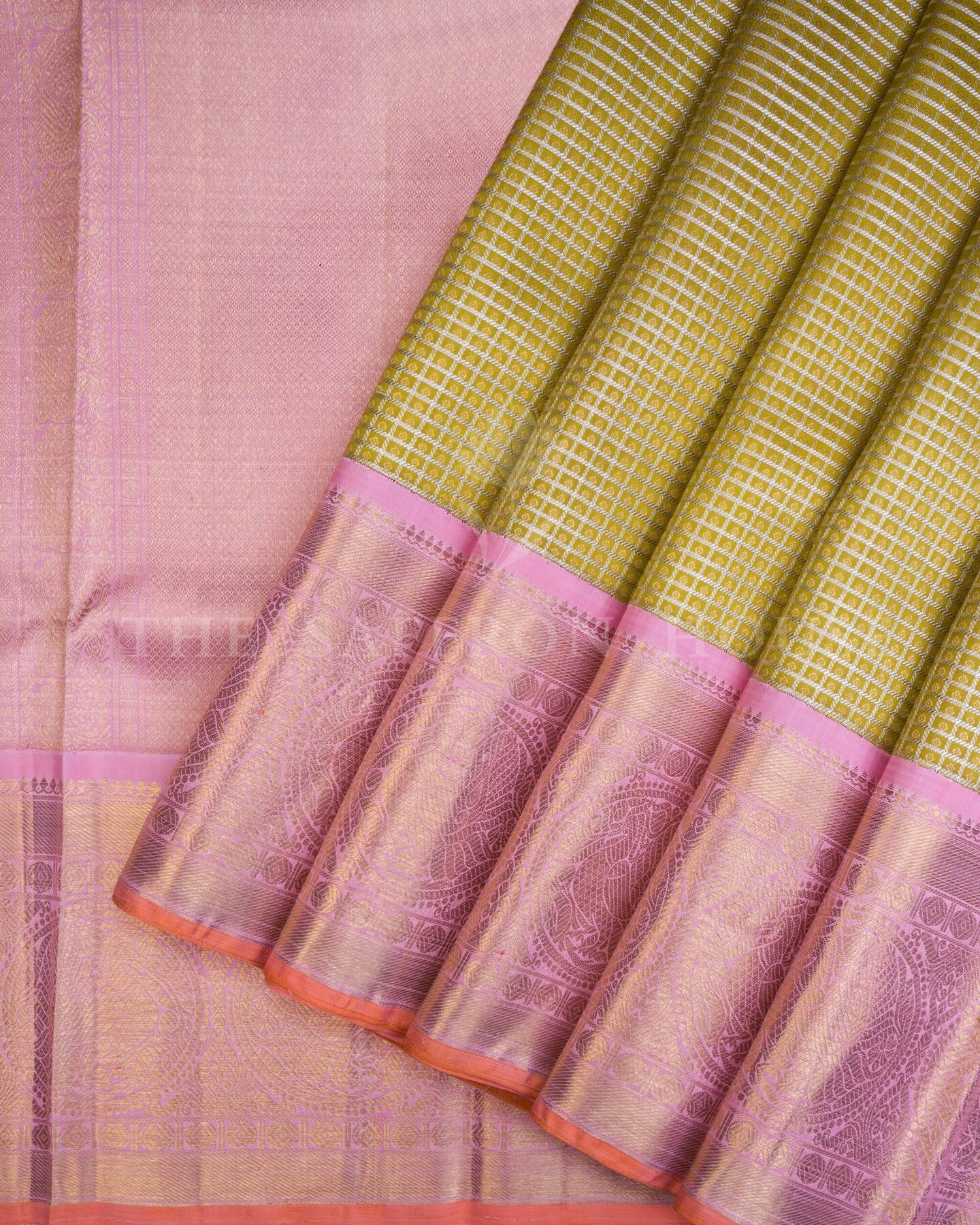 नाज़ुक चांदी की ज़री के चेक्स से बुनी हुई चमकदार तोते जैसी हरी बॉडी वाली यह शुद्ध ज़री वाली कांचीपुरम सिल्क साड़ी, हल्के कमल के गुलाबी बॉर्डर और पल्लू से और भी खूबसूरत हो जाती है। पल्लू में राजसी अन्नम (आकाशीय हंस) की आकृतियाँ दिखाई देती हैं, जो पारंपरिक रुद्राक्ष पैटर्न और जटिल मंदिर बॉर्डर से पूरित हैं—हर धागा दक्षिण भारतीय मंदिर कला को श्रद्धांजलि देता है। कपड़ा: प्रमाणित असली ज़री के साथ शुद्ध रेशम रंग: गुलाबी के साथ तोता हरा बॉडी: चांदी की ज़री में कट्टम (चैकर्ड) बुनाई सीमा: रुद्राक्ष विवरण के साथ मंदिर कोरवई पल्लू: पारंपरिक ज़री के काम के साथ हाथ से बुने हुए अन्नम रूपांकन अनुभव: भव्य, विरासत-योग्य आवरण उपयुक्त: विवाह, पारंपरिक समारोह और विशेष उपहार देने के लिए।