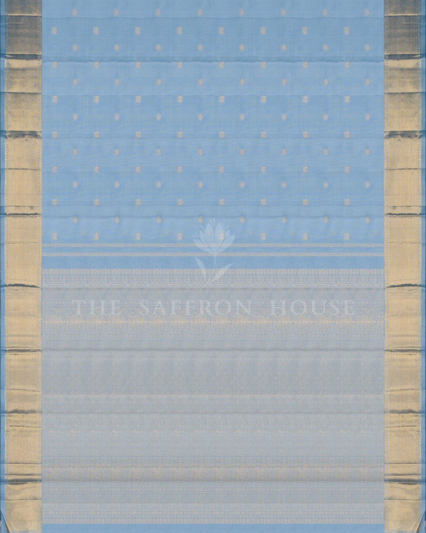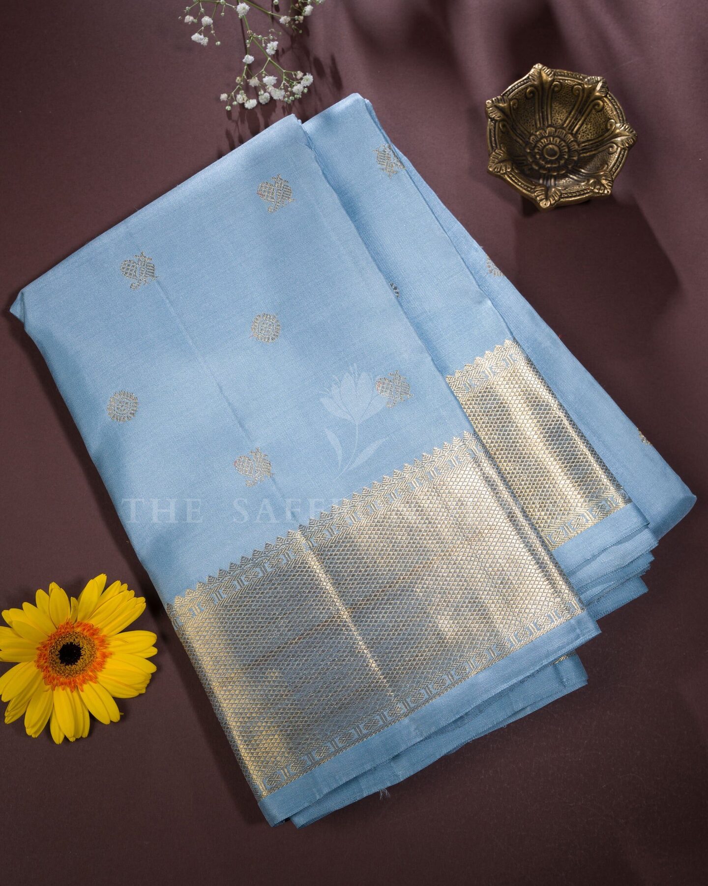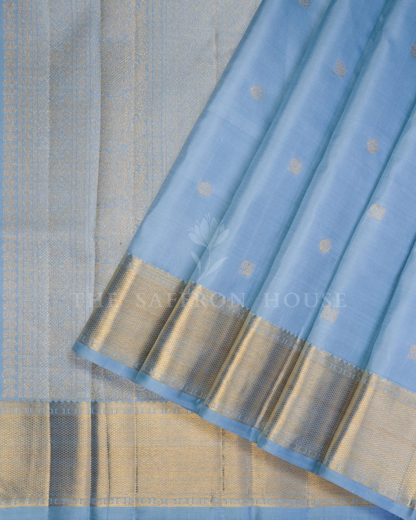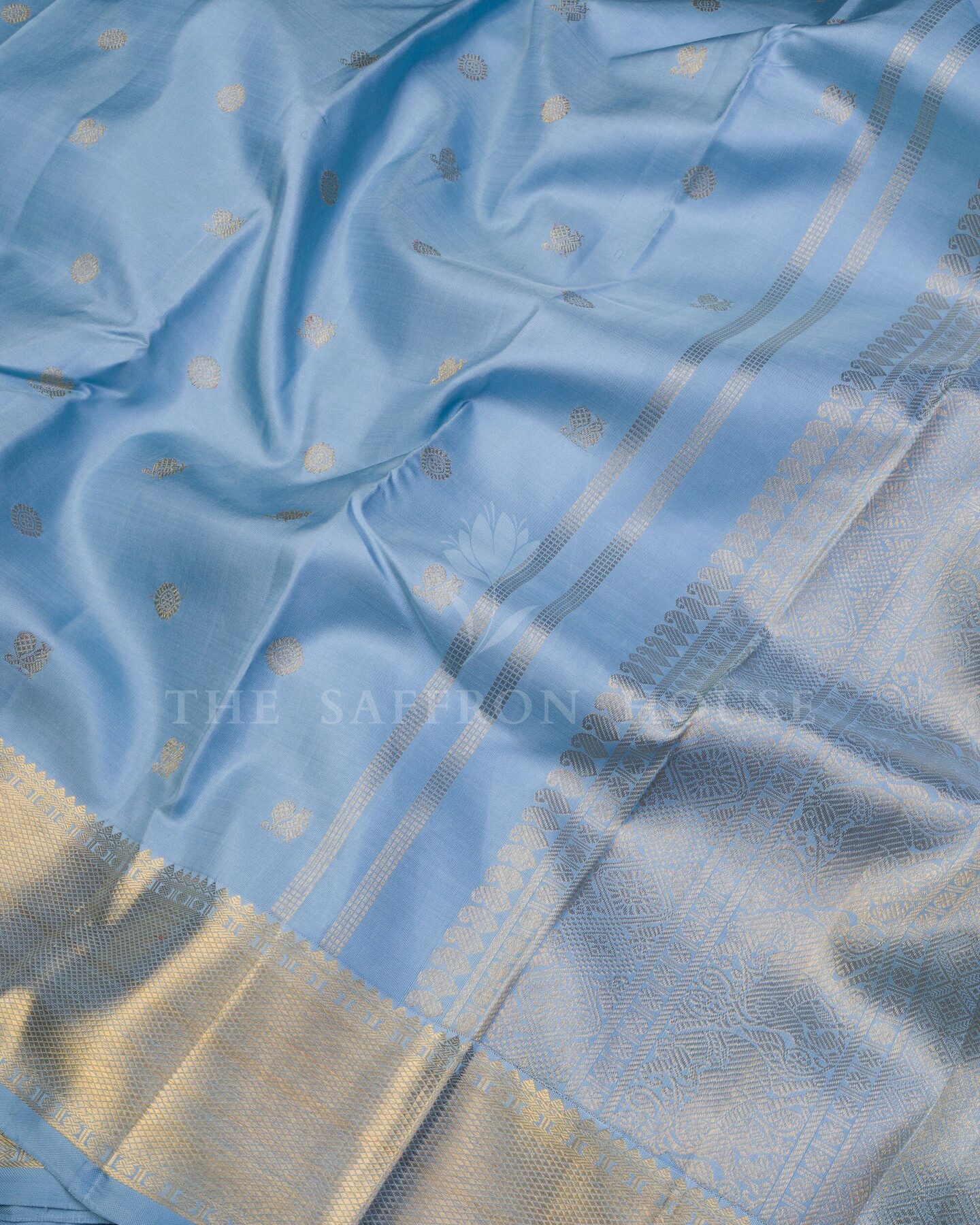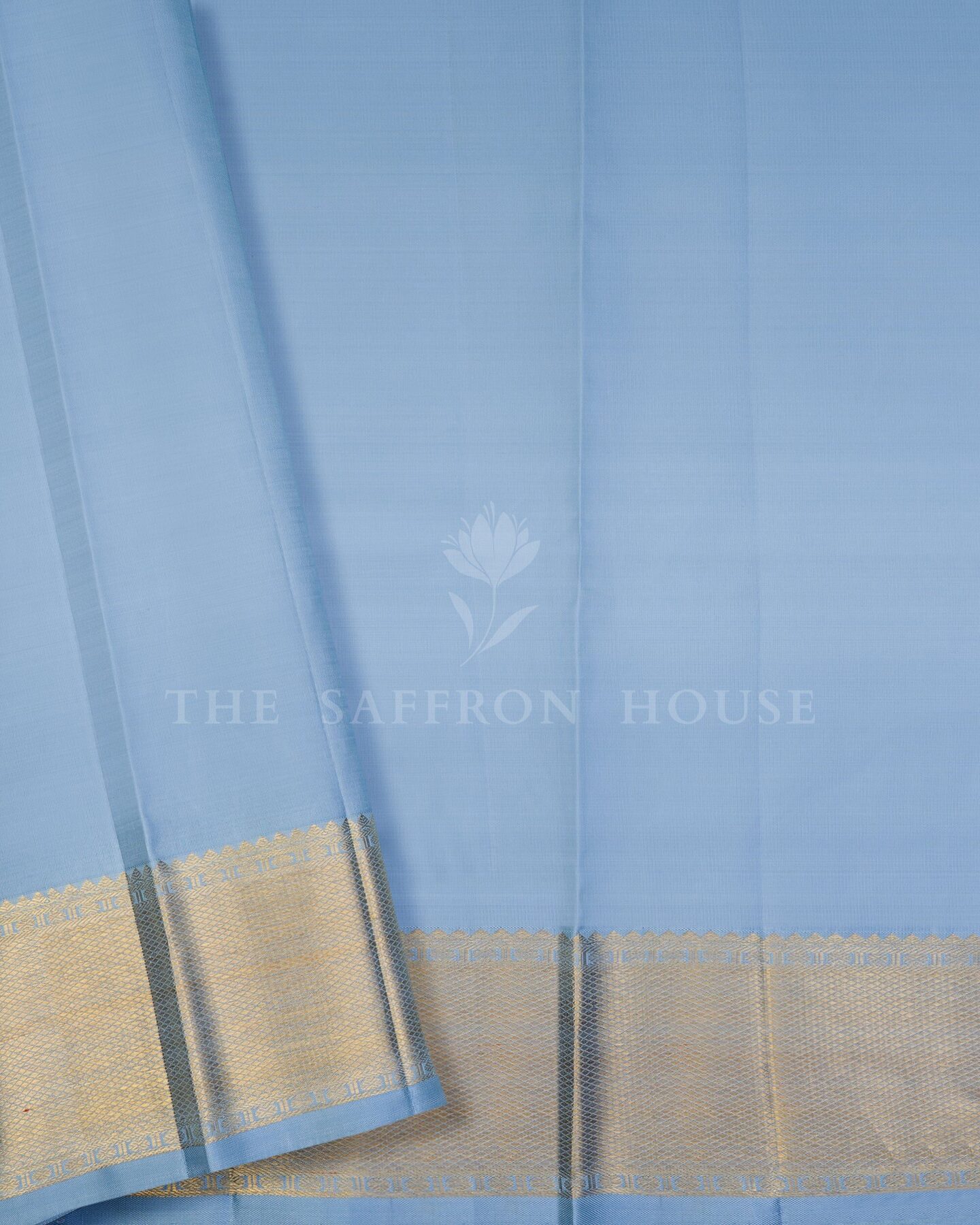सहज रूप से राजसी, निर्विवाद रूप से कालातीत कांजीवरम सिल्क, हमेशा फैशन में। द सैफ्रन हाउस की यह उत्तम सिल्क साड़ी, खूबसूरत पाउडर ब्लू बॉडी पर सोने की ज़री से बुने हुए जटिल मायिल और चक्रम बूटों से सजी है। मैचिंग बॉर्डर, सोने की ज़री से बुने हुए क्लासिक कुयिल कन्नों की एक श्रृंखला को प्रदर्शित करता है। इसका समृद्ध पाउडर ब्लू पल्लू पौराणिक यालियों और मनमोहक हीरे के डिज़ाइन और सोने की ज़री की बारीकियों से सजी एक कलाकृति है, जो एक अलौकिक आकर्षण और सुंदरता बिखेरती है। सादे पाउडर ब्लू सिल्क ब्लाउज़ के साथ, यह खूबसूरत बुनाई आपकी सुंदरता और भव्यता का प्रतीक बनेगी, चाहे आप कहीं भी जाएँ।