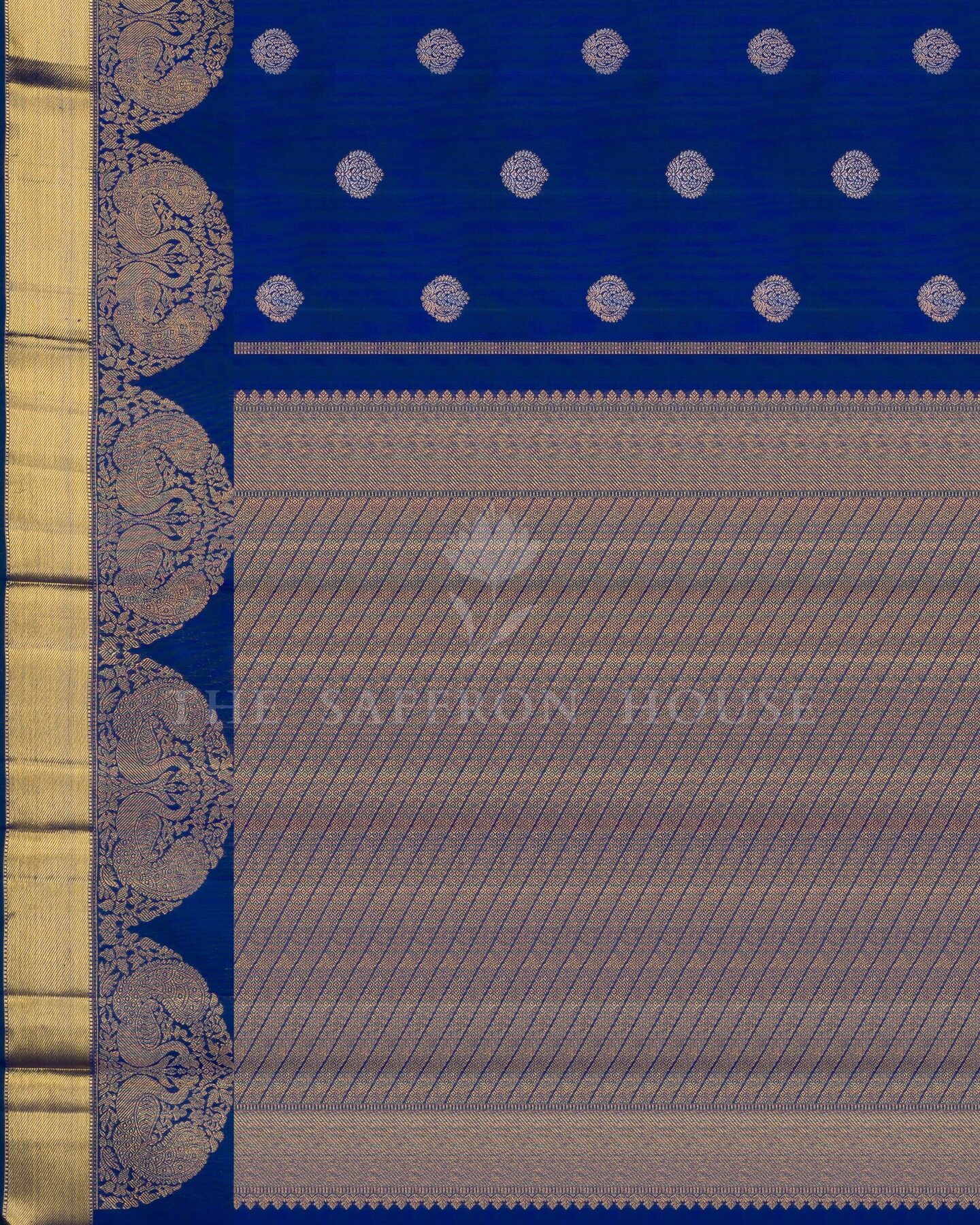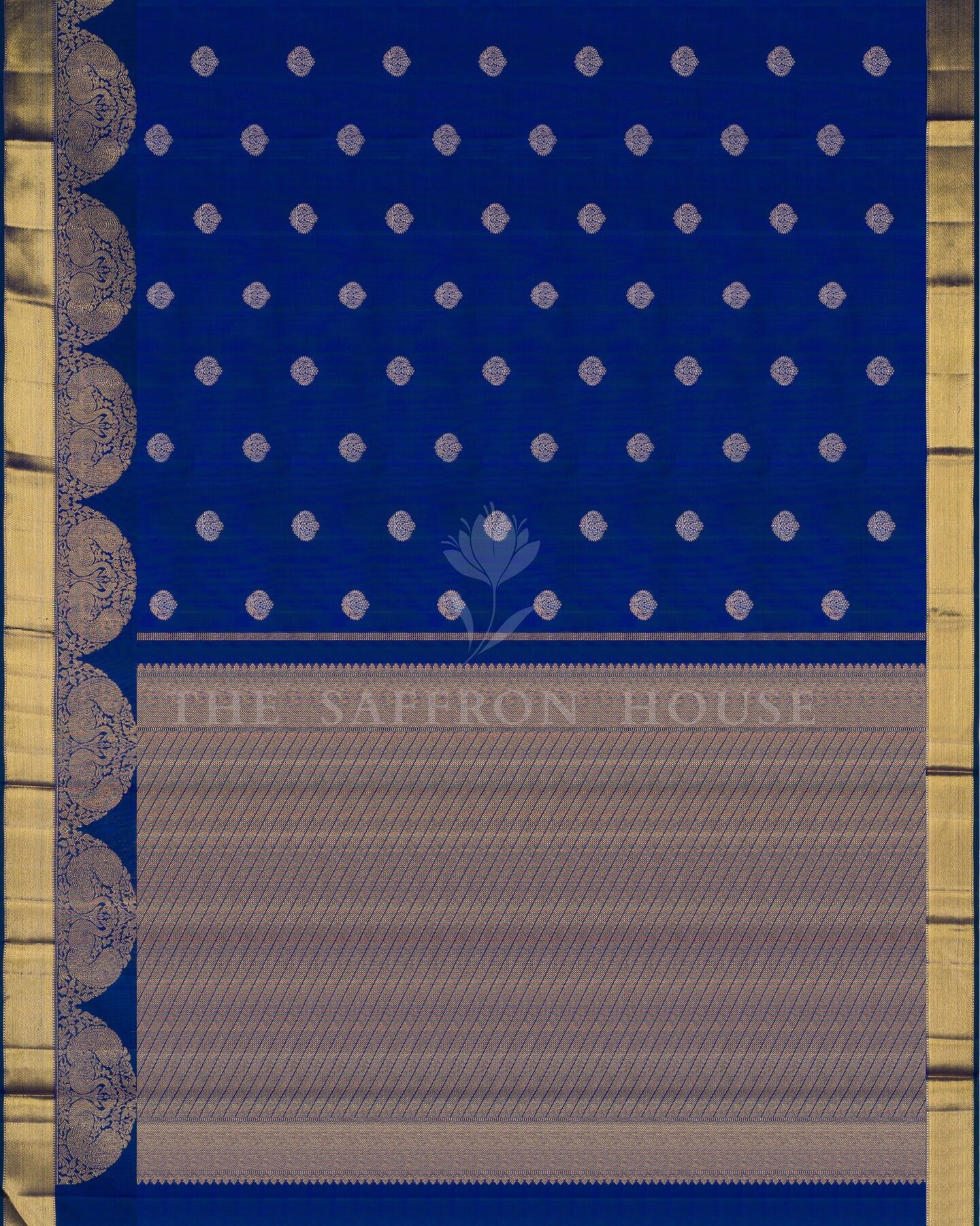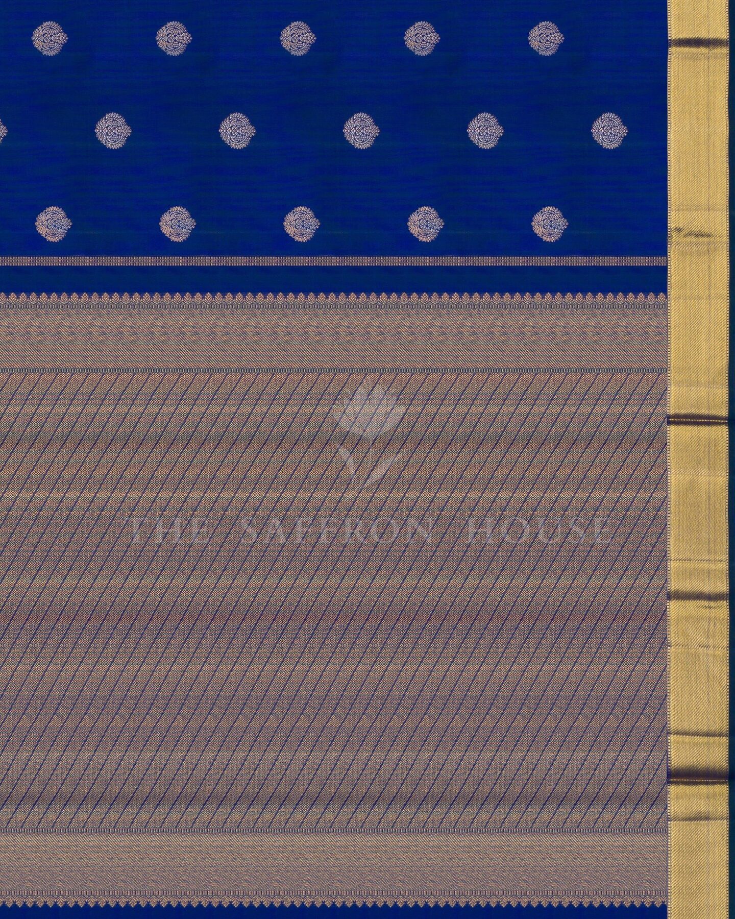 सबका ध्यान खींचने और दिल जीतने के लिए डिज़ाइन की गई, द सैफ्रॉन हाउस की यह शानदार कांजीवरम सिल्क साड़ी आपके साड़ी कलेक्शन में एक शानदार इज़ाफ़ा है। हल्के सुनहरे और चांदी की ज़री से बुने हुए और संरचनात्मक रूप से व्यवस्थित, सुंदर फूलों के बूटे, आकर्षक शाही नीले रंग के शरीर को सुशोभित करते हैं। मैचिंग कोरवाई टर्निंग बॉर्डर में एक आकर्षक आर्च पैटर्न है, जो फूलों के बीच सुंदर अन्नाम और मोर के रूपांकनों से सुसज्जित है, जिसे समृद्ध सुनहरे ज़री और सुंदर गेटी ज़री पैटर्न से पूर्णता से बुना गया है। समृद्ध पैटर्न वाली तिरछी धारियों वाला मैचिंग पल्लू समग्र रूप को एक भव्य पारंपरिक आकर्षण प्रदान करता है। मैचिंग बॉर्डर वाले सादे शाही नीले रंग के सिल्क ब्लाउज़ के साथ, यह खूबसूरत बुनाई हर पल को जादुई बना देगी।