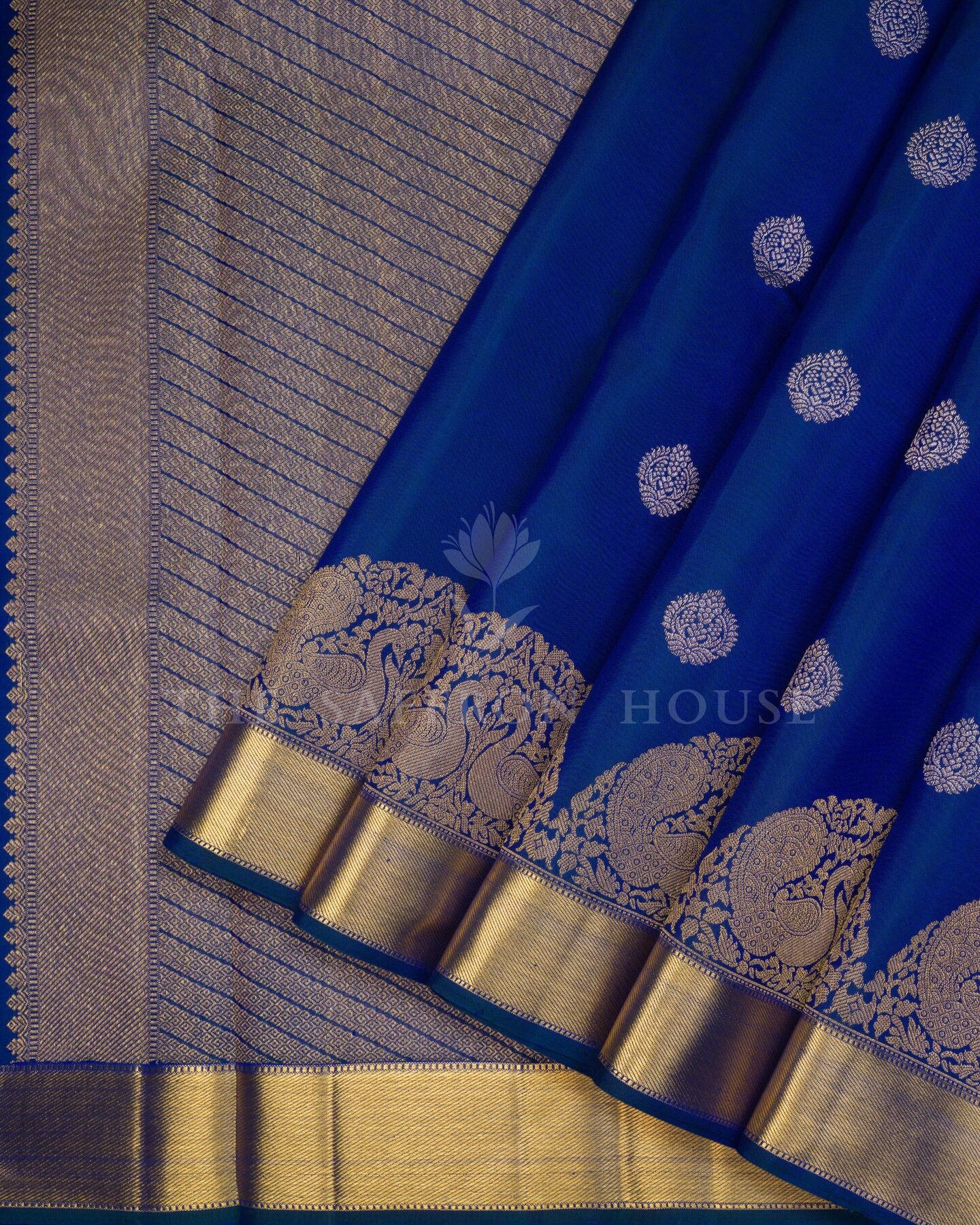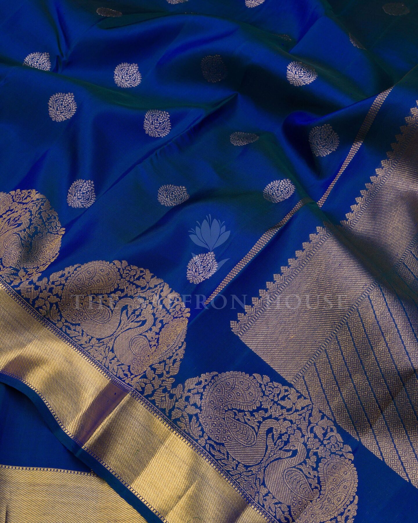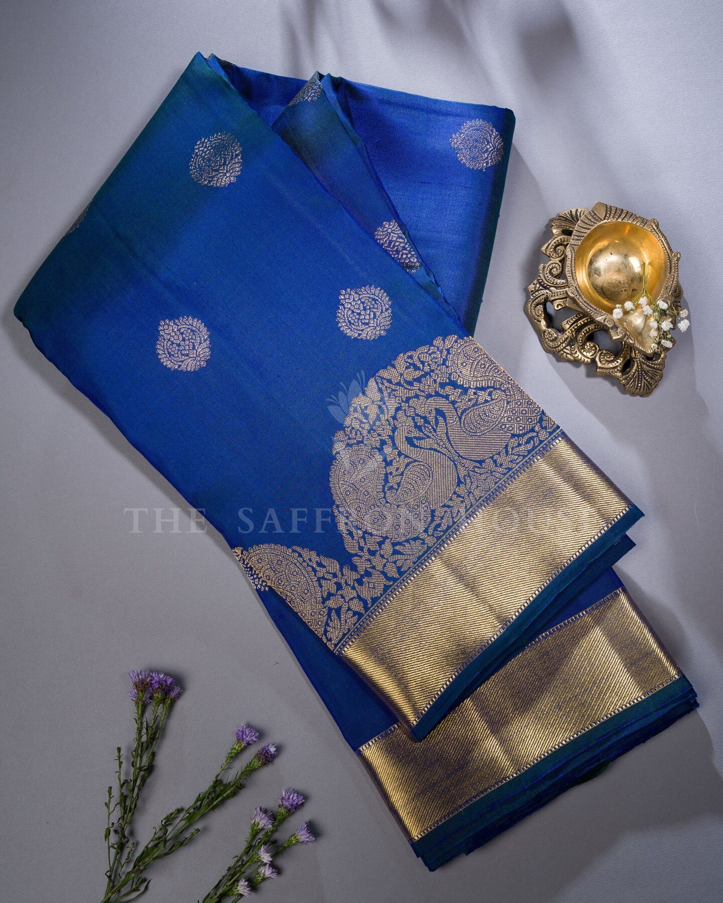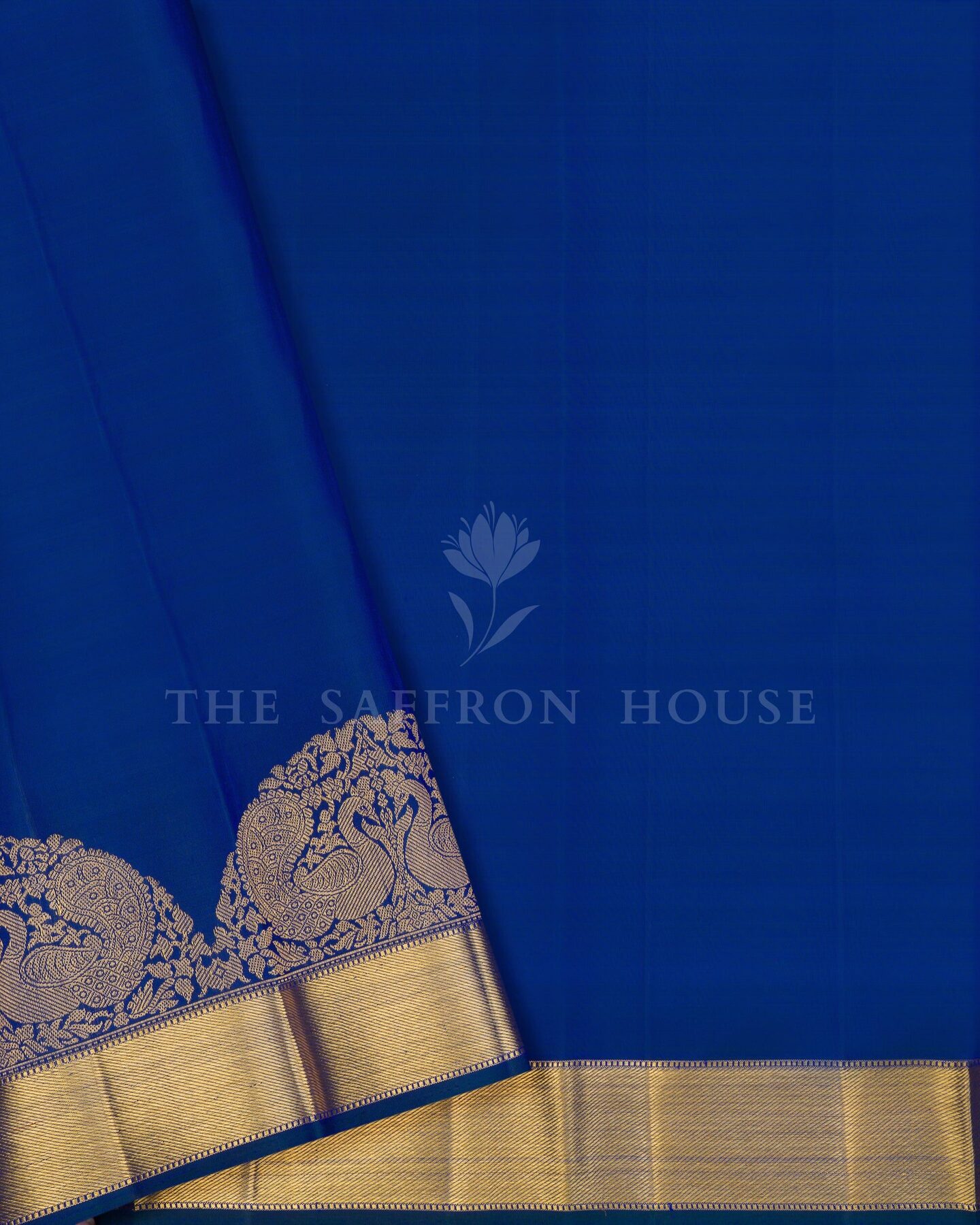 सबका ध्यान खींचने और दिल जीतने के लिए डिज़ाइन की गई, द सैफ्रॉन हाउस की यह शानदार कांजीवरम सिल्क साड़ी आपके साड़ी कलेक्शन में एक शानदार इज़ाफ़ा है। हल्के सुनहरे और चांदी की ज़री से बुने हुए और संरचनात्मक रूप से व्यवस्थित, सुंदर फूलों के बूटे, आकर्षक शाही नीले रंग के शरीर को सुशोभित करते हैं। मैचिंग कोरवाई टर्निंग बॉर्डर में एक आकर्षक आर्च पैटर्न है, जो फूलों के बीच सुंदर अन्नाम और मोर के रूपांकनों से सुसज्जित है, जिसे समृद्ध सुनहरे ज़री और सुंदर गेटी ज़री पैटर्न से पूर्णता से बुना गया है। समृद्ध पैटर्न वाली तिरछी धारियों वाला मैचिंग पल्लू समग्र रूप को एक भव्य पारंपरिक आकर्षण प्रदान करता है। मैचिंग बॉर्डर वाले सादे शाही नीले रंग के सिल्क ब्लाउज़ के साथ, यह खूबसूरत बुनाई हर पल को जादुई बना देगी।