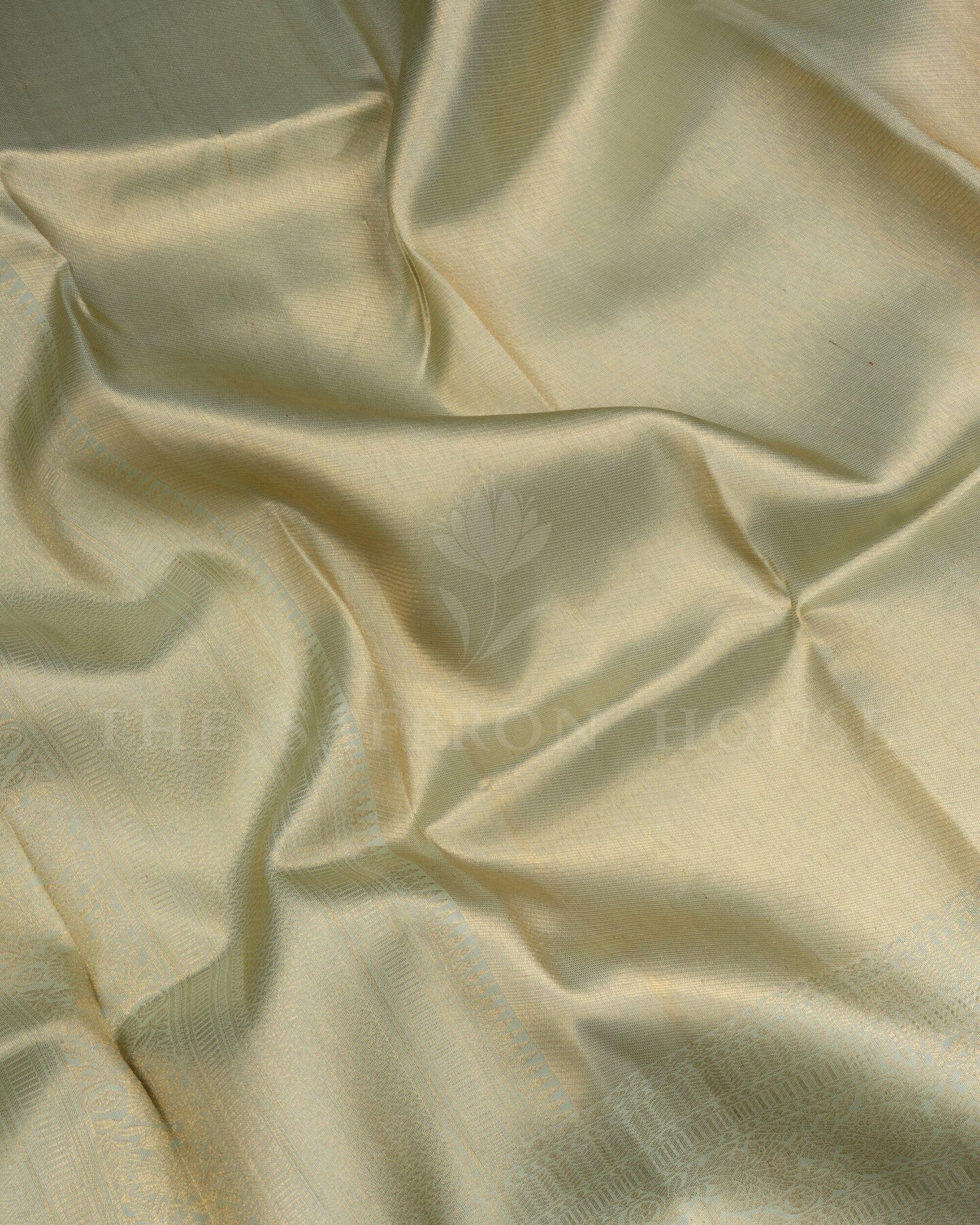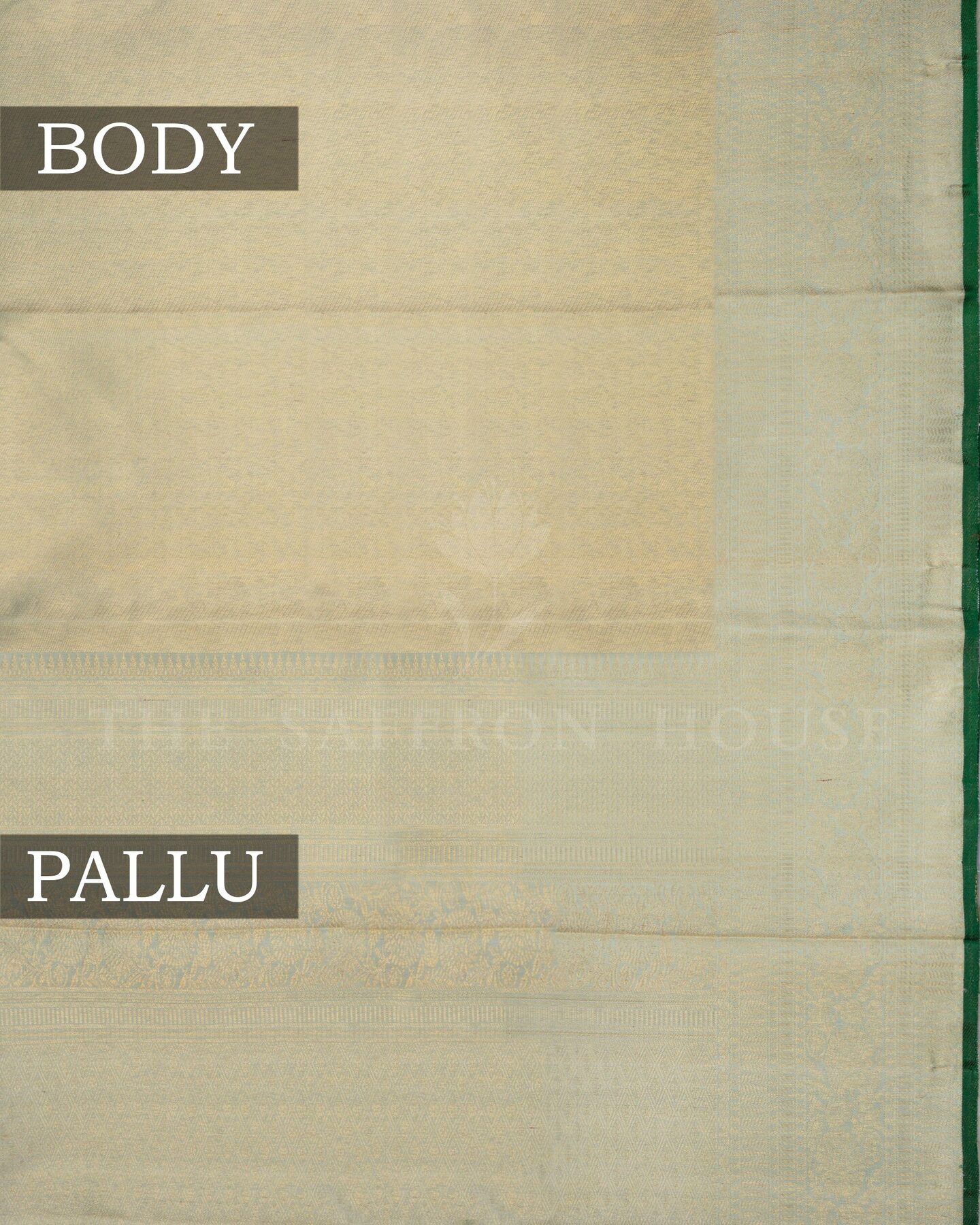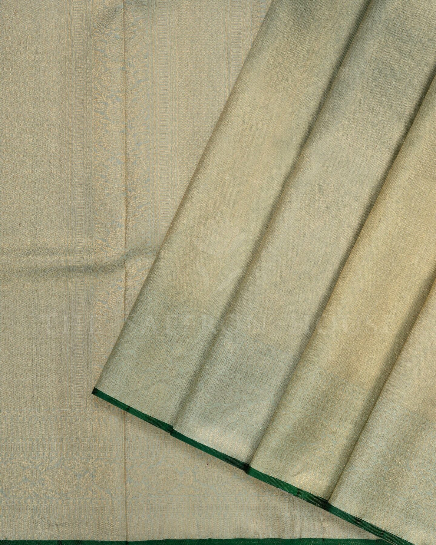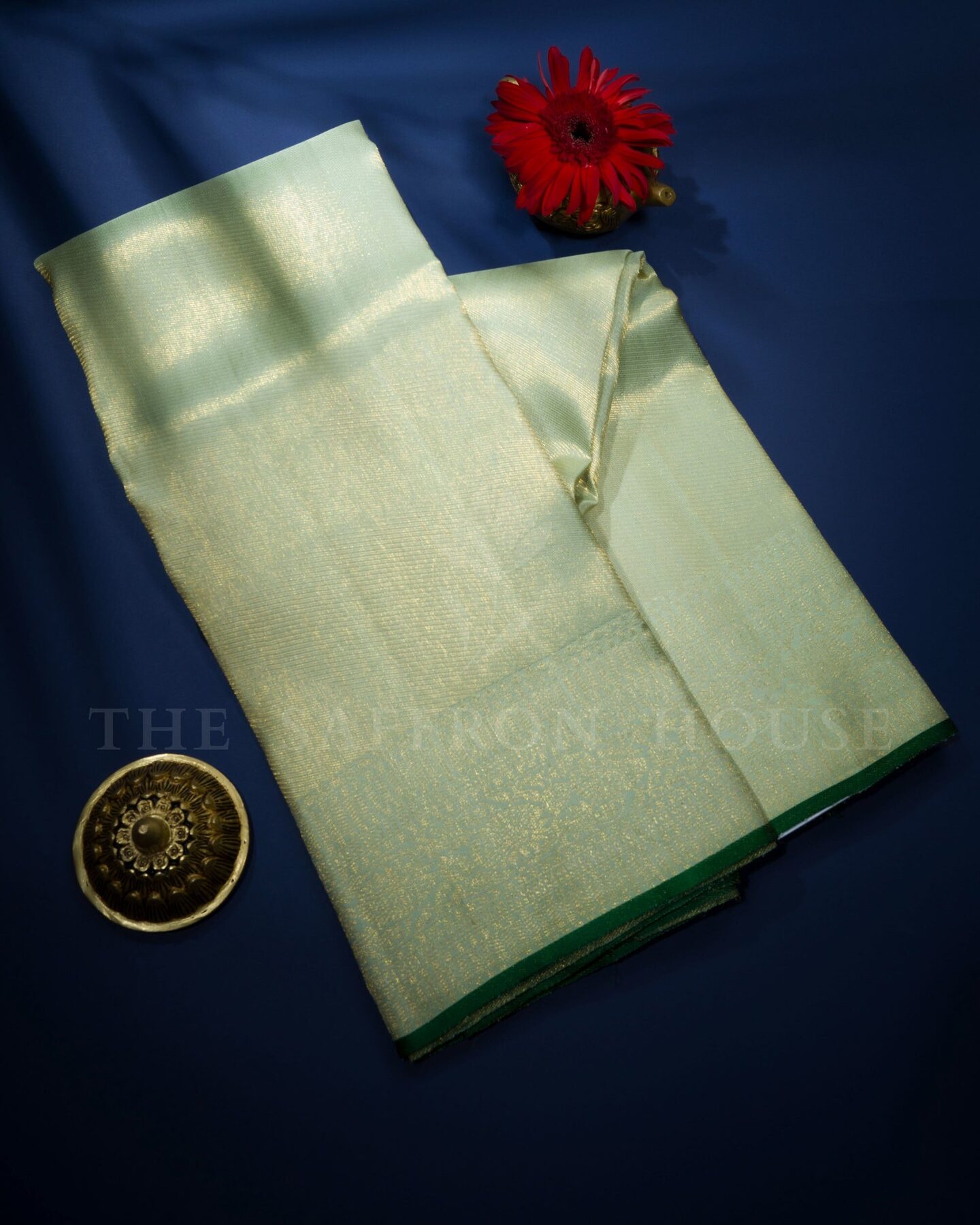 The body is adorned with plain silk tissue finish body, each thread placed with precision and purpose. The light pista green border frames the drape with confident definition, while gold zari runs through the weave, catching light the way temple gold does — slowly, deeply, unforgettably.