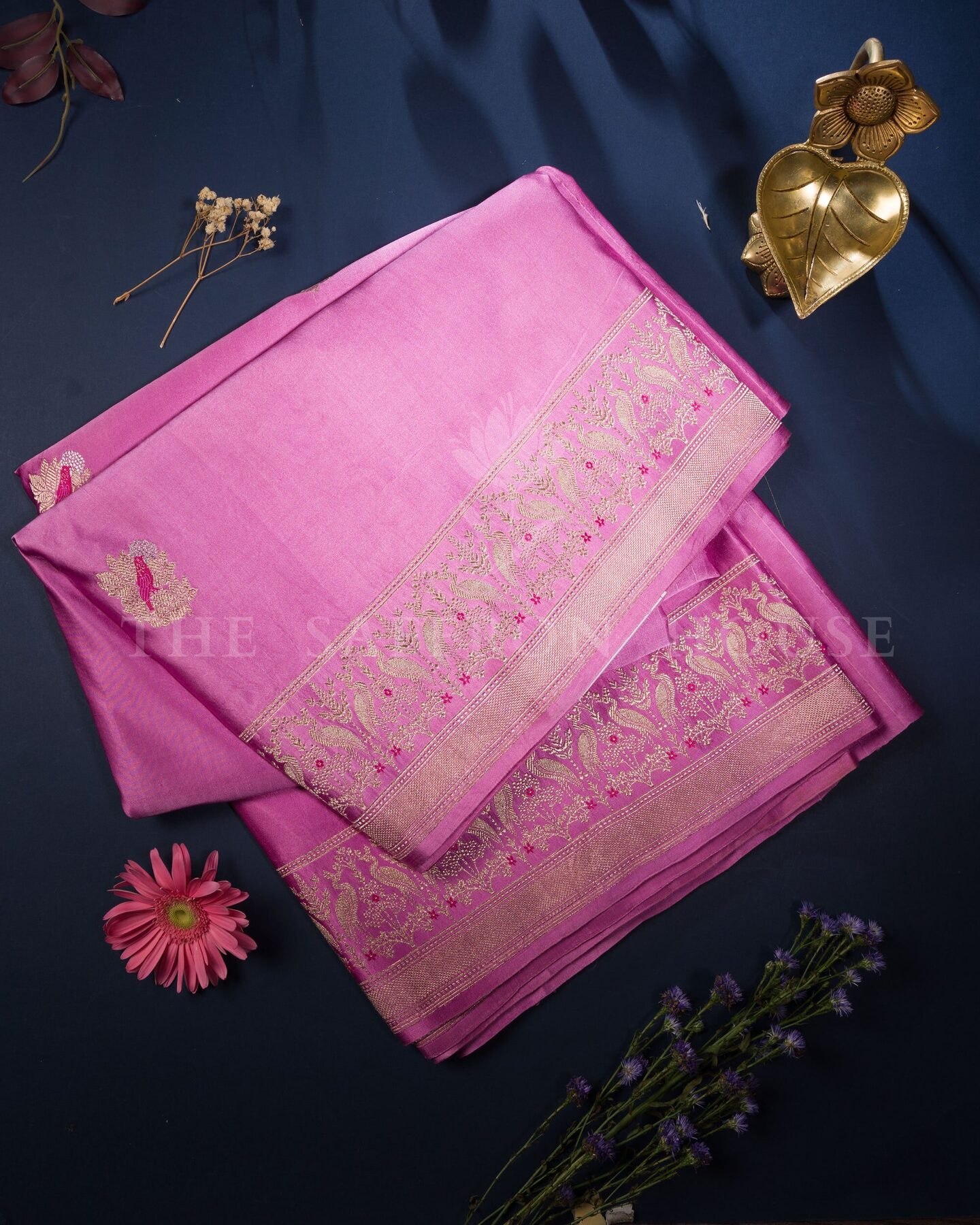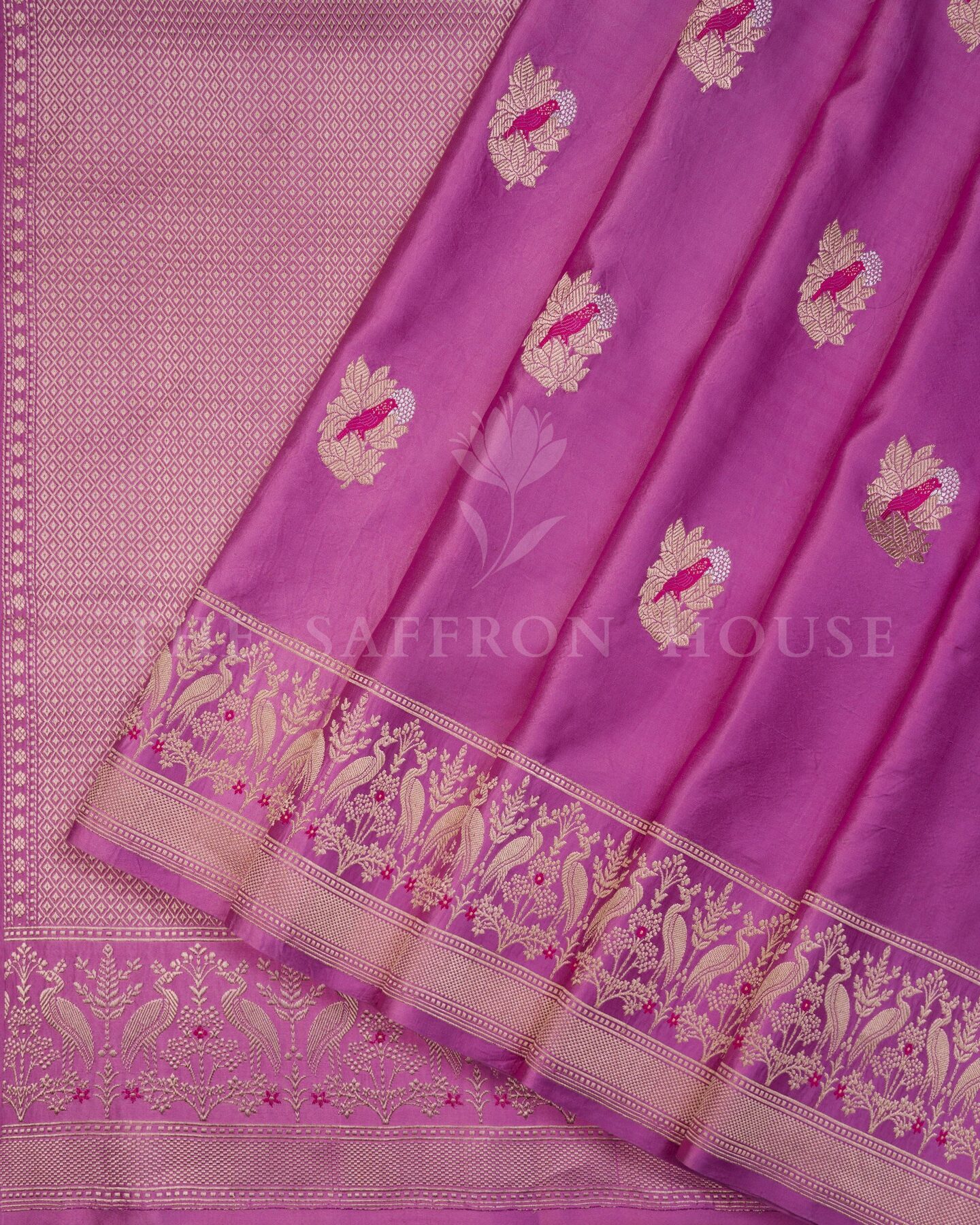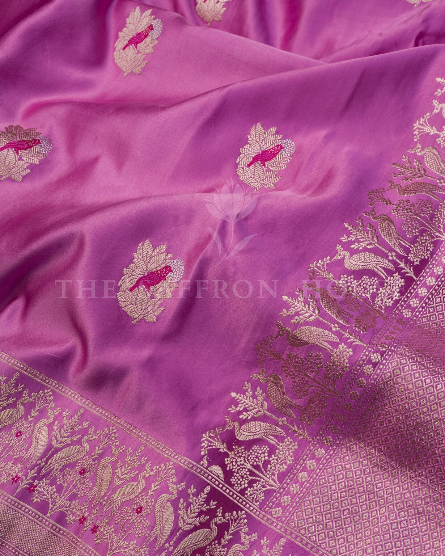 विरासत और हस्तकला का एक शानदार उत्सव, चटक रानी गुलाबी रंग की यह मशरू बनारसी साड़ी, पूरे शरीर पर ज़री के पत्तों के डिज़ाइन में जड़े मीनाकारी पक्षी रूपांकनों से सजी है। इसके बॉर्डर और पल्लू पर सोने की ज़री और बहुरंगी मीनाकारी के काम से बने दो मोर और फूलों की लताओं के साथ एक भव्य पुष्प-पैस्ले जाल है। साटन जैसी चमक और सहज ड्रेप के साथ, यह साड़ी उत्सव के अवसरों, दुल्हन के साज-सामान या विरासत के उपहार देने के लिए एकदम सही है।
