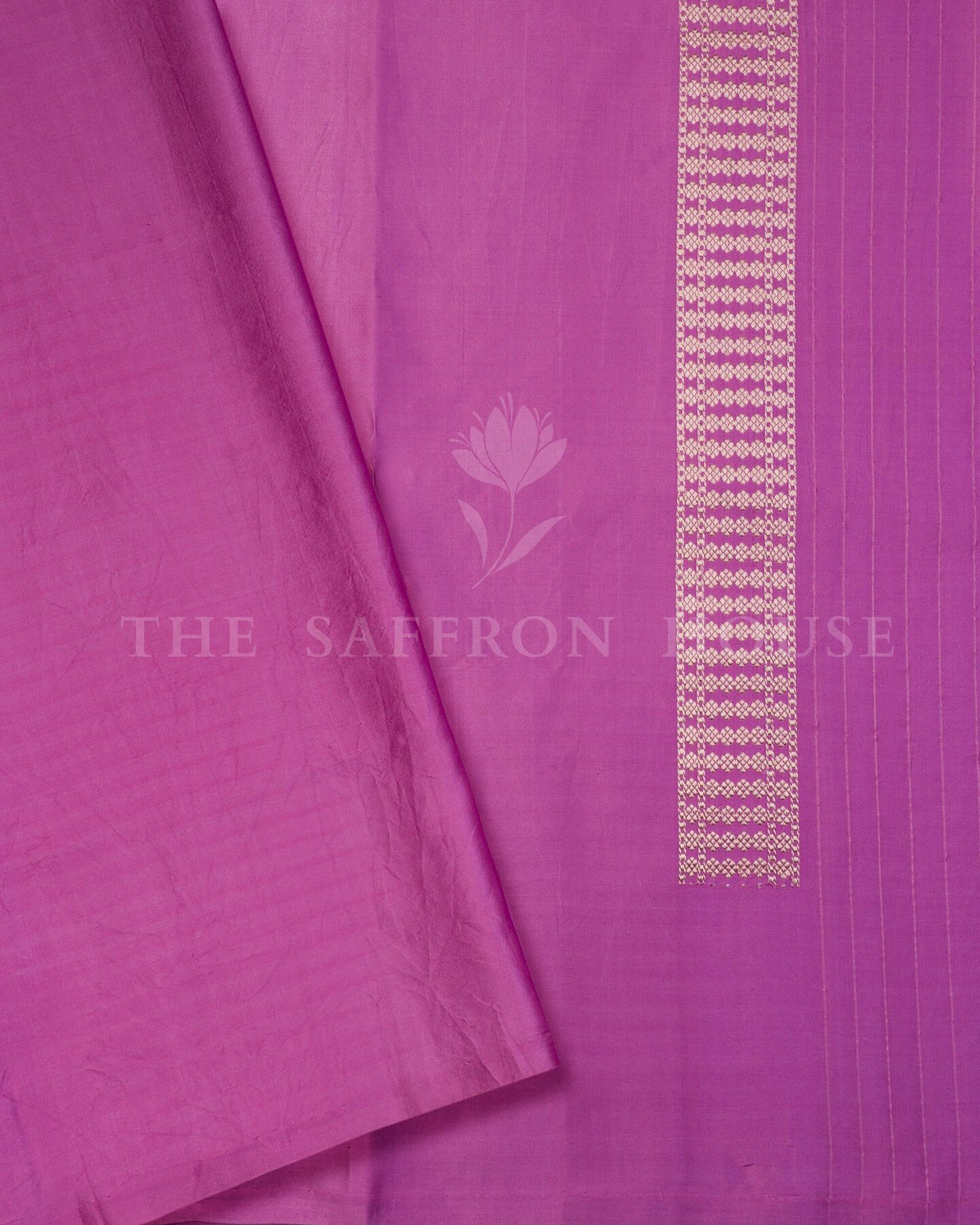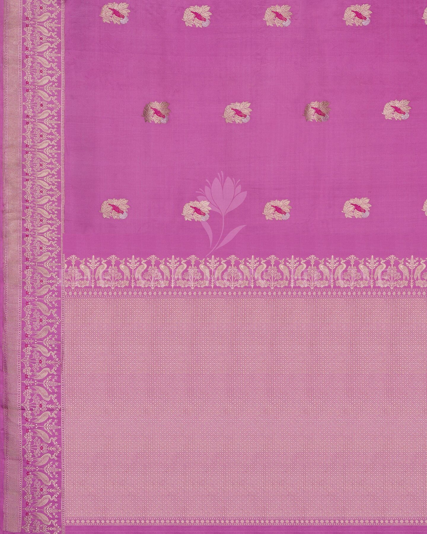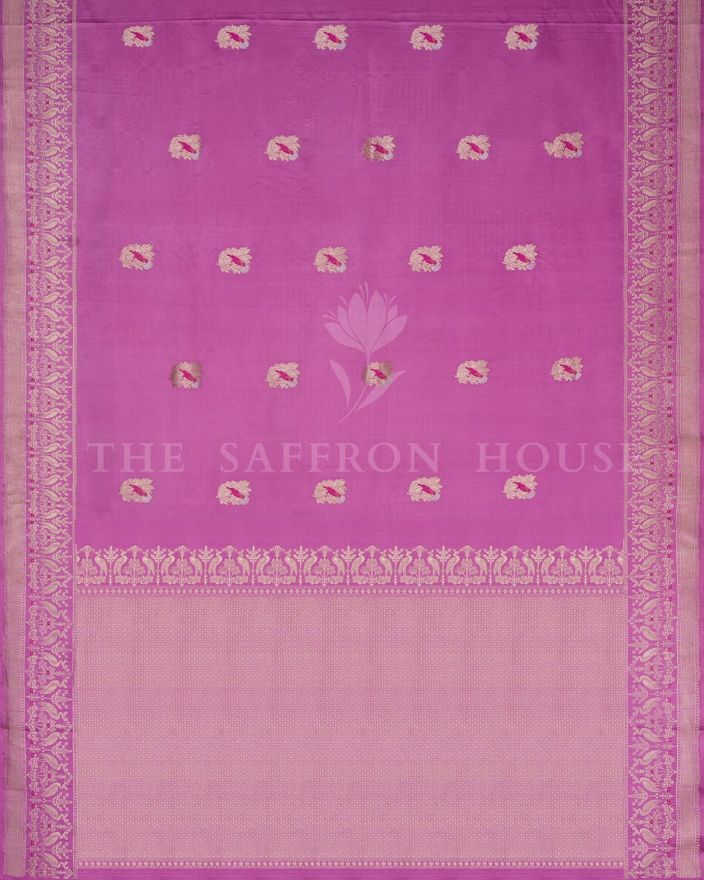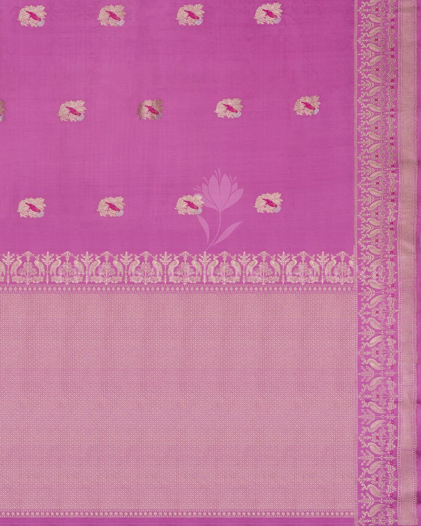 विरासत और हस्तकला का एक शानदार उत्सव, चटक रानी गुलाबी रंग की यह मशरू बनारसी साड़ी, पूरे शरीर पर ज़री के पत्तों के डिज़ाइन में जड़े मीनाकारी पक्षी रूपांकनों से सजी है। इसके बॉर्डर और पल्लू पर सोने की ज़री और बहुरंगी मीनाकारी के काम से बने दो मोर और फूलों की लताओं के साथ एक भव्य पुष्प-पैस्ले जाल है। साटन जैसी चमक और सहज ड्रेप के साथ, यह साड़ी उत्सव के अवसरों, दुल्हन के साज-सामान या विरासत के उपहार देने के लिए एकदम सही है।