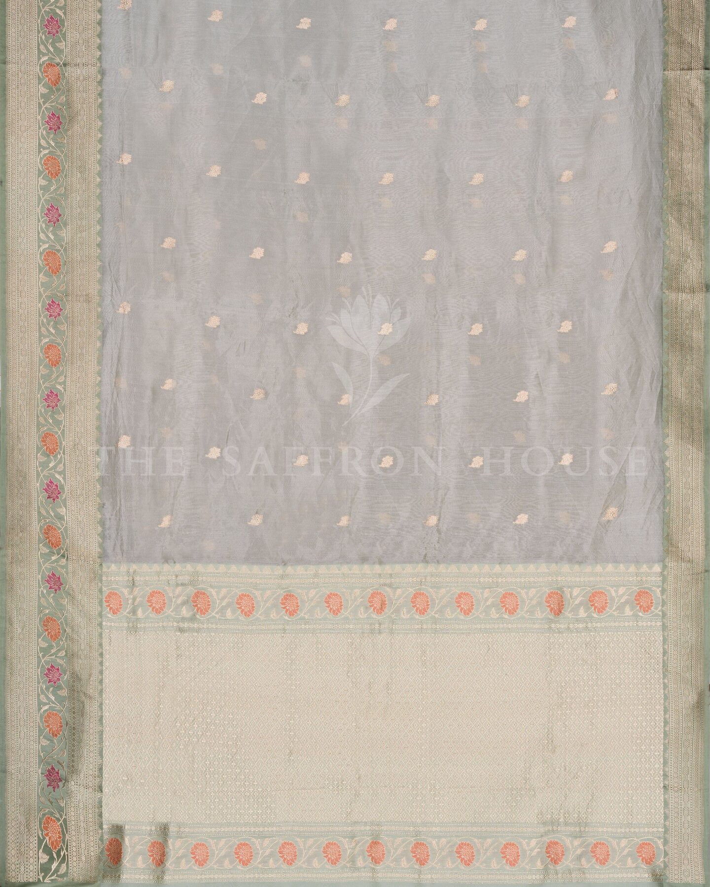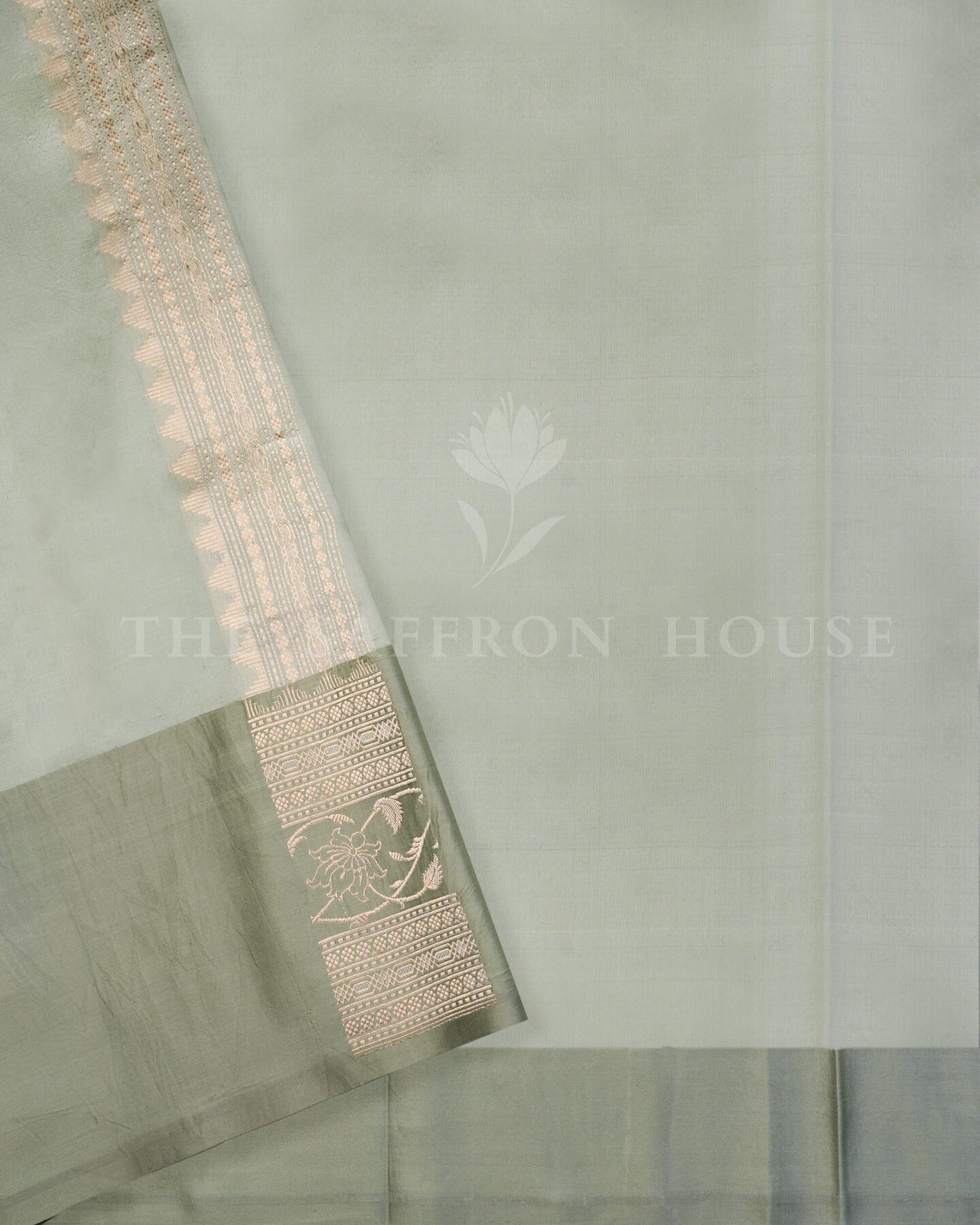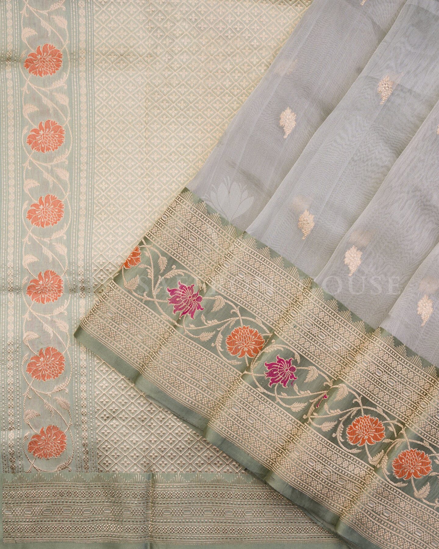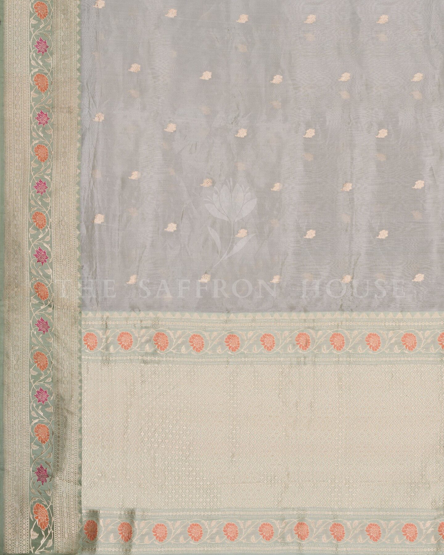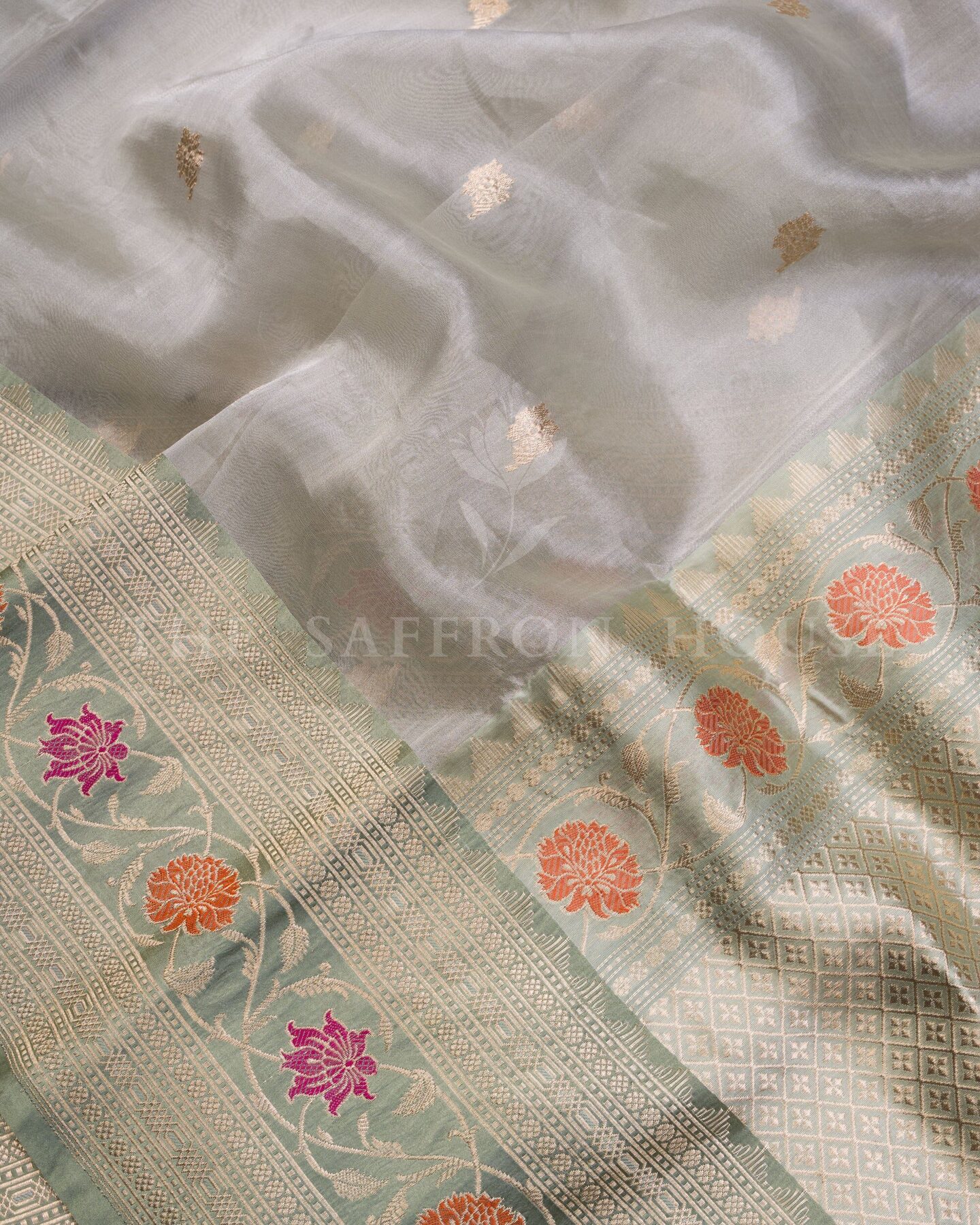 हवादार, चमकदार और बारीकी से बुनी हुई—यह मिंट ग्रीन कोरा बनारसी साड़ी शान की एक झलक है। महीन ऑर्गेना सिल्क पर बुनी गई, इसके शरीर पर मुलायम सुनहरी बूटियाँ बिखरी हुई हैं, जबकि बॉर्डर और पल्लू आड़ू, मैजेंटा और सुनहरी ज़री के फूलों से सजीव हैं। हल्के शांत रंग और जीवंत फूलों का कंट्रास्ट एक अद्भुत दृश्य सामंजस्य बनाता है। पंख जैसी हल्की और पहनने में आसान, यह साड़ी सुबह की शादियों, मंदिर दर्शन या शानदार ब्रंच समारोहों के लिए एकदम सही है।