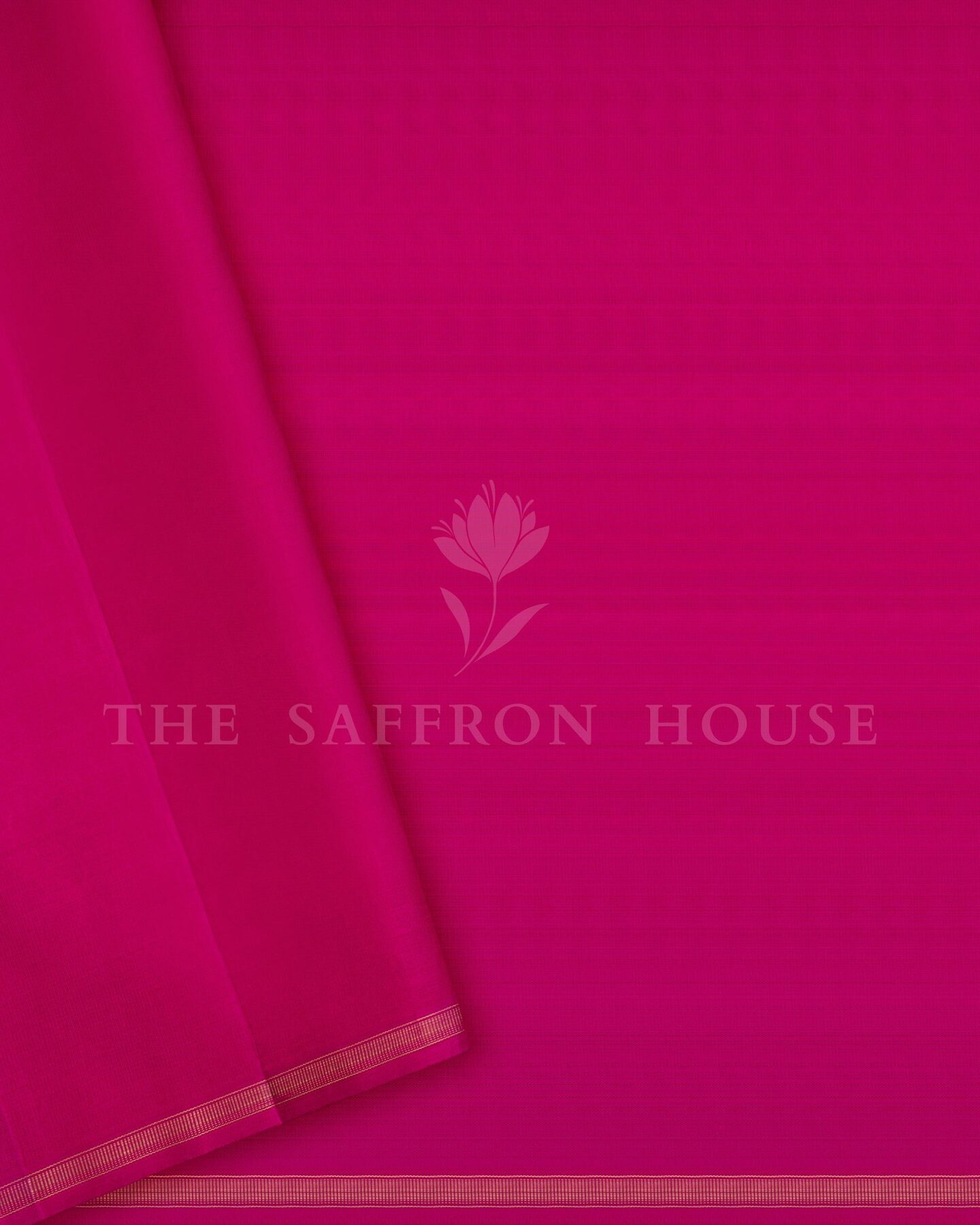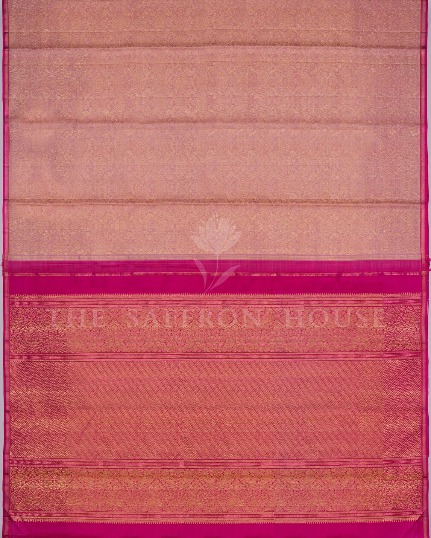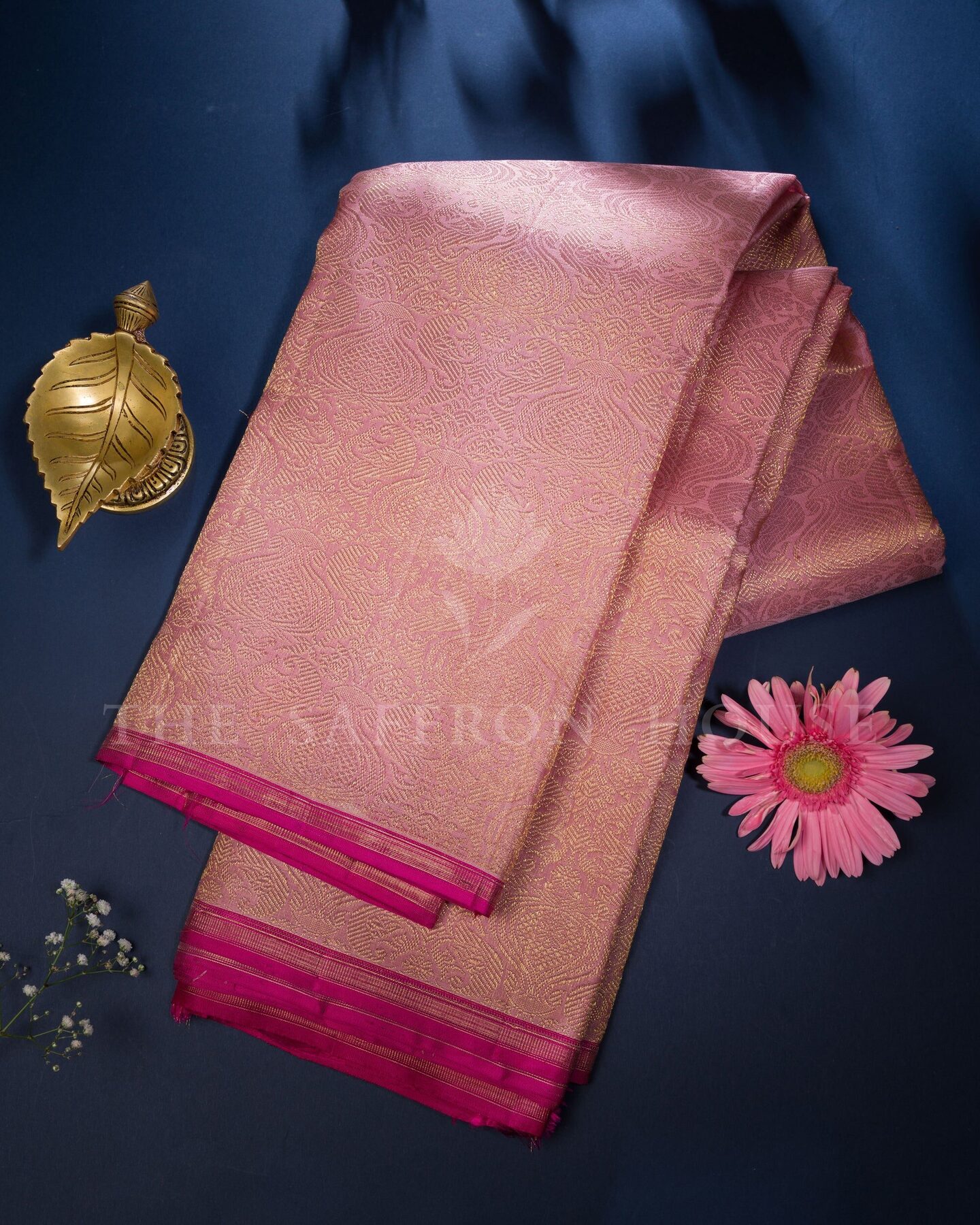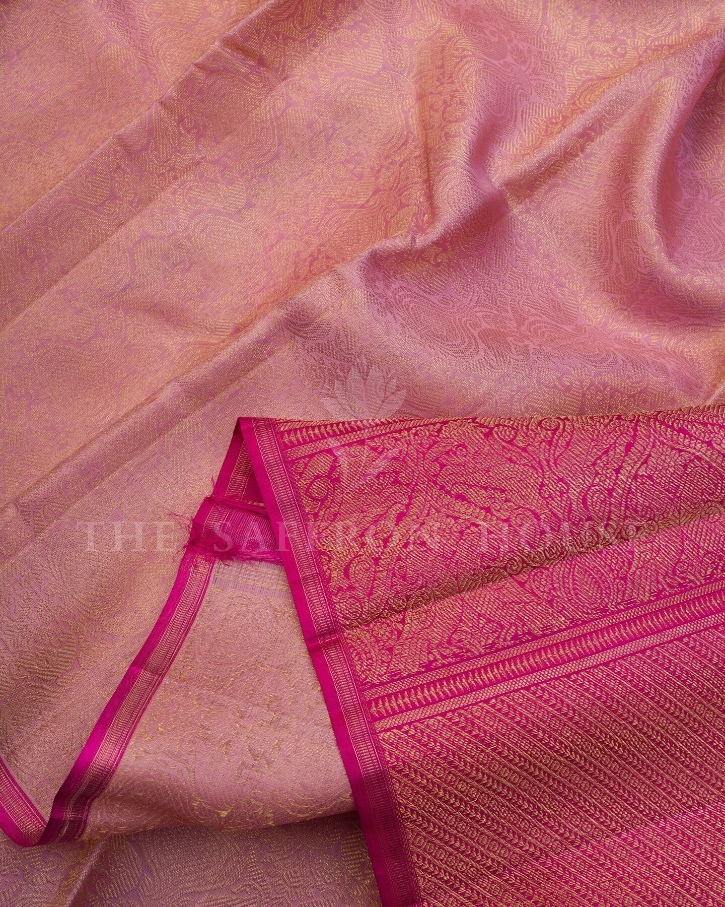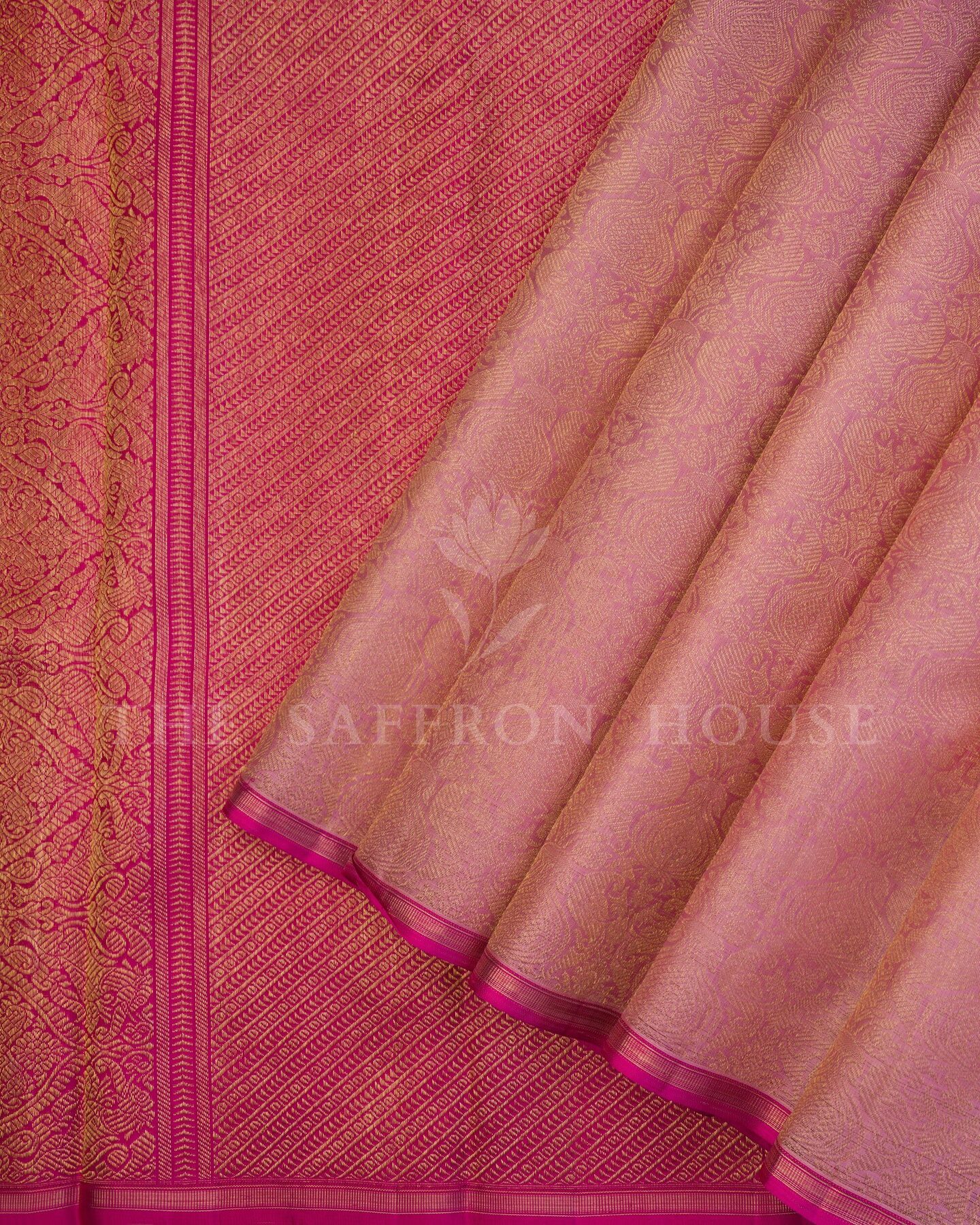 द सैफ्रॉन हाउस की इस खूबसूरत कांजीवरम सिल्क साड़ी में दक्षिण भारतीय परंपरा के समृद्ध रंगों और चमकदार रेशमी रंगों को समाहित करते हुए, खुद को वैभव में डुबोएँ। पतले गुलाबी पैटर्न वाले किनारे वाली प्याज़ के गुलाबी रंग की मनमोहक साड़ी, सोने की ज़री से बुनी हुई उत्तम पुष्प जाल से पूरी तरह भरी हुई है। इसके विपरीत रानी गुलाबी पल्लू में आकर्षक याली और तोते के रूपांकनों की एक पट्टी के साथ-साथ सोने की ज़री से बुनी हुई तिरछी धारियों की एक श्रृंखला भी है। सादा रानी गुलाबी रेशमी ब्लाउज़ सोने की ज़री से सजी इस साड़ी में रंगों का एक अद्भुत मिश्रण है, जो इस भव्य बुनाई को यह विश्वास दिलाता है कि लालित्य शाश्वत है - बिल्कुल कांजीवरम की तरह।