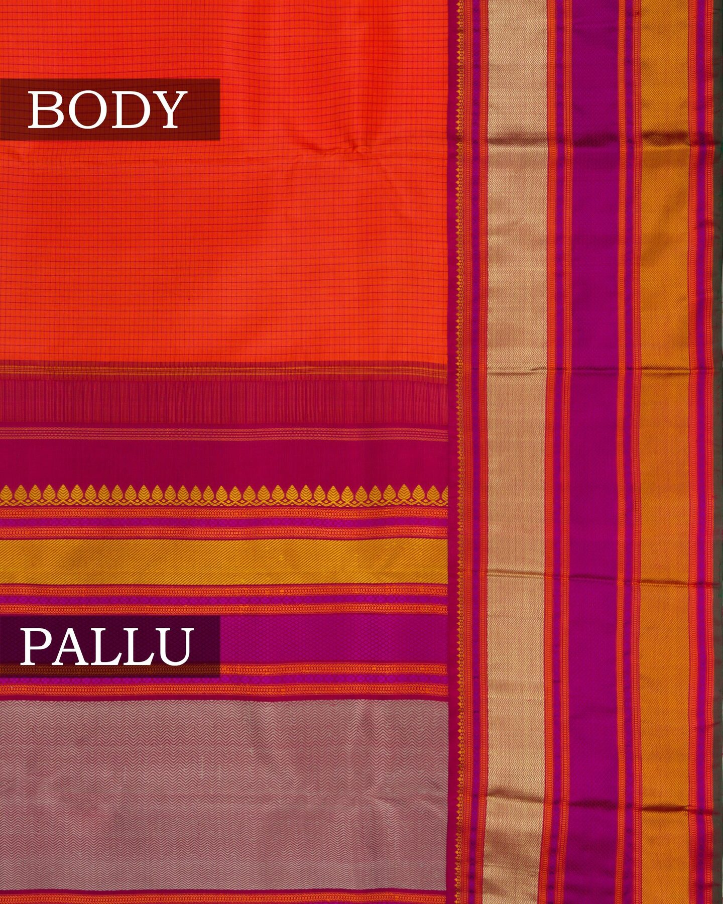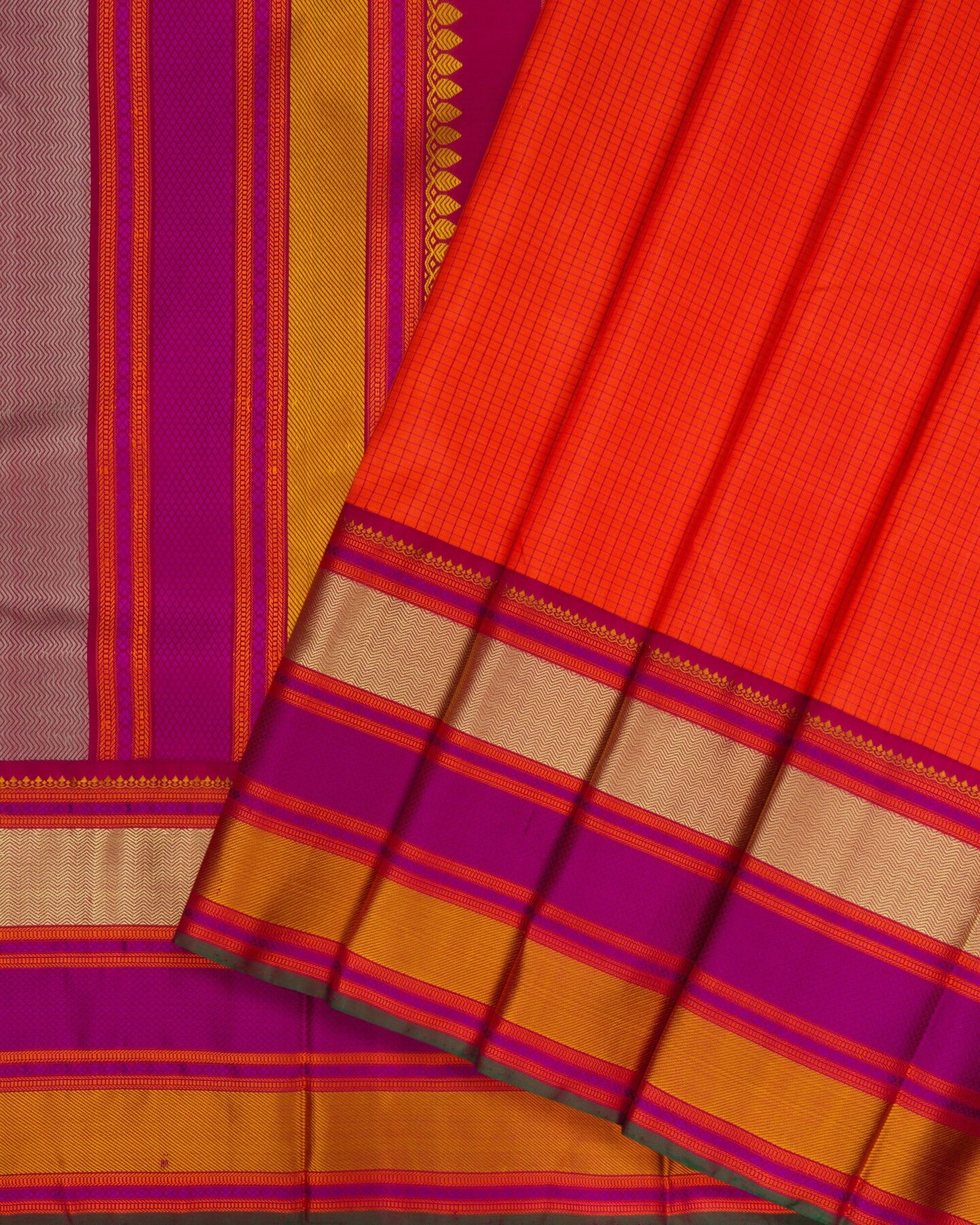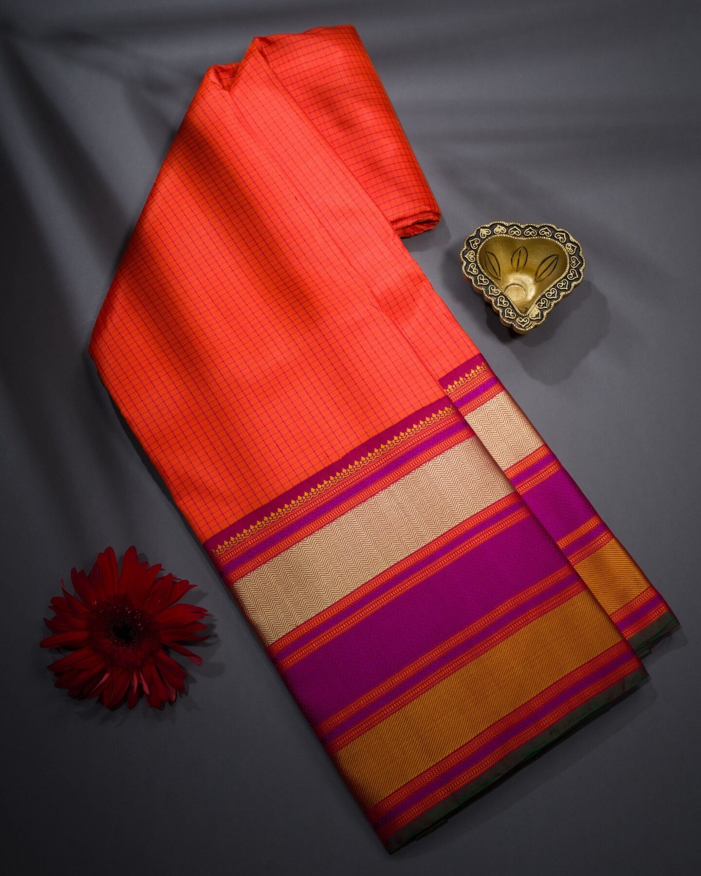 There is something about the interplay of orange and multicolor that feels both ancient and alive. This Kattam Kanjivaram silk saree opens with vibrant as a marigold garland at the threshold, its surface shimmering with the unhurried rhythm of the loom.