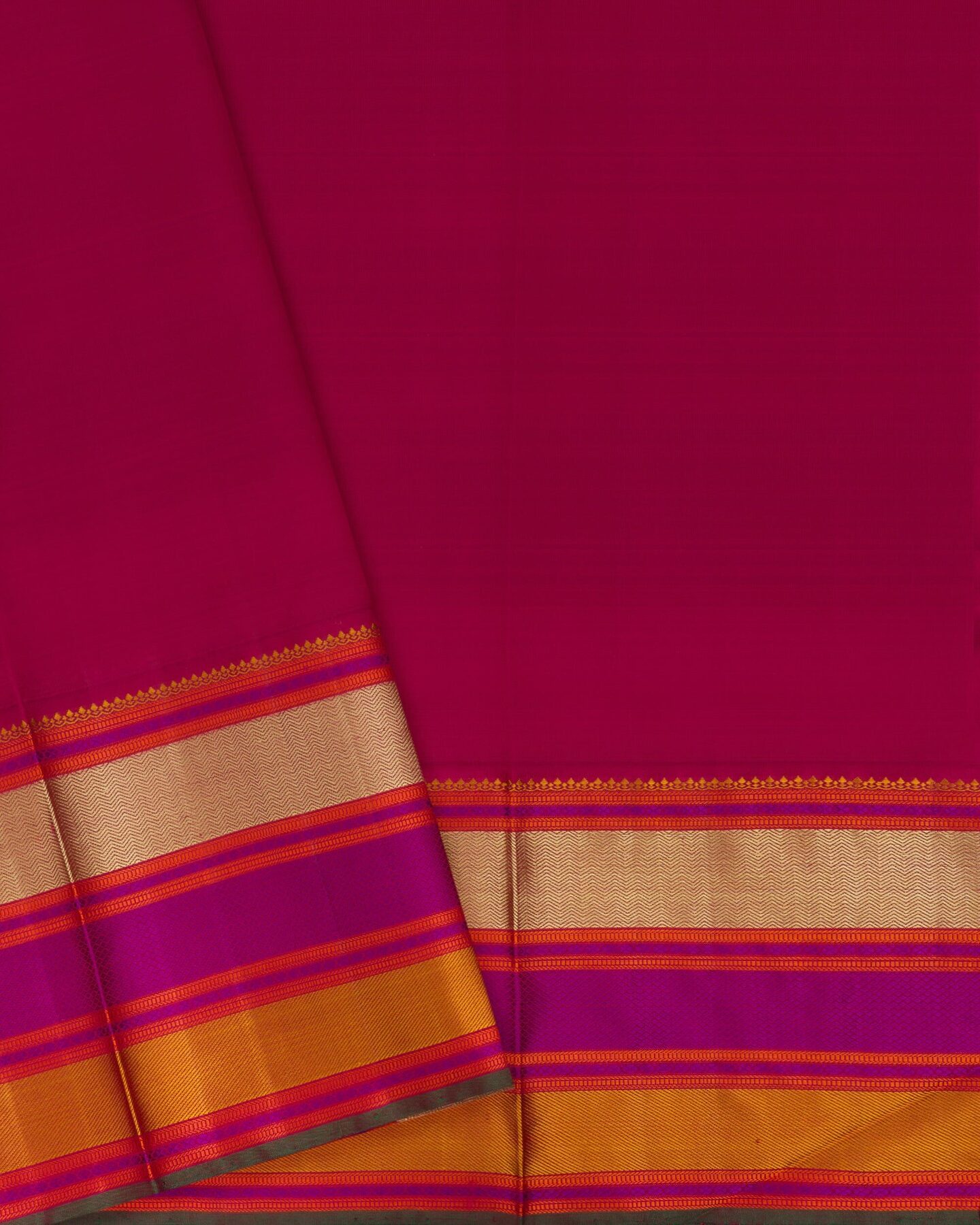 Pure mulberry silk with pure zari weaving, providing a rich, lustrous texture and structure that drapes like a dream — ideal for festive dressing.. From the looms of Kanchipuram, Tamil Nadu, where master weavers have passed down their skills over generations.