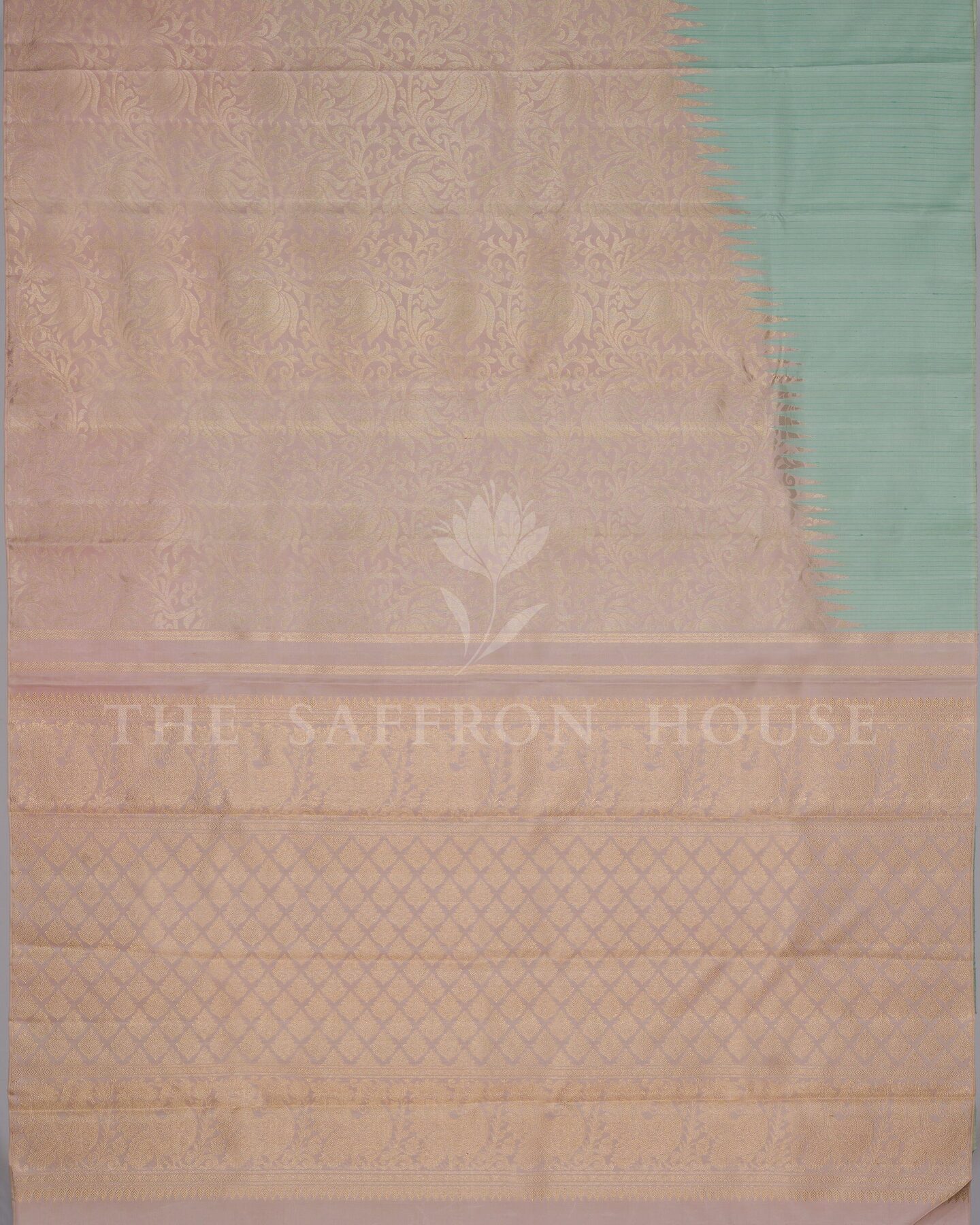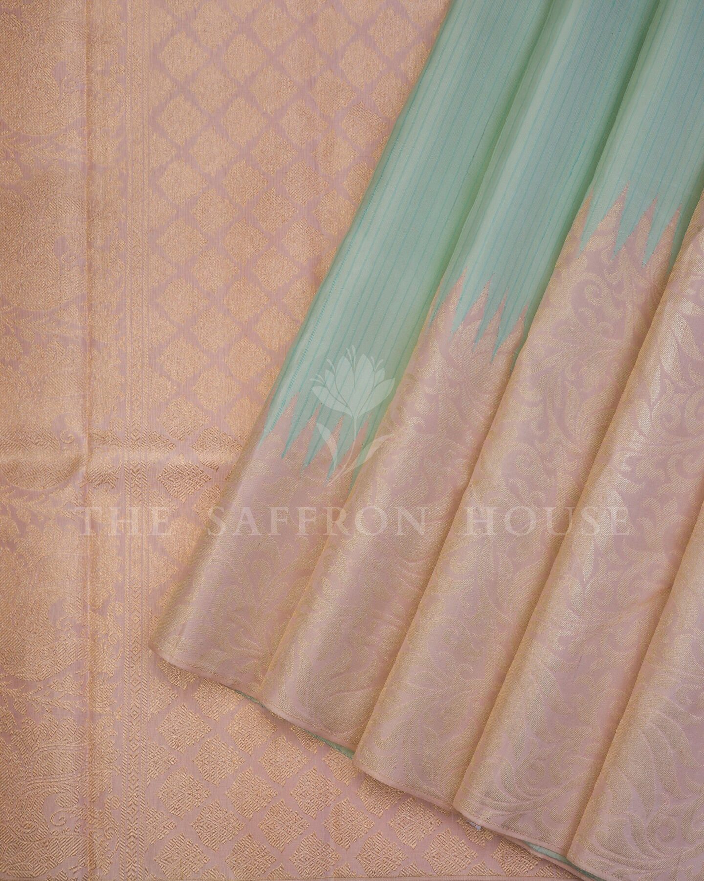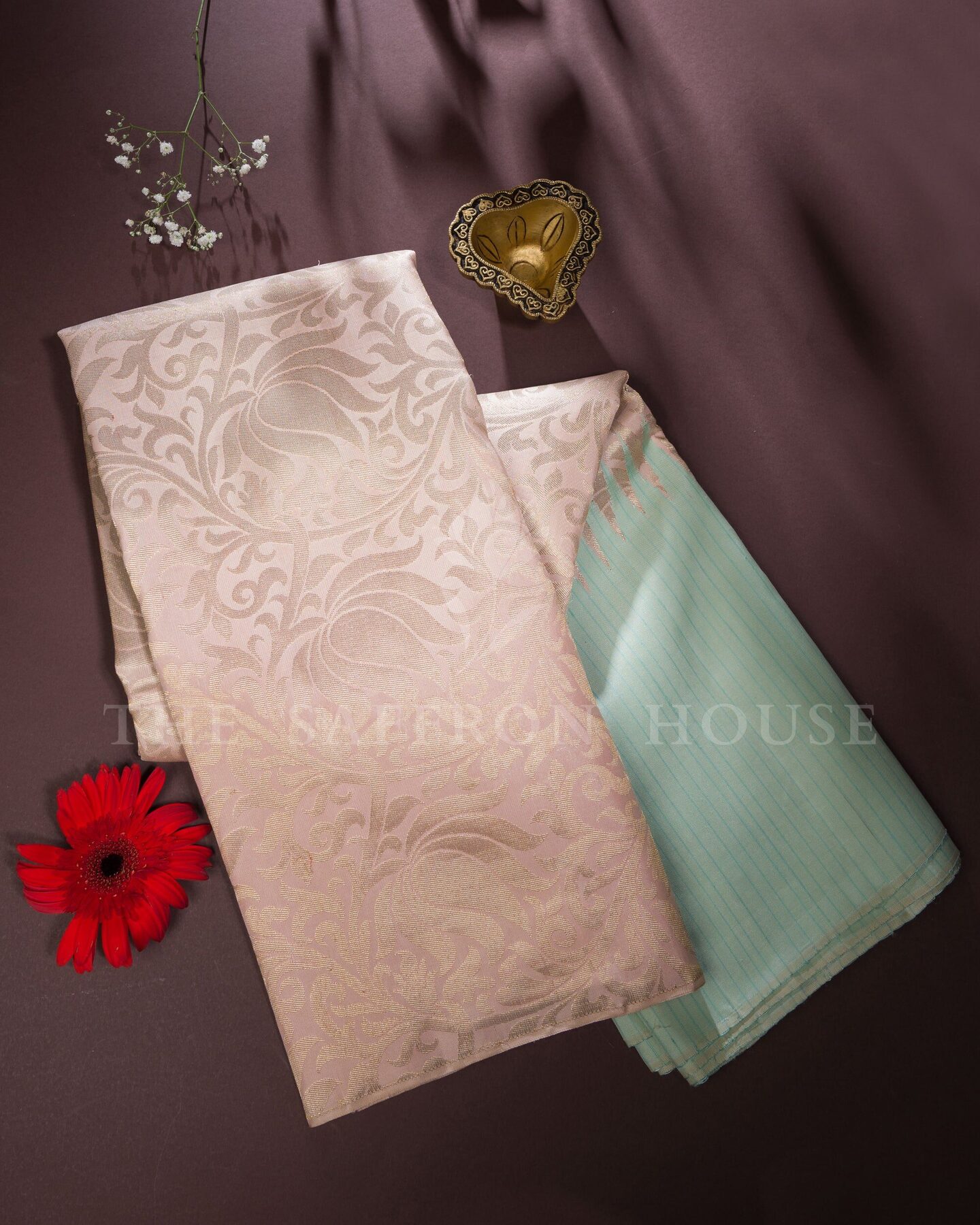 द सैफ्रॉन हाउस की इस खूबसूरत हाफ एंड हाफ कांजीवरम सिल्क साड़ी में आप लाखों की खूबसूरत लगें। पेस्टल मिंट ग्रीन रंग के आधे हिस्से में गहरे हरे रंग की खूबसूरत खड़ी धागों की धारियाँ हैं, जबकि कंट्रास्टिंग पर्ल ब्लश पिंक रंग के आधे हिस्से में हल्के सुनहरे ज़री से खूबसूरती से बुनी गई खूबसूरत फूलों की नसें हैं। खूबसूरत मोर के डिज़ाइन और फूलों के हीरे के पैटर्न से सजा इसका गहरा पर्ल ब्लश पिंक पल्लू एक कालातीत आकर्षण बिखेरता है। पल्लू पर फूलों के हीरे के पैटर्न वाली एक पट्टी वाले सादे पर्ल ब्लश पिंक सिल्क ब्लाउज़ के साथ, यह खूबसूरत बुनाई आपके साड़ी कलेक्शन में एक बेजोड़ जोड़ होगी।