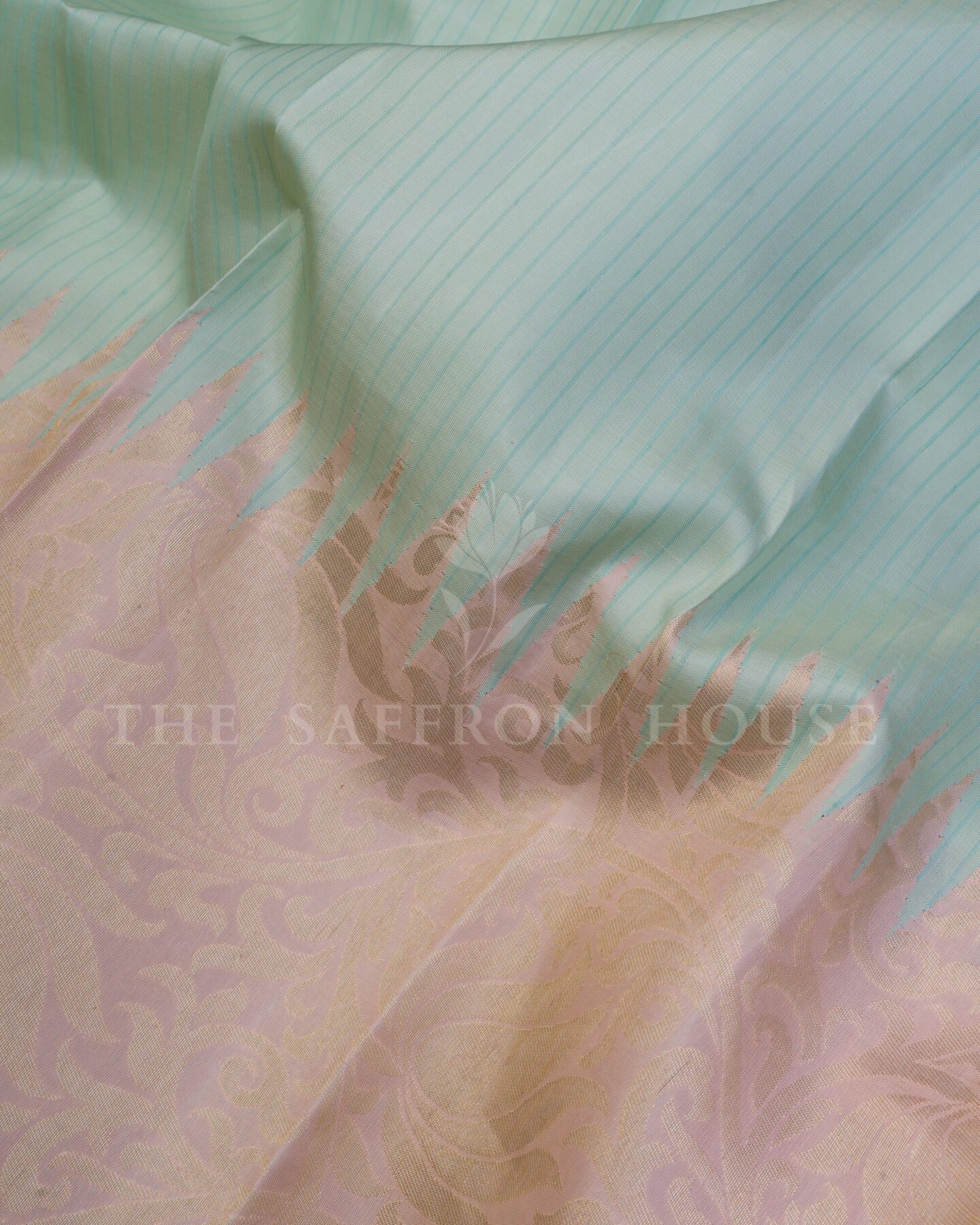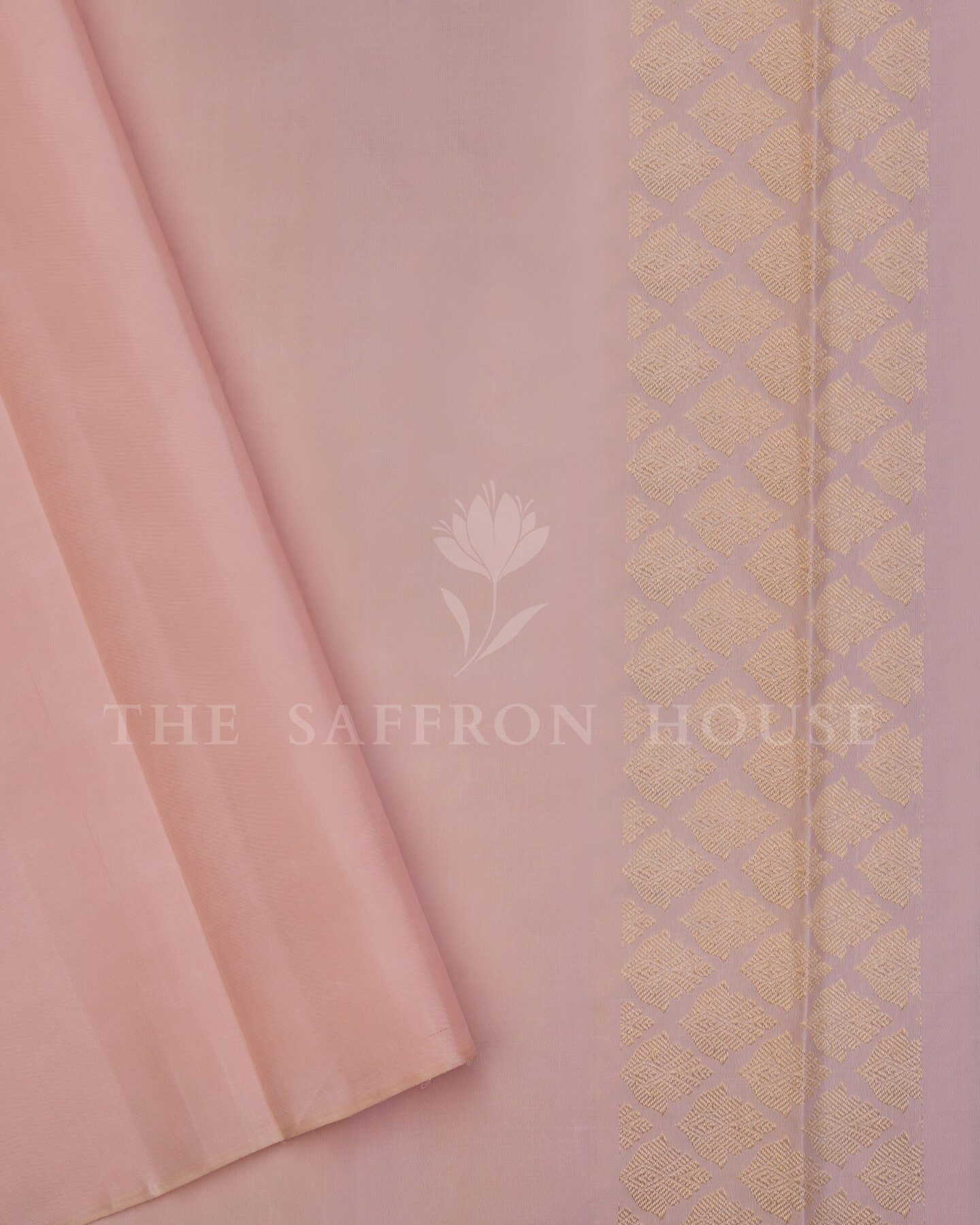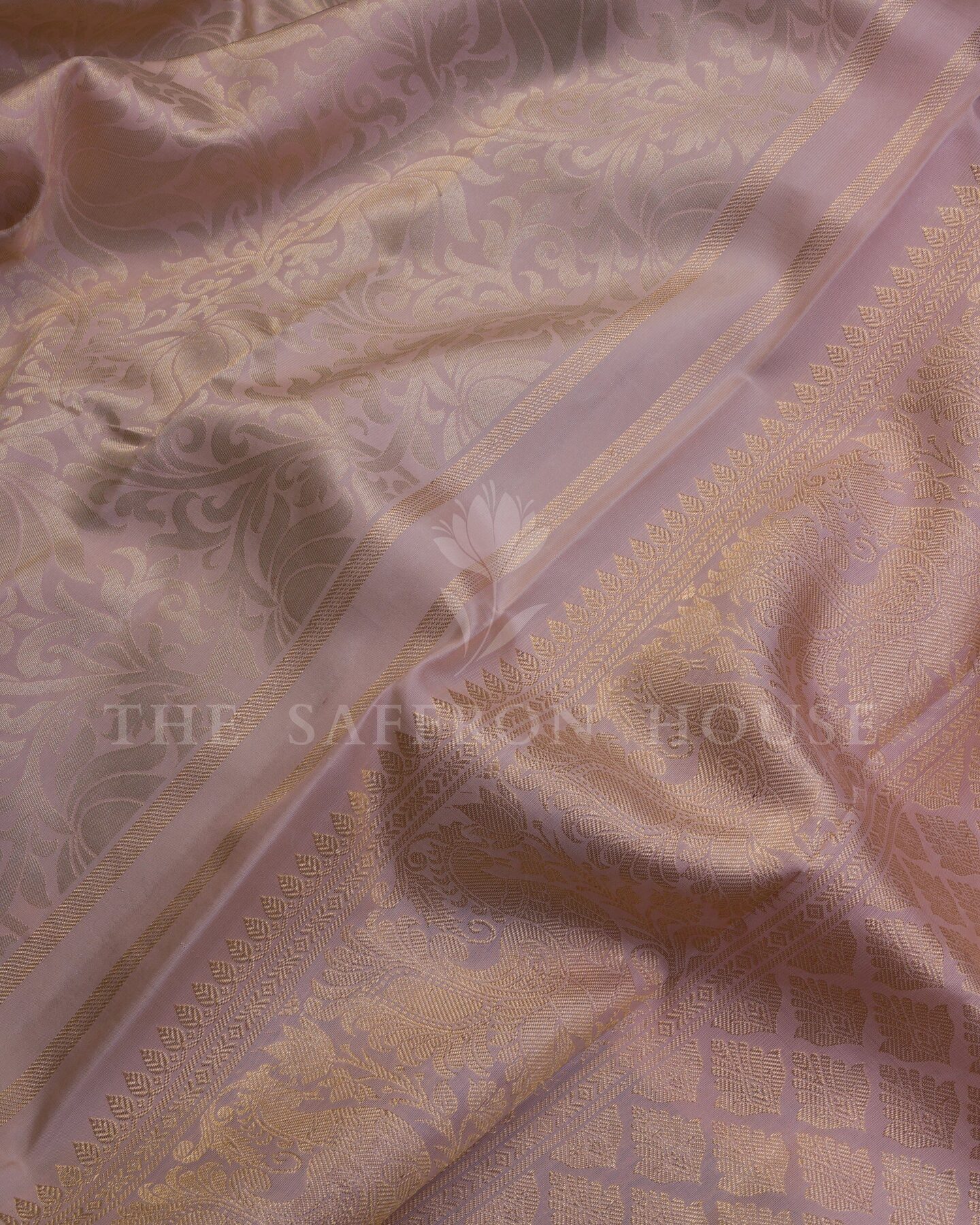 द सैफ्रॉन हाउस की इस खूबसूरत हाफ एंड हाफ कांजीवरम सिल्क साड़ी में आप लाखों की खूबसूरत लगें। पेस्टल मिंट ग्रीन रंग के आधे हिस्से में गहरे हरे रंग की खूबसूरत खड़ी धागों की धारियाँ हैं, जबकि कंट्रास्टिंग पर्ल ब्लश पिंक रंग के आधे हिस्से में हल्के सुनहरे ज़री से खूबसूरती से बुनी गई खूबसूरत फूलों की नसें हैं। खूबसूरत मोर के डिज़ाइन और फूलों के हीरे के पैटर्न से सजा इसका गहरा पर्ल ब्लश पिंक पल्लू एक कालातीत आकर्षण बिखेरता है। पल्लू पर फूलों के हीरे के पैटर्न वाली एक पट्टी वाले सादे पर्ल ब्लश पिंक सिल्क ब्लाउज़ के साथ, यह खूबसूरत बुनाई आपके साड़ी कलेक्शन में एक बेजोड़ जोड़ होगी।