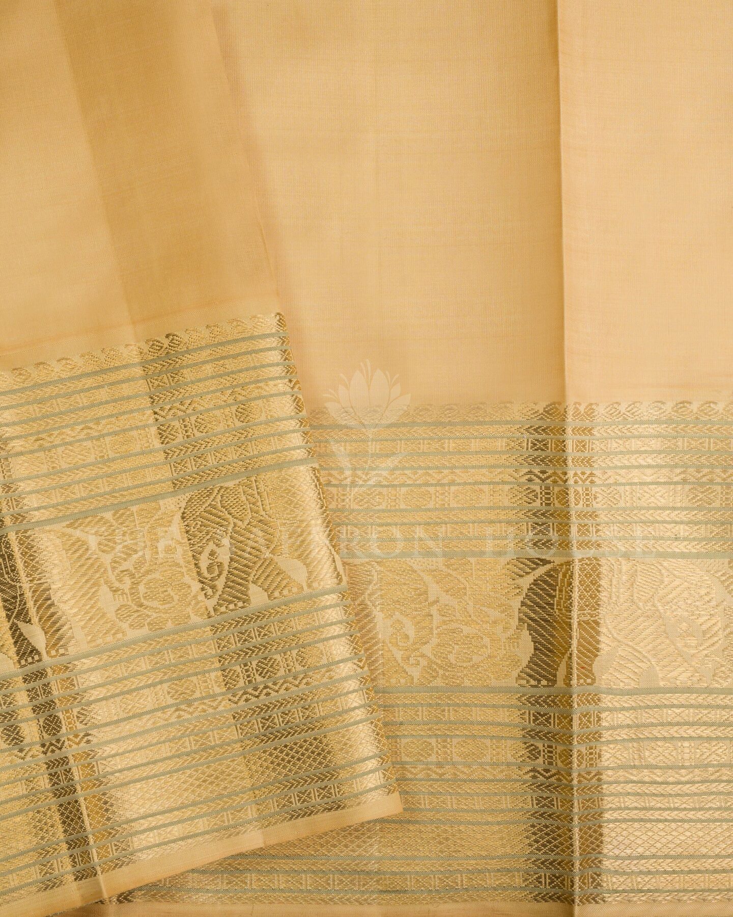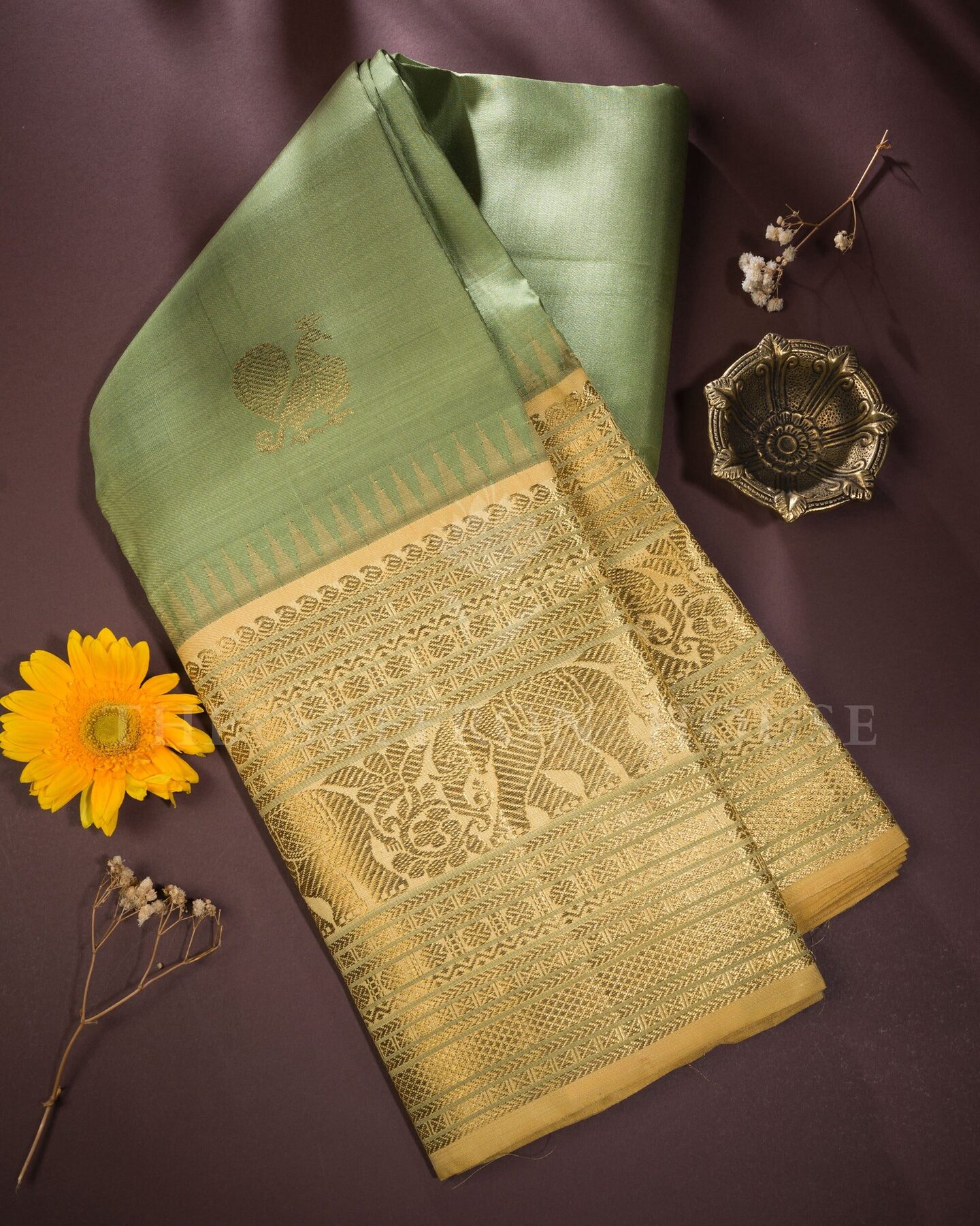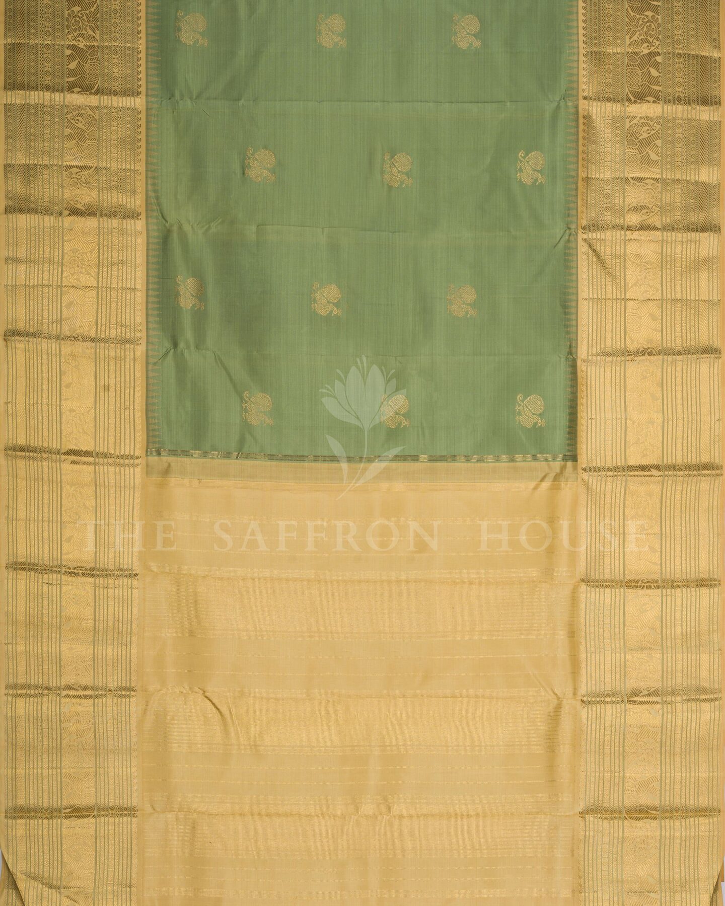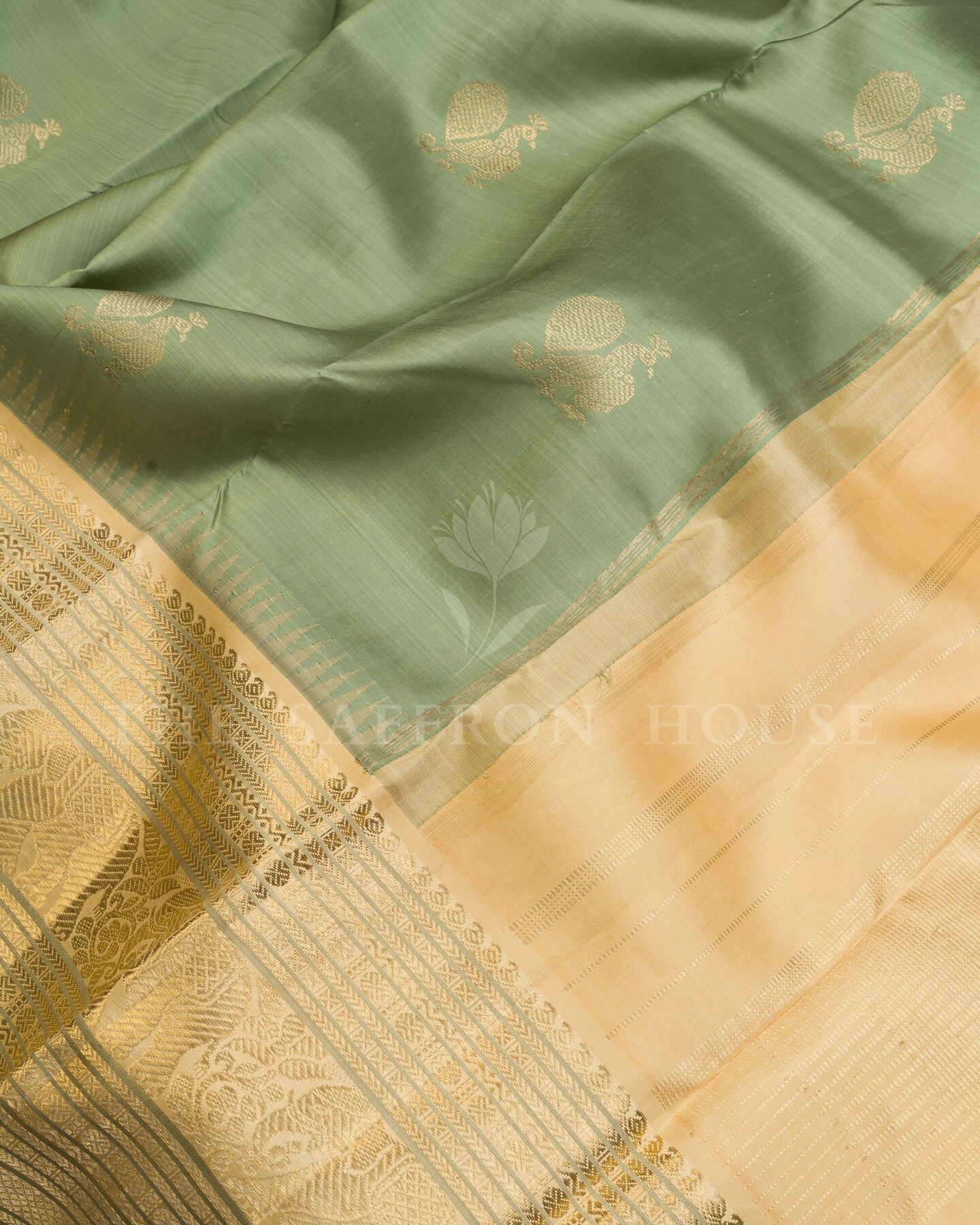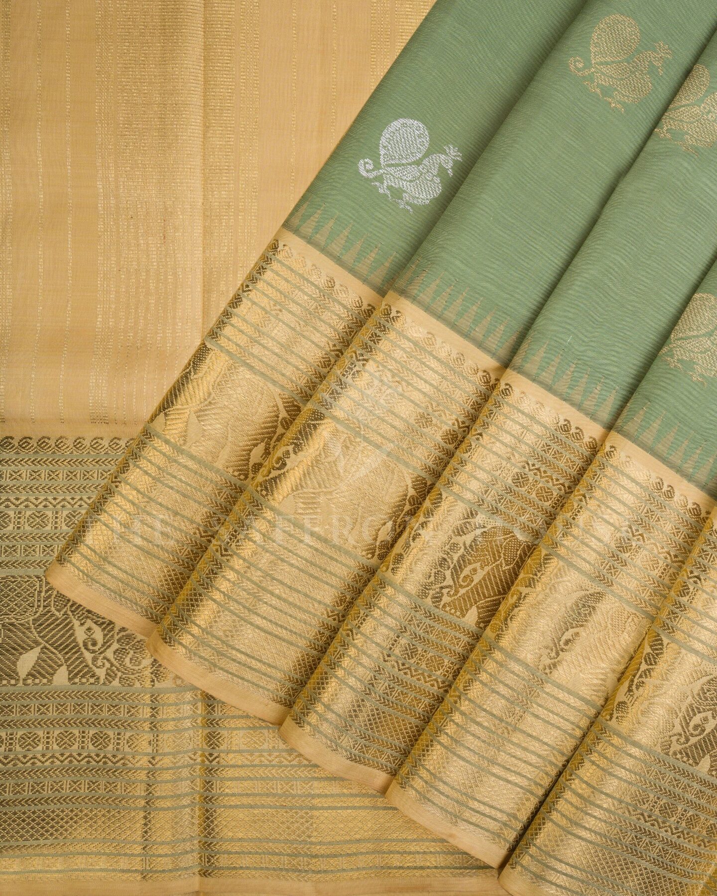 यह अलौकिक कांचीपुरम टिशू सिल्क साड़ी, मुलायम पिस्ता हरे रंग और प्राचीन सोने के मिश्रण से एक स्वप्निल रंग में रंगी है। इसके मुख्य भाग पर चाँदी और ज़री की जटिल मयिल (मोर) आकृतियाँ हैं, जबकि इसके समृद्ध किनारे पर राजसी गज (हाथी) के डिज़ाइन और अलंकृत चौकोर आकृतियाँ हैं, जो समृद्धि, शक्ति और गरिमा का प्रतीक हैं। शादियों, विरासत उपहार और अंतरंग समारोहों के लिए एक आदर्श विकल्प, यह साड़ी परिष्कृत शिल्प कौशल और कालातीत दक्षिण भारतीय परंपरा का प्रमाण है।