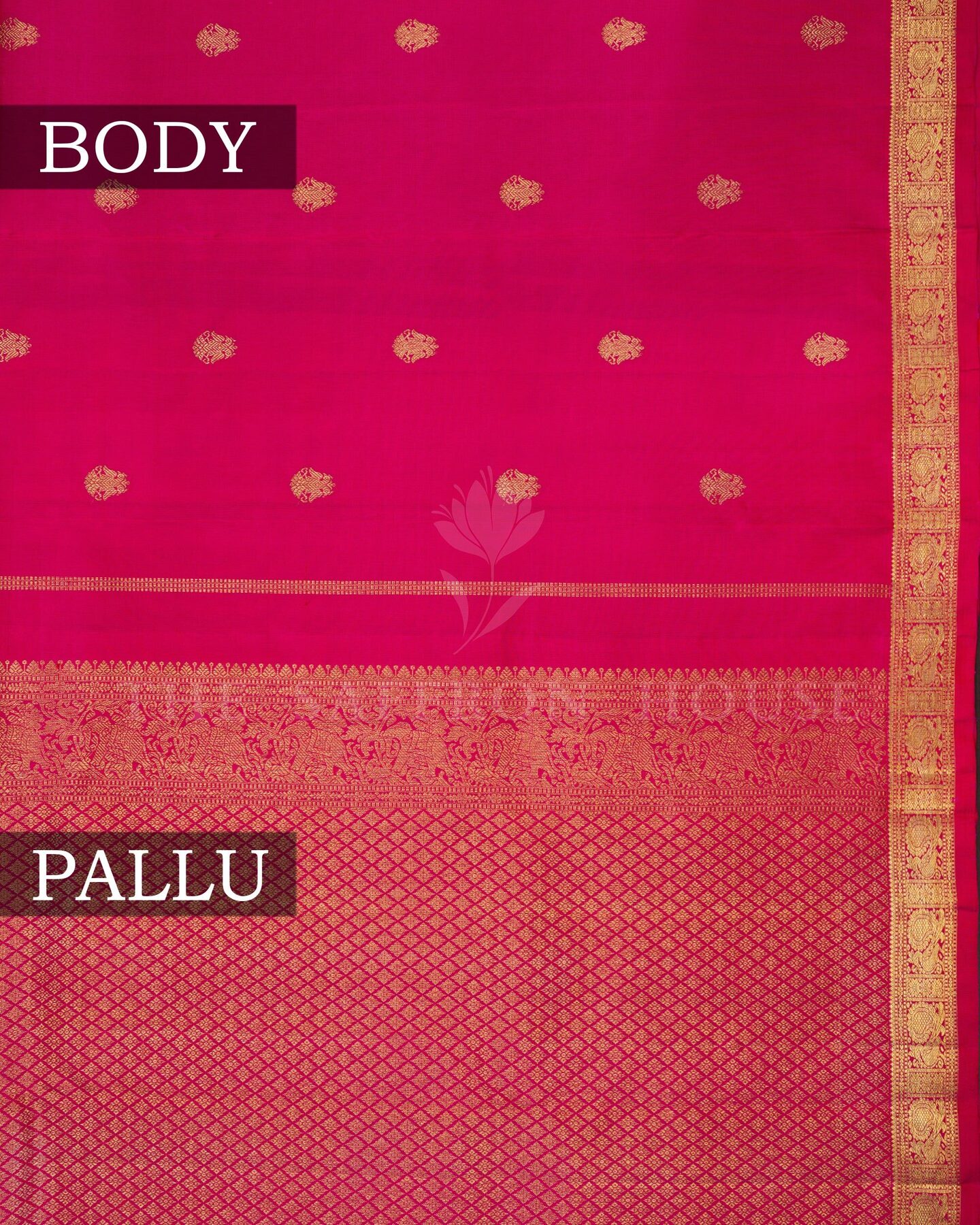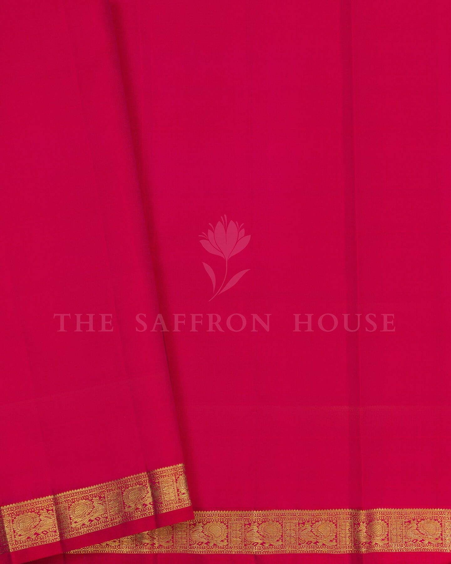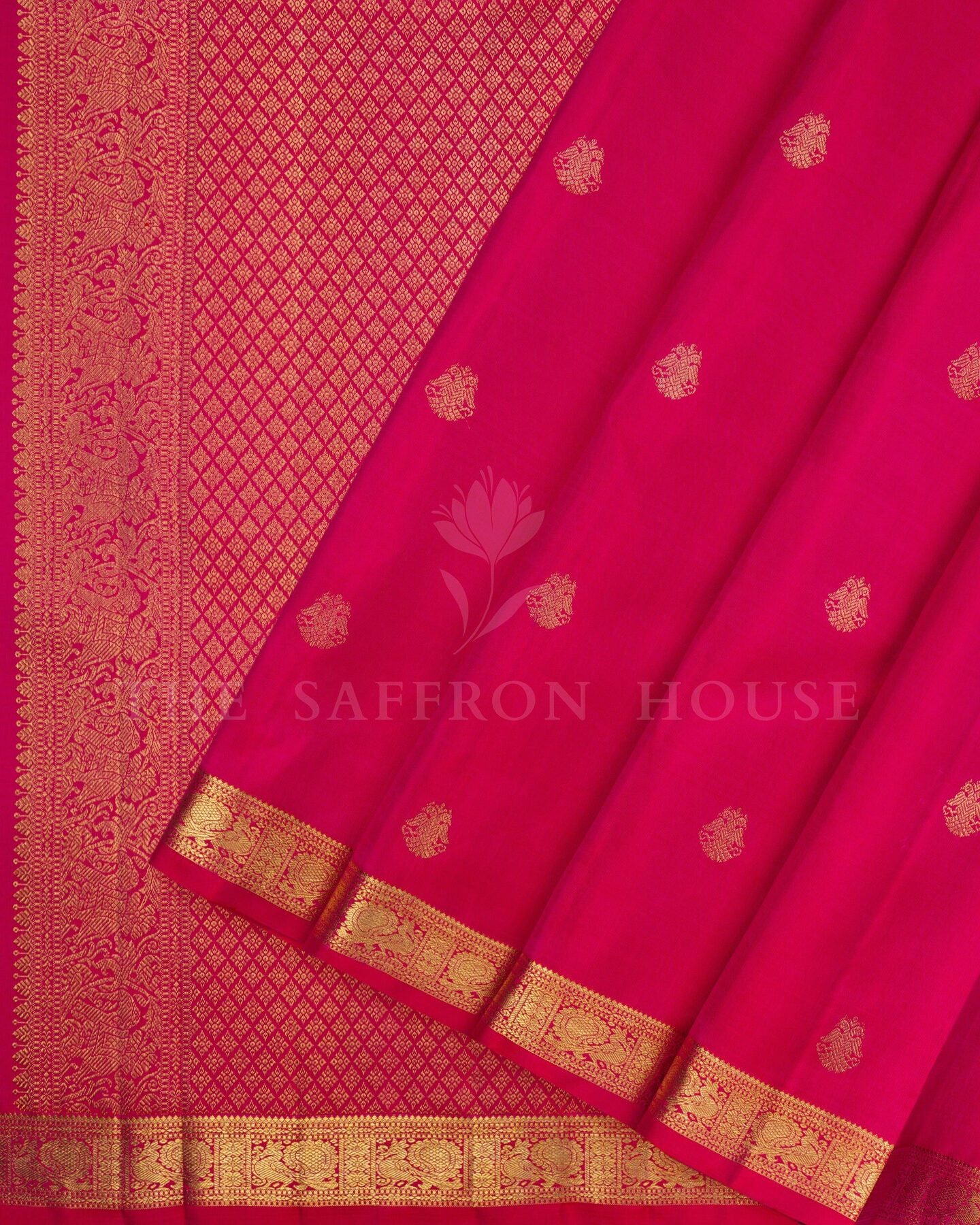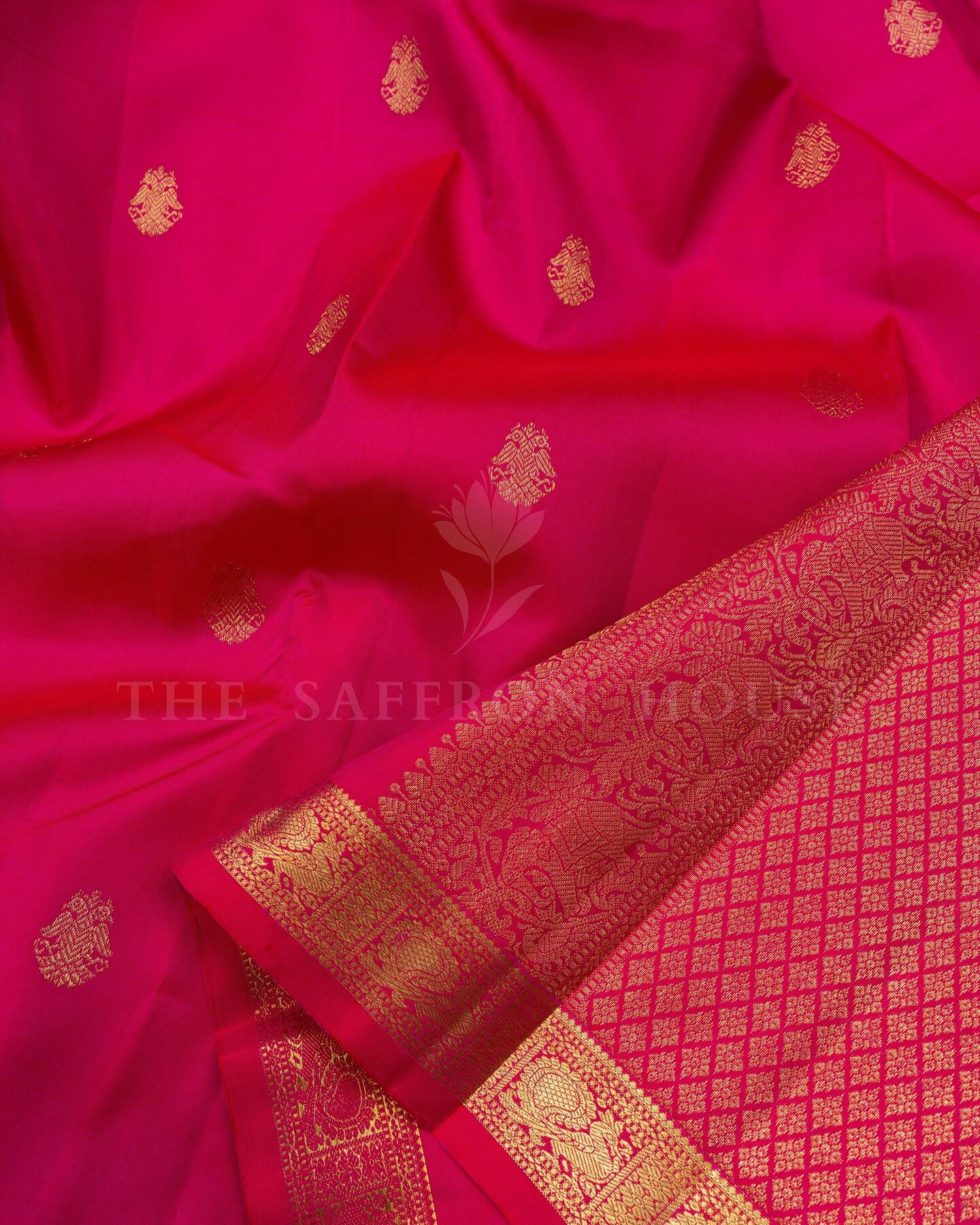 Some colours hold memory. Rani Pink — regal as a queen's court in bloom — becomes something entirely new when woven into pure Kanjivaram silk. This Brocade saree carries that colour with quiet authority and grace.