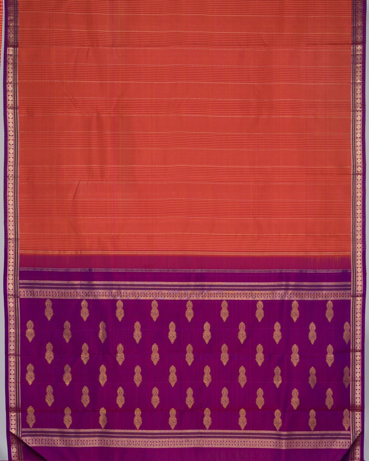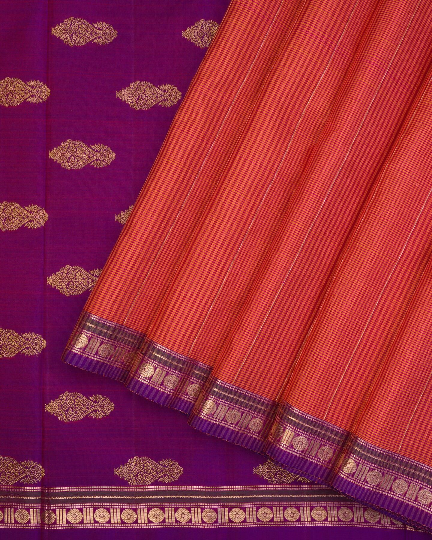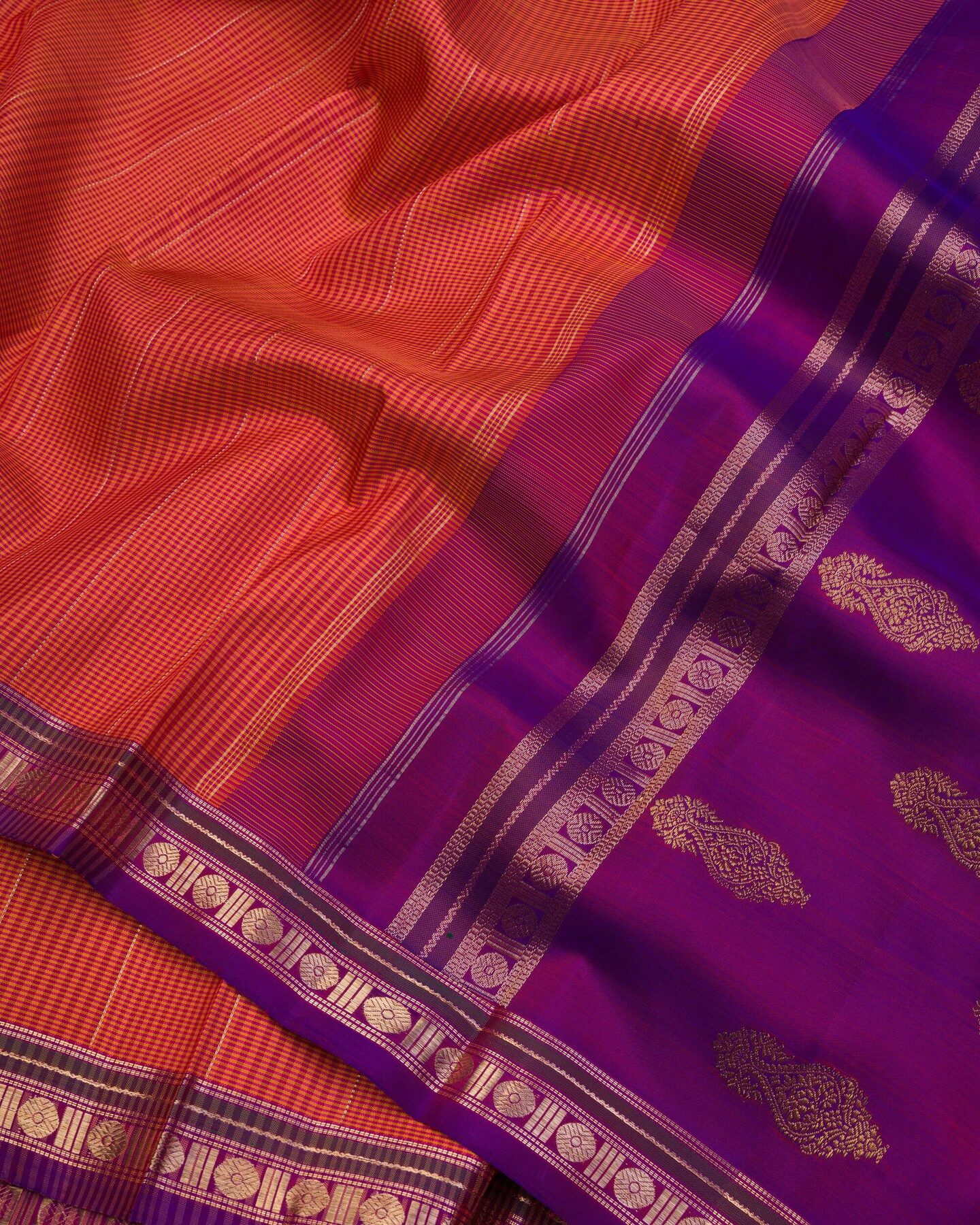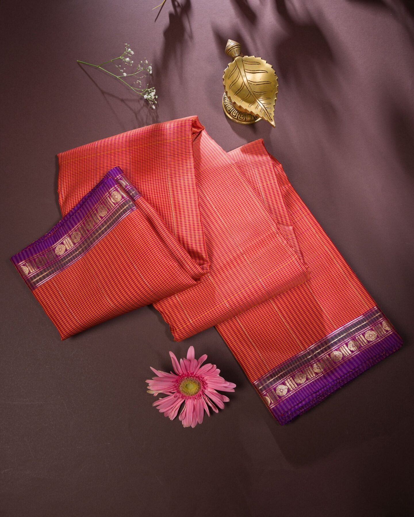 द सैफ्रॉन हाउस की इस रीगल कांजीवरम सिल्क साड़ी में रेशम की समृद्धि को अपने अंदर समाहित कर लीजिए, जिसे अविस्मरणीय पलों के लिए तैयार किया गया है। लाल और पीले रंग के पारंपरिक पोडी कट्टम एक शानदार बनावट वाला डुअल टोन पैटर्न बनाते हैं, जो शरीर को एक आकर्षक लाल-नारंगी रंग प्रदान करते हैं। गहरे बैंगनी रंग के पतले बॉर्डर पर सोने की ज़री से बुने हुए क्लासिक रुद्राक्ष के बूटों से सजी यह साड़ी एक शानदार और आकर्षक लुक देती है। सोने की ज़री से बुने हुए फूलों के बूटों के डिज़ाइन, सुंदर बैंगनी पल्लू को सजाते हैं, जो एक शाही आकर्षण बिखेरते हैं। मैचिंग बॉर्डर वाले सादे गहरे बैंगनी रंग के सिल्क ब्लाउज़ के साथ, यह बुनाई सभी उत्सवों और समारोहों में आपका सदाबहार साथी बनेगी।