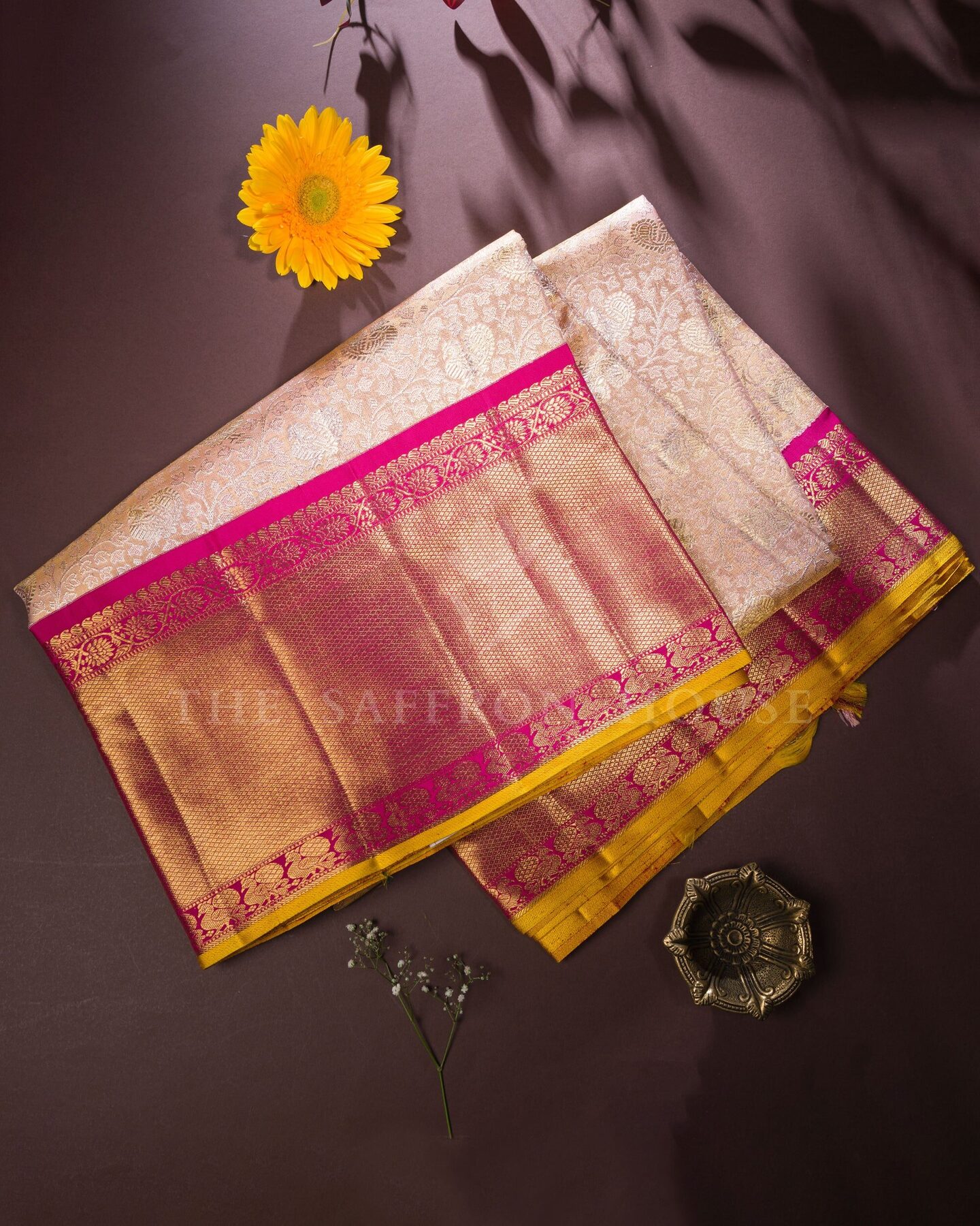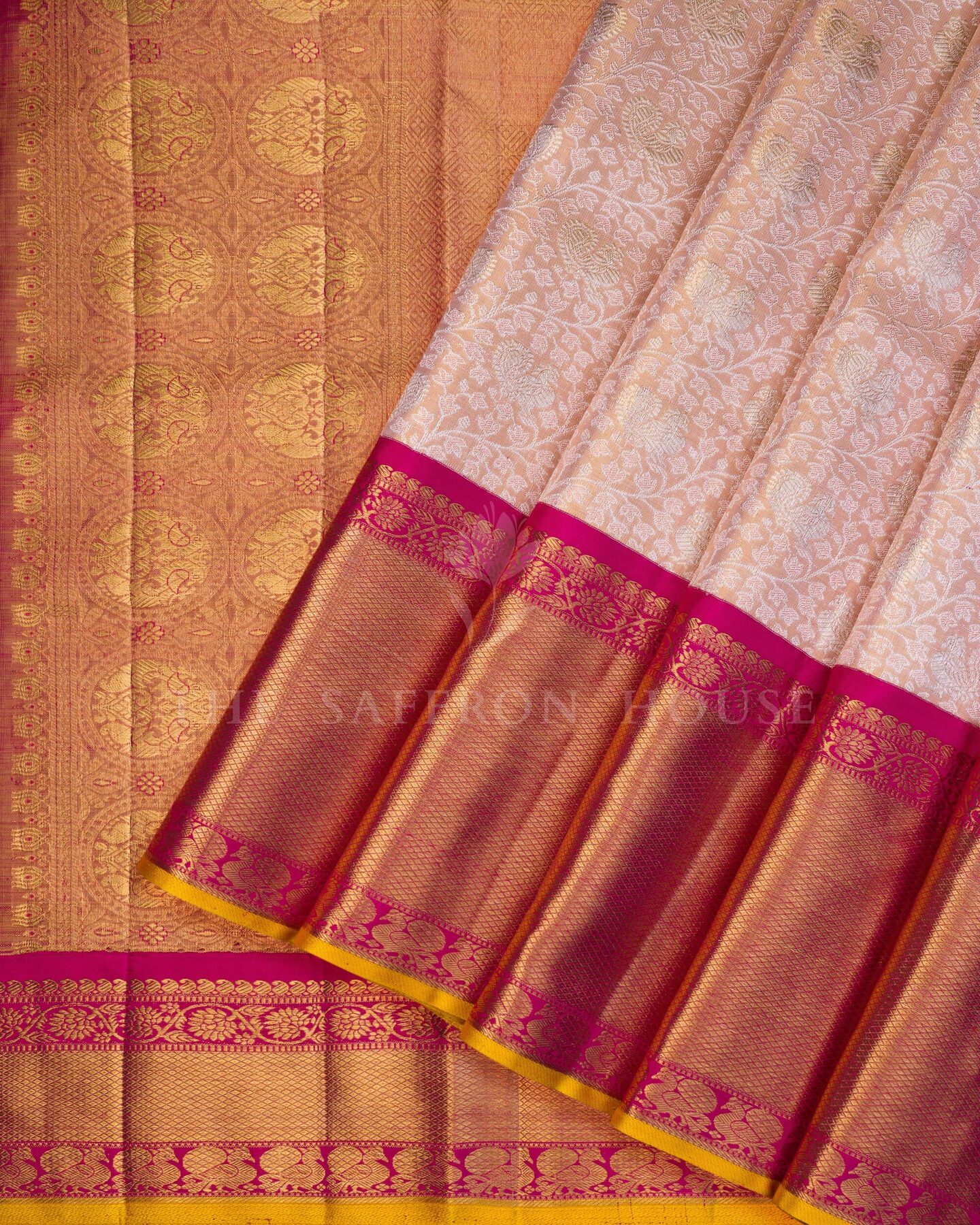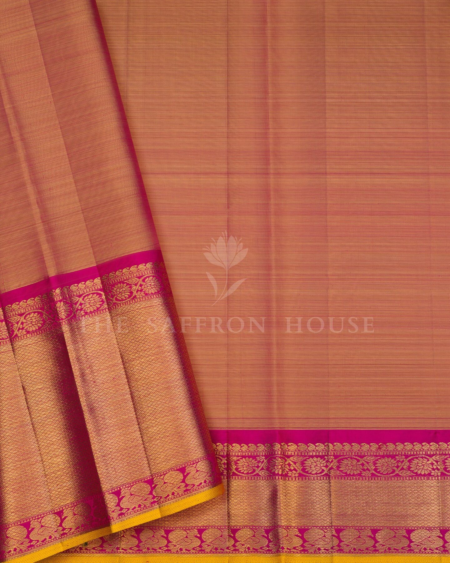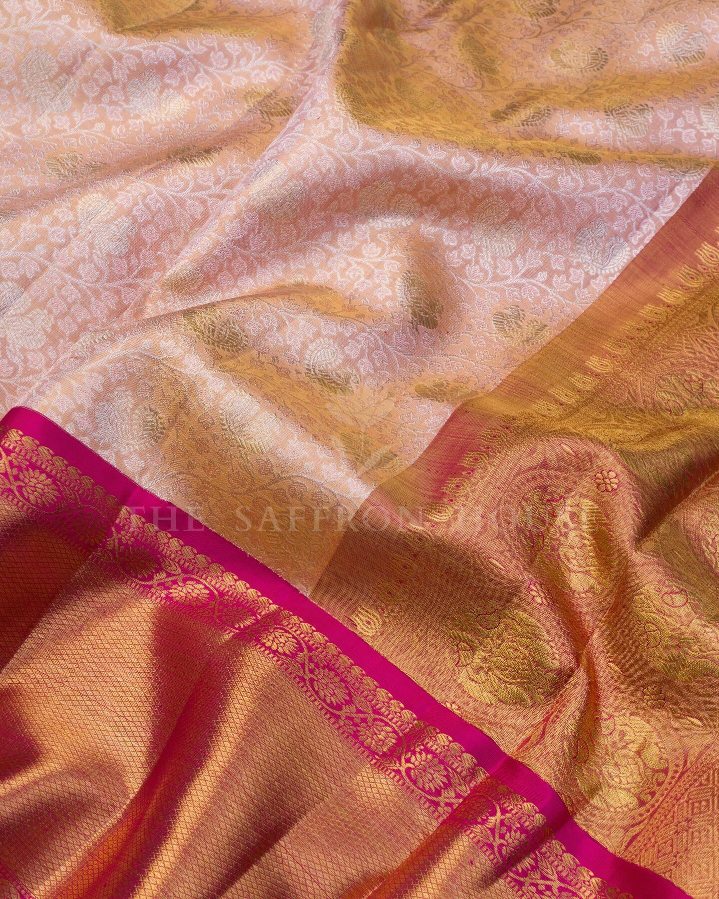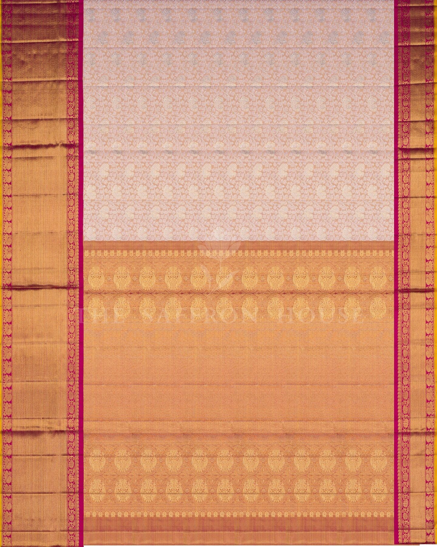 द सैफ्रॉन हाउस की इस खूबसूरत कांजीवरम सिल्क साड़ी में सॉफ्ट रोज़ पिंक और मैजेंटा पिंक रंग में सबका ध्यान अपनी ओर आकर्षित करें। हल्के गुलाबी रंग के साथ एक सूक्ष्म हाथीदांत रंग की झलक के साथ, इस खूबसूरत साड़ी के शरीर पर एक आकर्षक चमक और एक उत्तम पुष्प जाल पैटर्न के साथ-साथ चांदी और सोने की ज़री से बुने हुए सूक्ष्म आम के बूटे हैं। एक आकर्षक सरसों के रंग के किनारे के साथ विपरीत मैजेंटा गुलाबी बॉर्डर को सोने की ज़री से बुने हुए पुष्प शिराओं, रेट्टाई नेल्ली और महीन मायिलकन पैटर्न की ज़री पट्टियों से सजाया गया है। भव्य तांबे जैसे नारंगी रंग के पल्लू में पारंपरिक चक्र, रुद्राक्ष और पाई माड़ी के डिज़ाइन हैं, जो चमकदार सुनहरे ज़ई से बुने हुए हैं। मैचिंग बॉर्डर वाले सादे मैजेंटा सिल्क ब्लाउज़ के साथ, यह उत्तम बुनाई निश्चित रूप से आपकी पसंदीदा बन जाएगी।