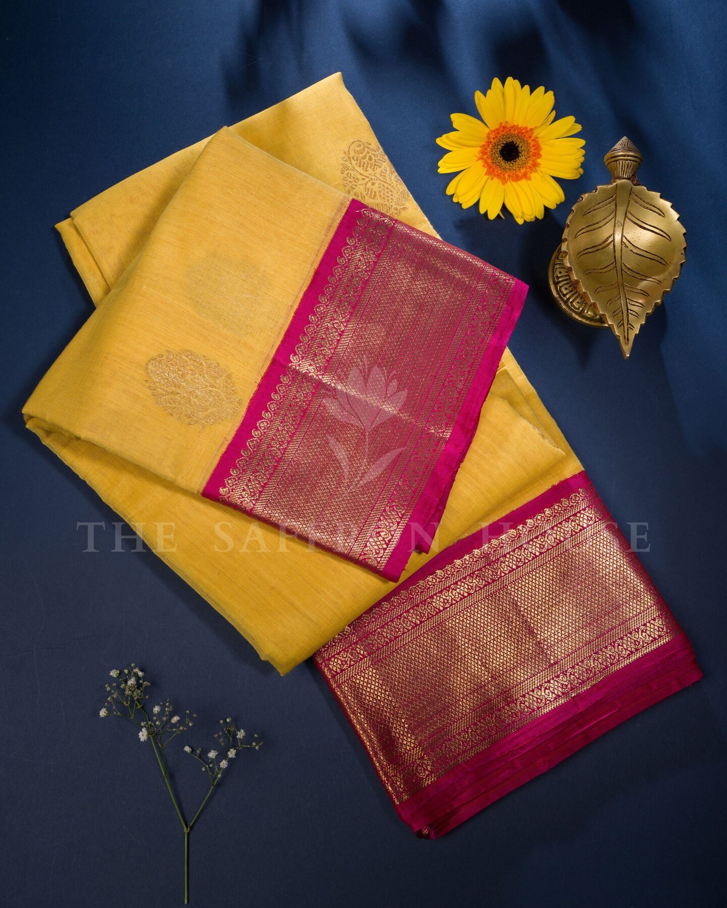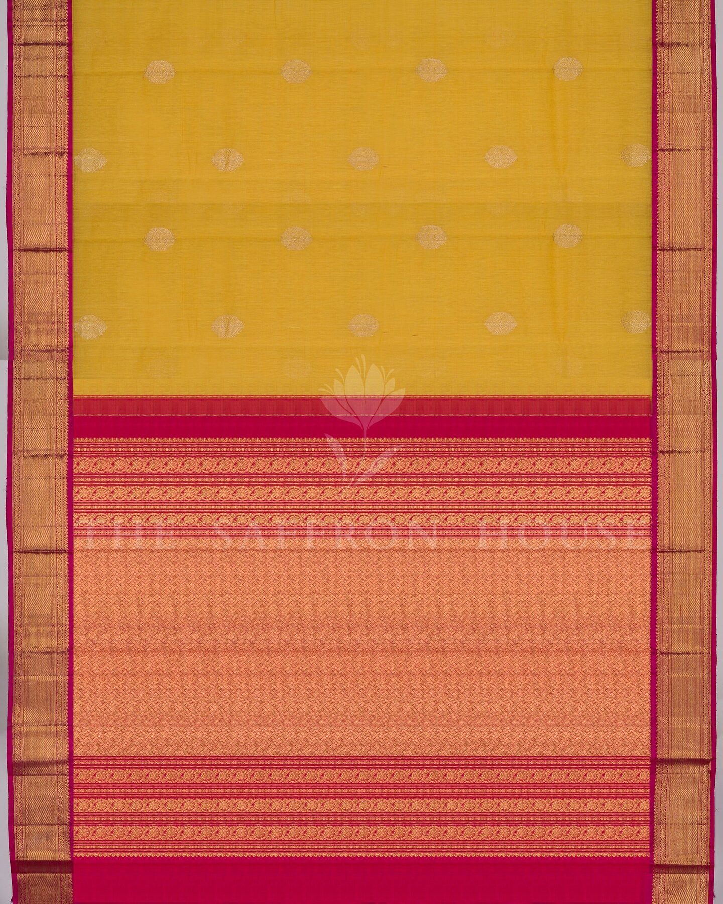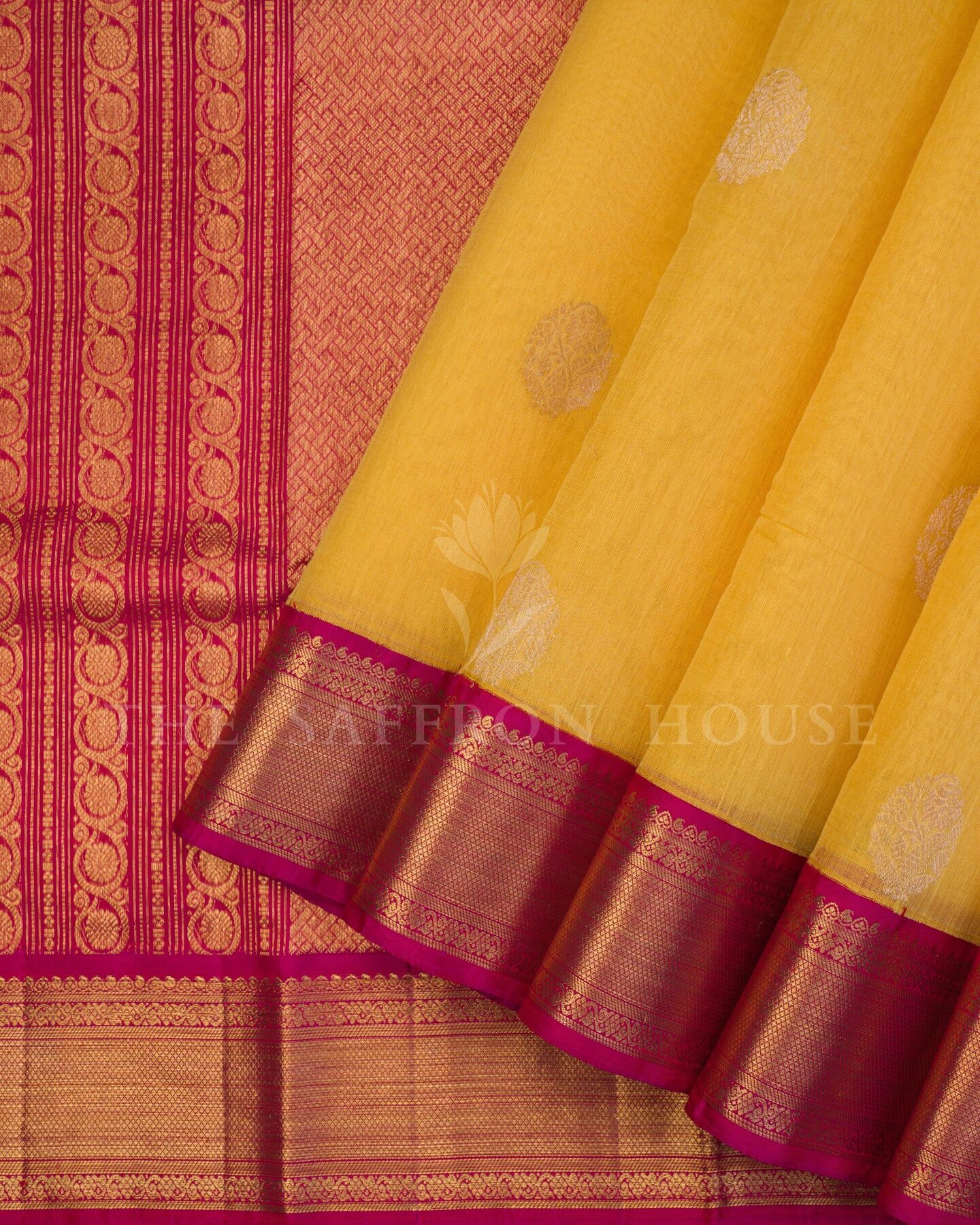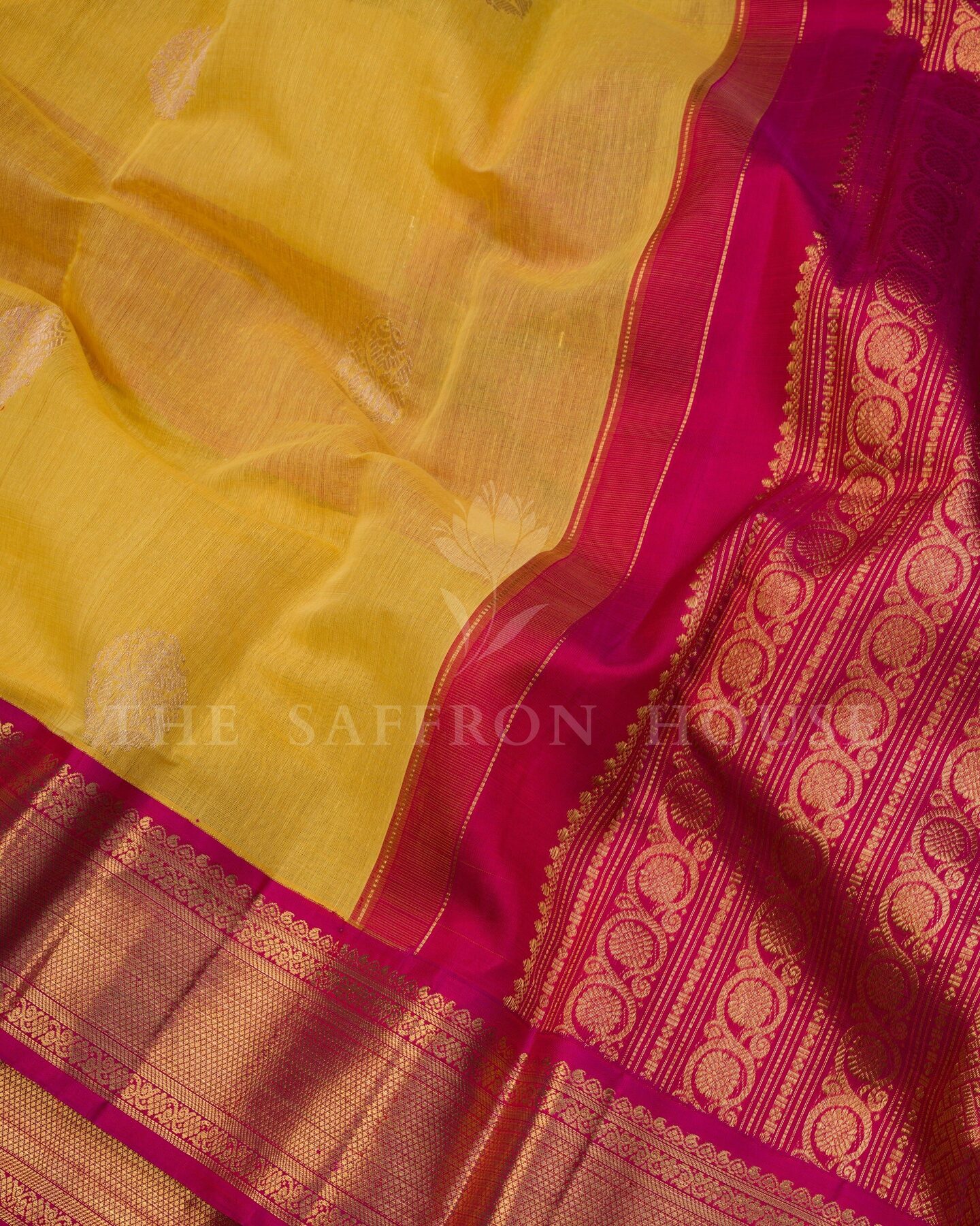 द सैफ्रॉन हाउस की इस खूबसूरत कांजीवरम लेनिन सिल्क साड़ी के साथ हर परिधान में भव्यता का जश्न मनाएँ। इसका प्यारा पीला शरीर पारंपरिक वैभव का एहसास देता है, जिसे सोने की ज़री से बुने हुए आकर्षक गोल फूलों के बूटों से सजाया गया है। इसके विपरीत रानी गुलाबी बॉर्डर पर सोने की ज़री से बुने हुए क्लासिक कुयिल कन्न और कोडी विसिरी पैटर्न हैं। भव्य रानी गुलाबी पल्लू पर खूबसूरत पाई माडी पैटर्न के साथ-साथ सुरुचिपूर्ण कोडी विसिरी पैटर्न की पंक्तियाँ हैं, जो इसे एक कालातीत आकर्षण प्रदान करती हैं। मैचिंग बॉर्डर वाले सादे रानी गुलाबी सिल्क ब्लाउज़ के साथ, यह शानदार बुनाई हर पल को यादगार बना देगी।