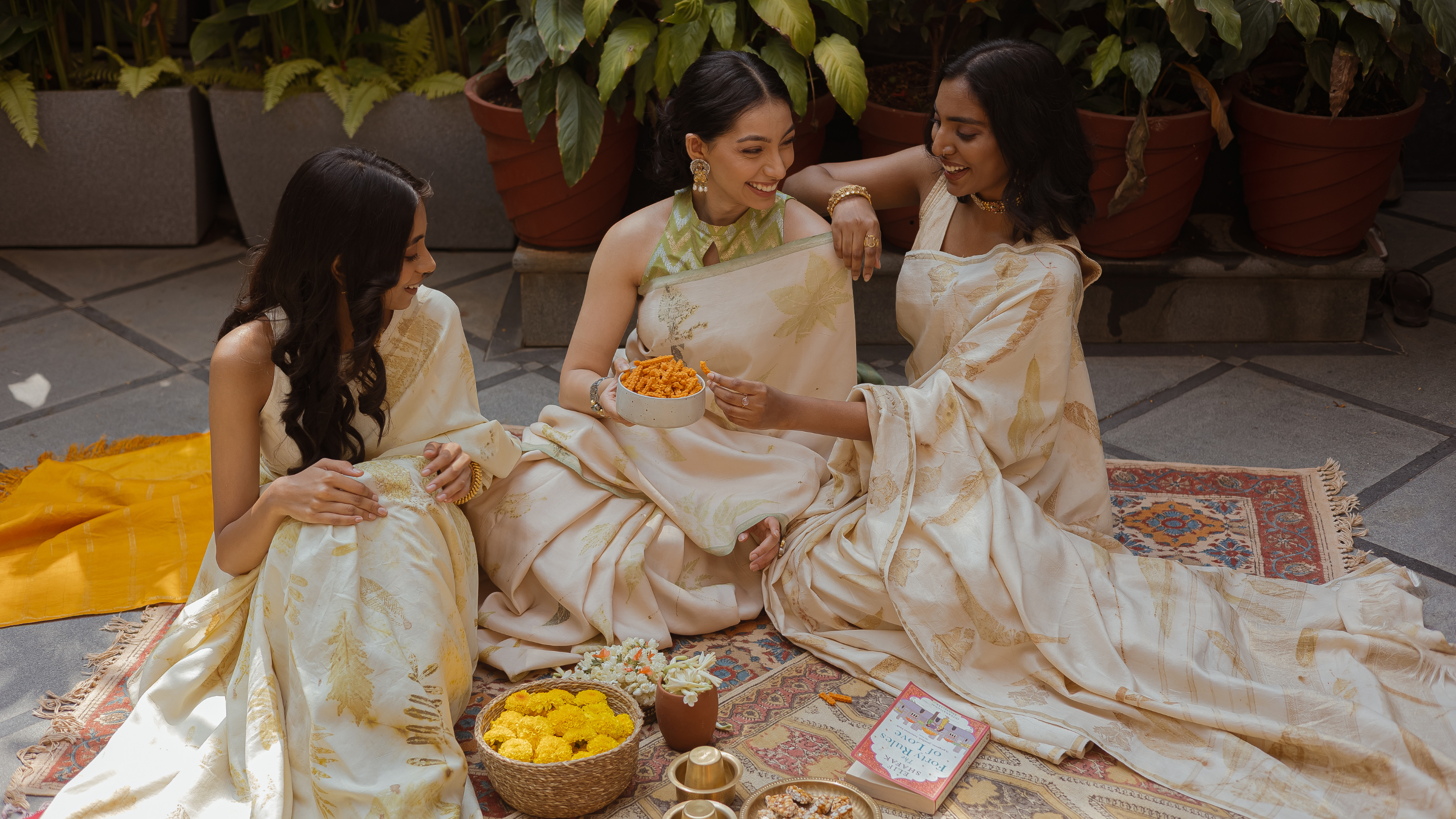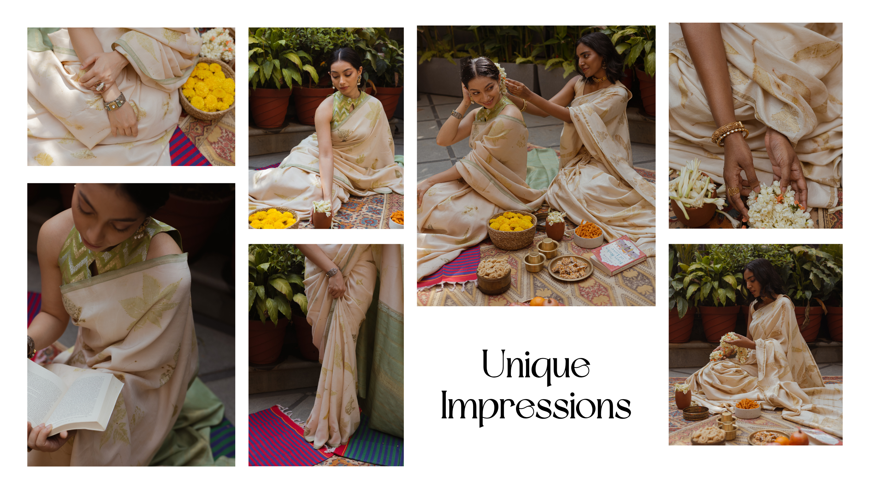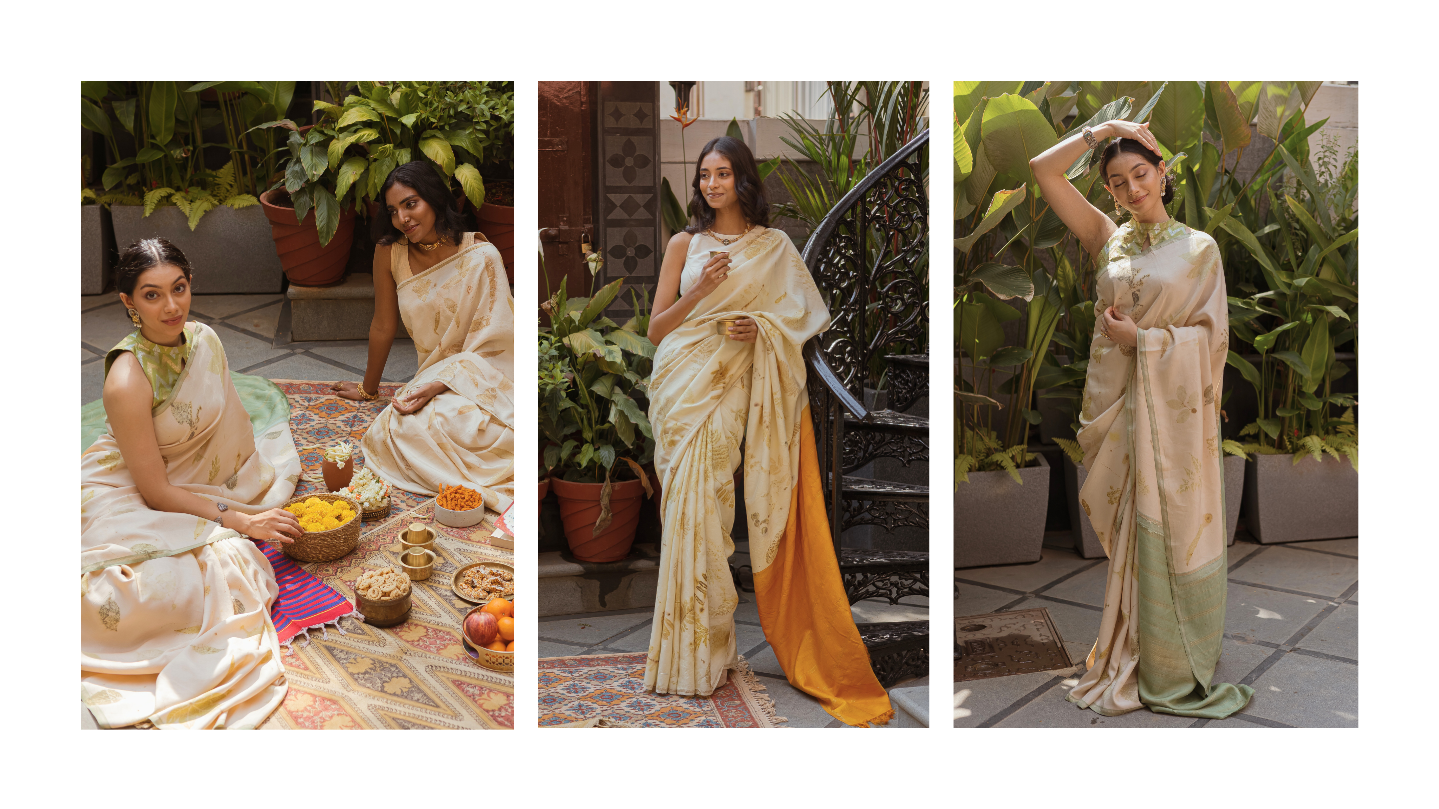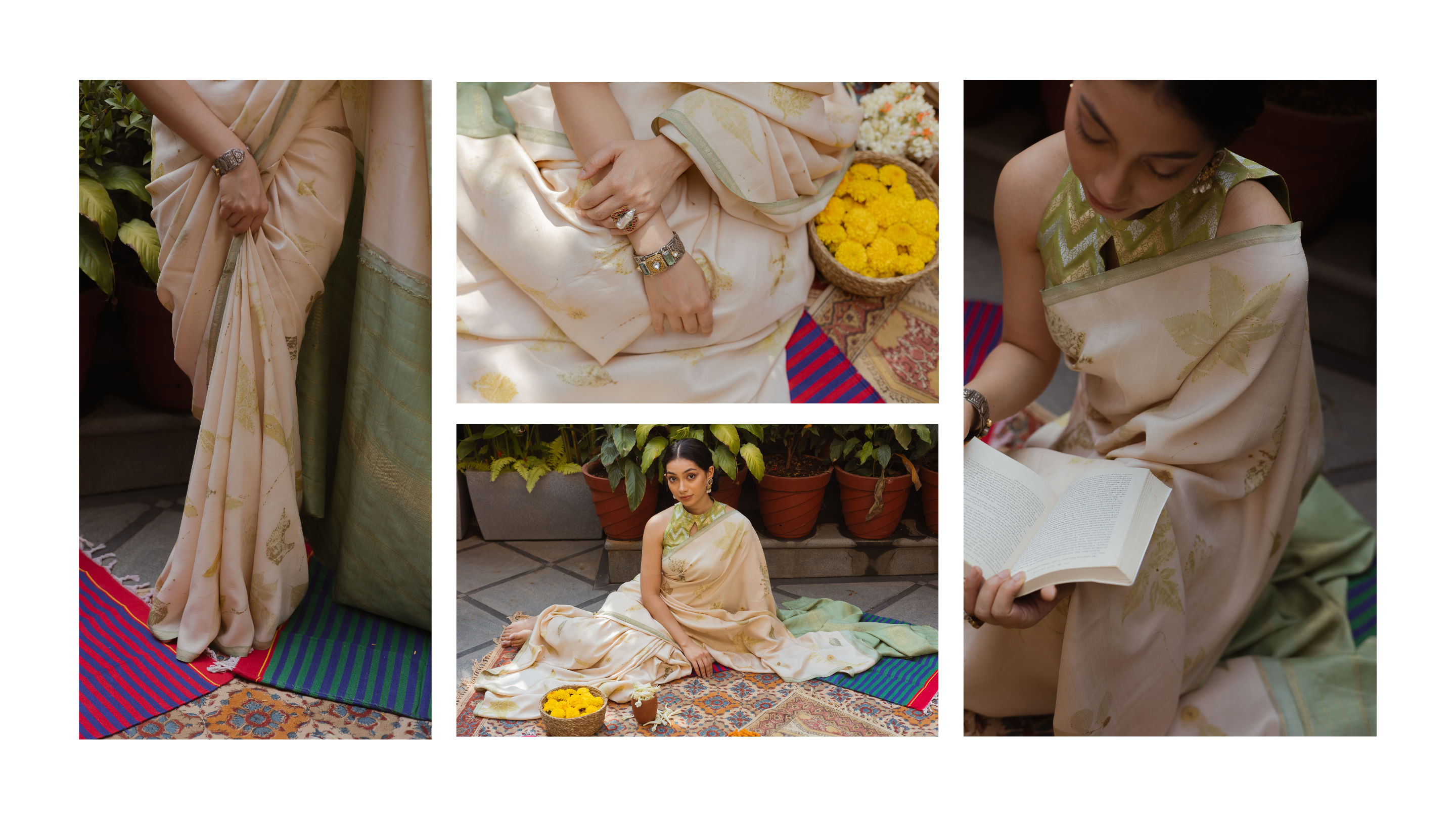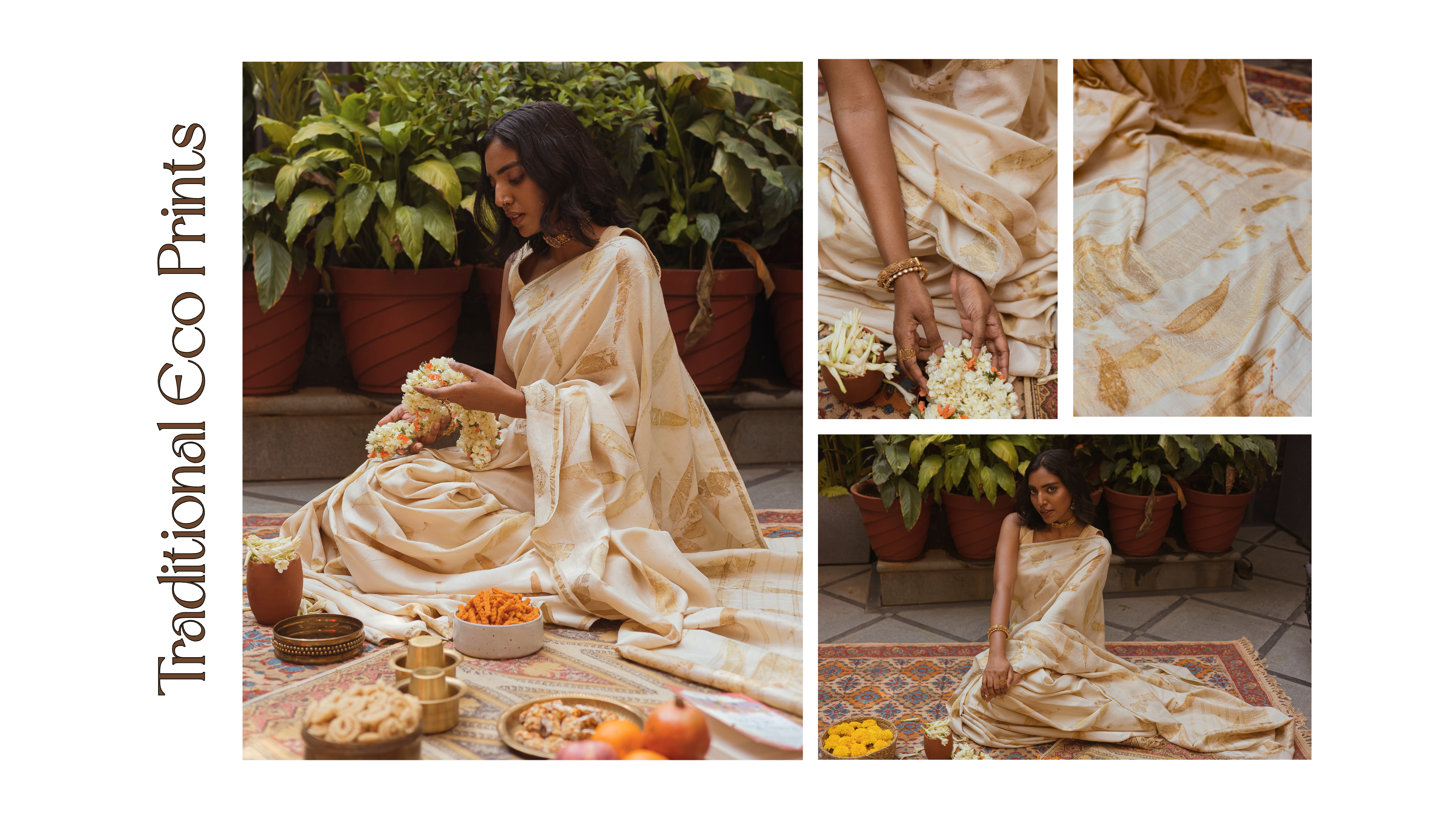 Our Eco Print Sarees are imprinted with the soul of the earth - real leaves, petals, and twigs pressed onto silk using traditional dyeing techniques. Each impression is fleeting but forever etched into the fabric— a celebration of imperfections, individuality, and the poetry of slow craft.