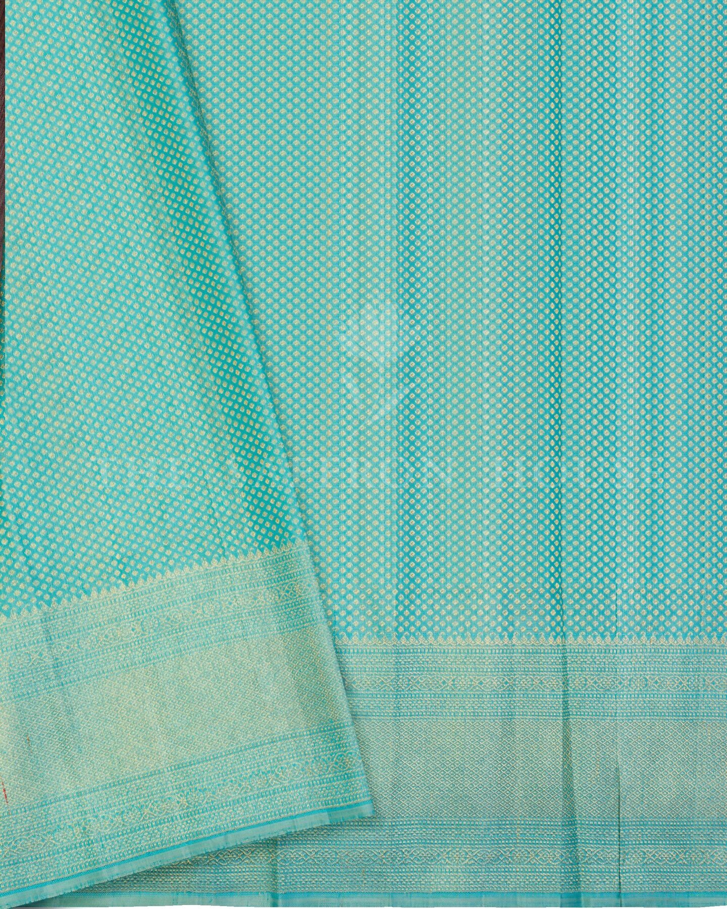 The body is woven with intricate traditional motifs, each thread placed with precision and purpose. A richly woven border frames the drape with confident definition, while gold zari runs through the weave, catching light the way temple gold does — slowly, deeply, unforgettably.