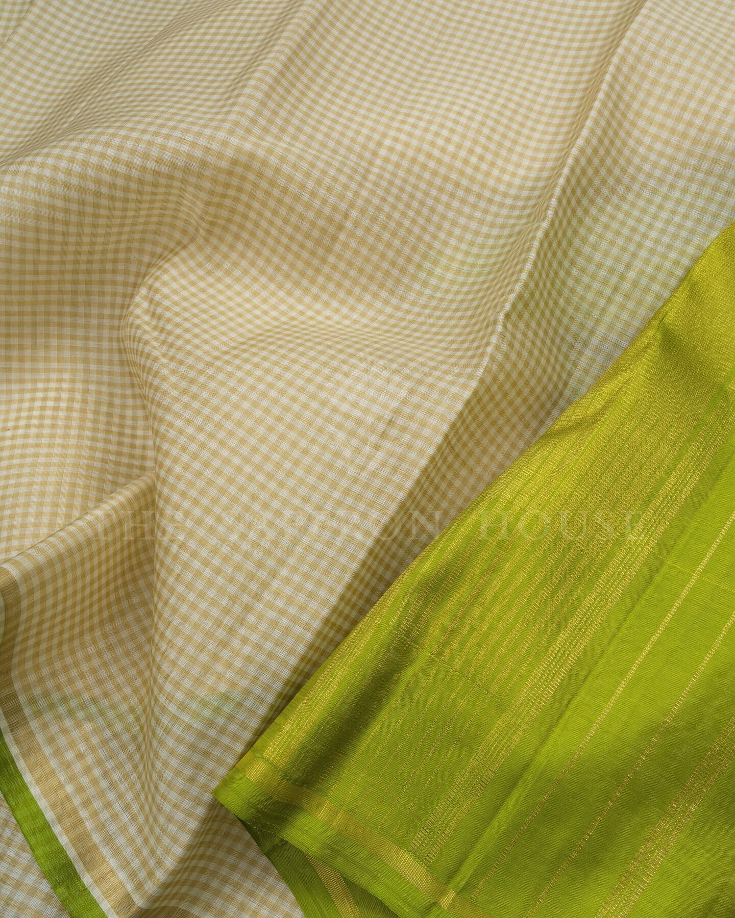 The body is adorned with small kattam checks, each thread placed with precision and purpose. The parrot green border frames the drape with confident definition, while real zari runs through the weave, catching light the way temple gold does — slowly, deeply, unforgettably.