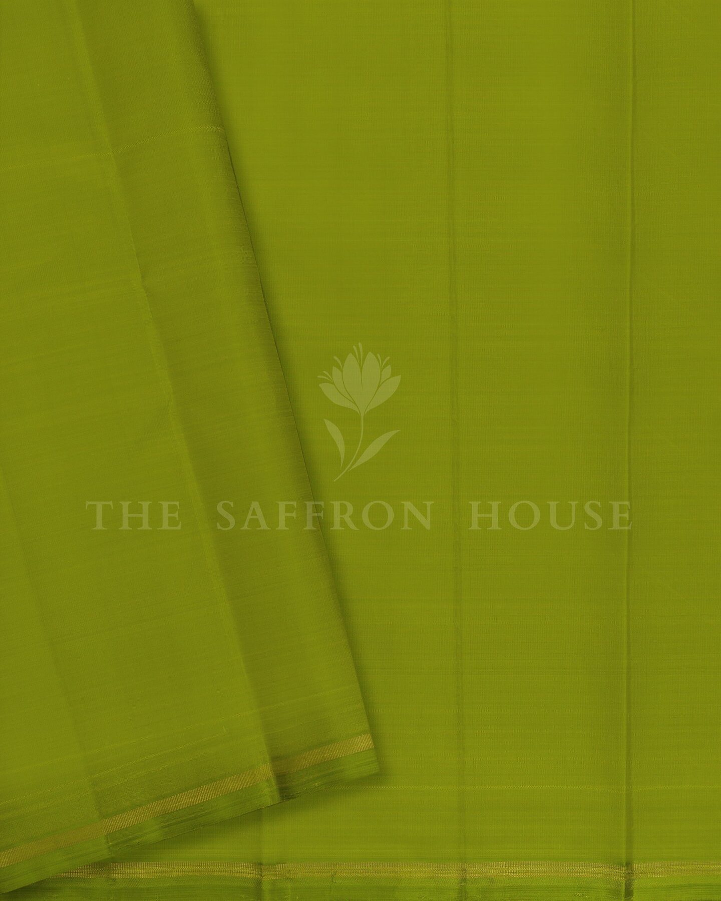 There is something about the interplay of beige and parrot green that feels both ancient and alive. This Kattam Kanjivaram silk saree opens with radiant in its own quiet way, its surface shimmering with the unhurried rhythm of the loom.