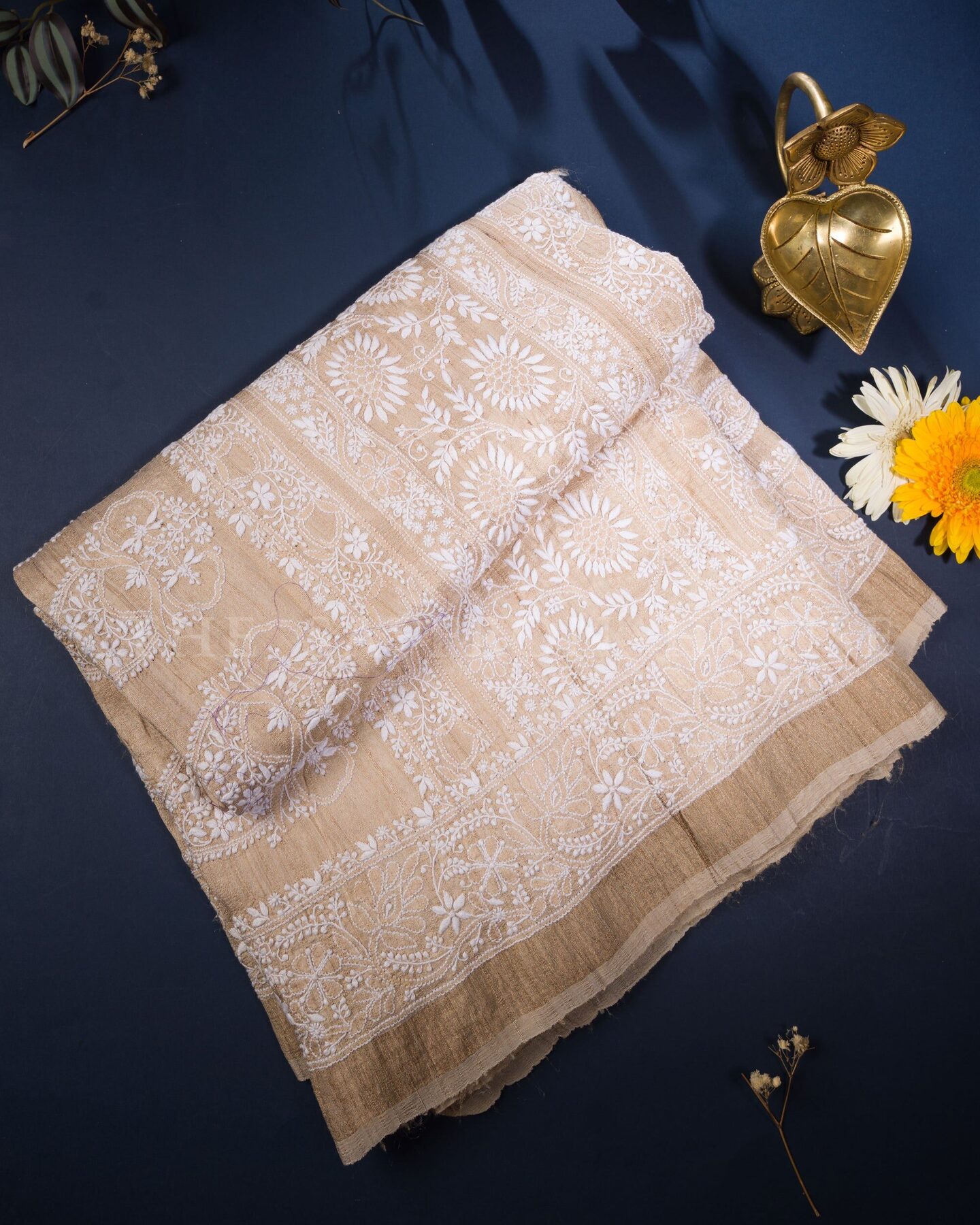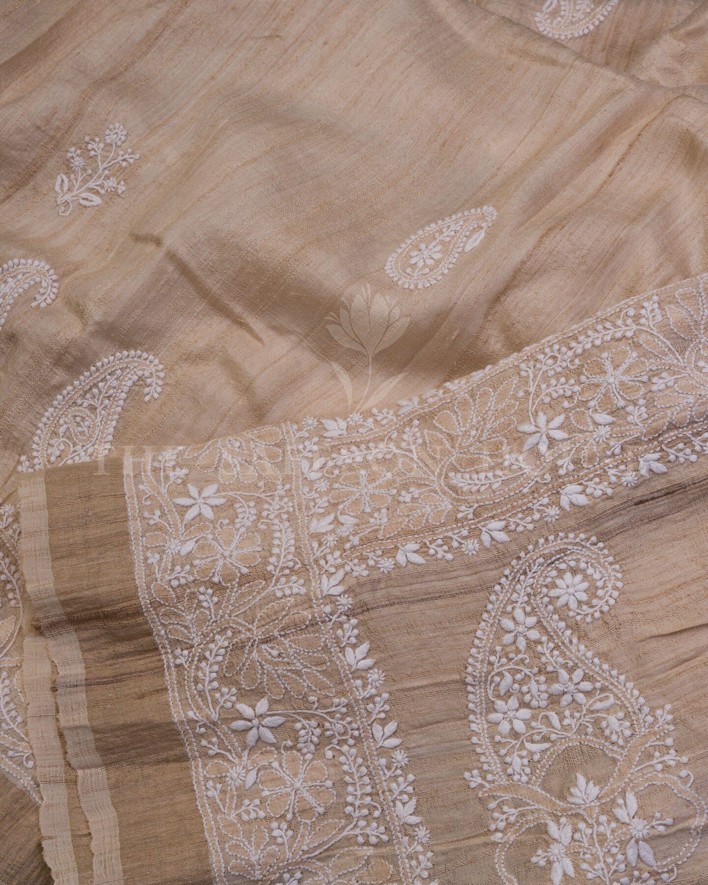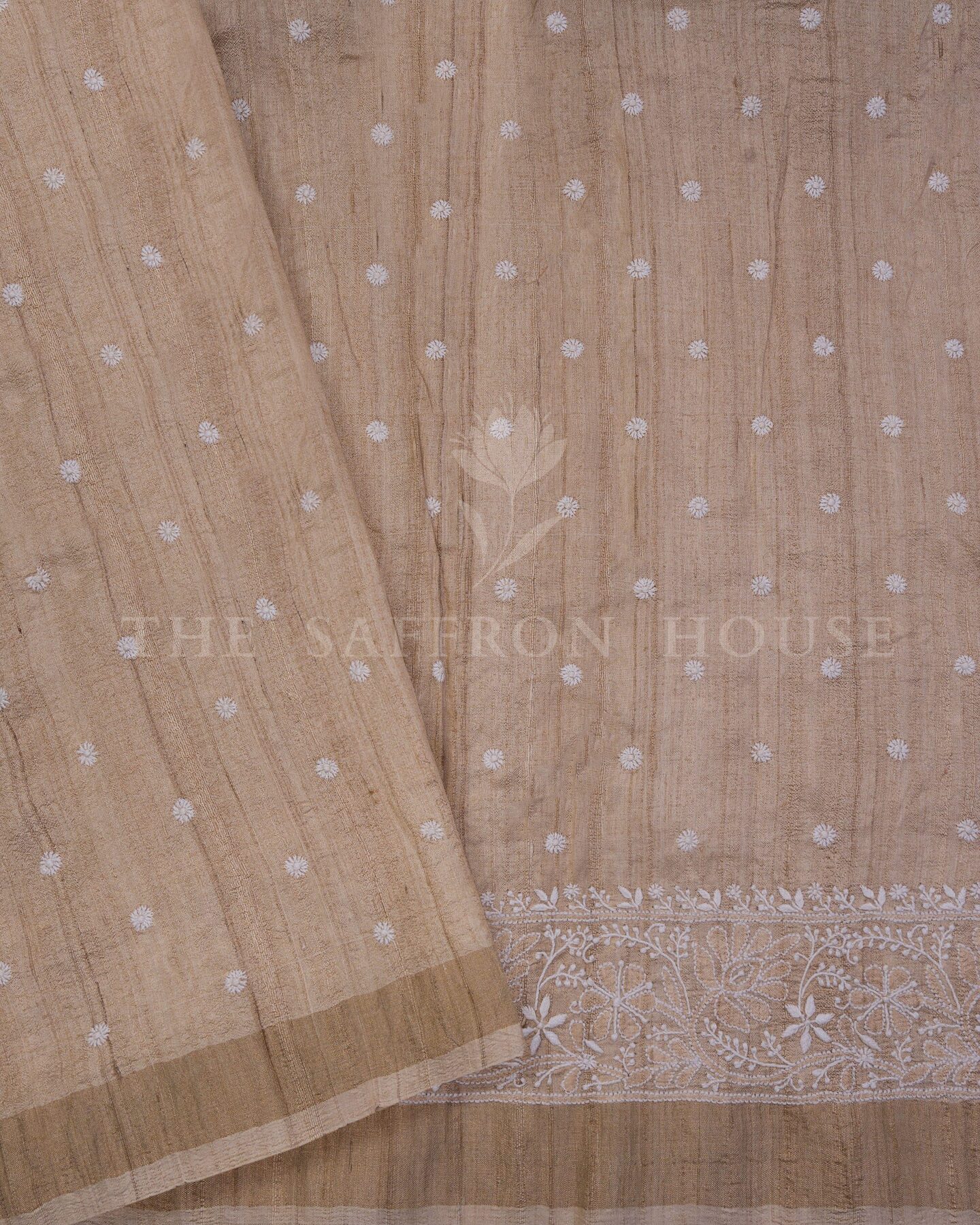 Desi Tussar silk is known for its natural texture, matte sheen, and breathability.. Woven in Bhagalpur, Bihar, and embroidered by skilled artisans in Lucknow, this saree brings together two legacies—Tussar weaving and Chikankari embroidery—in one graceful drape.