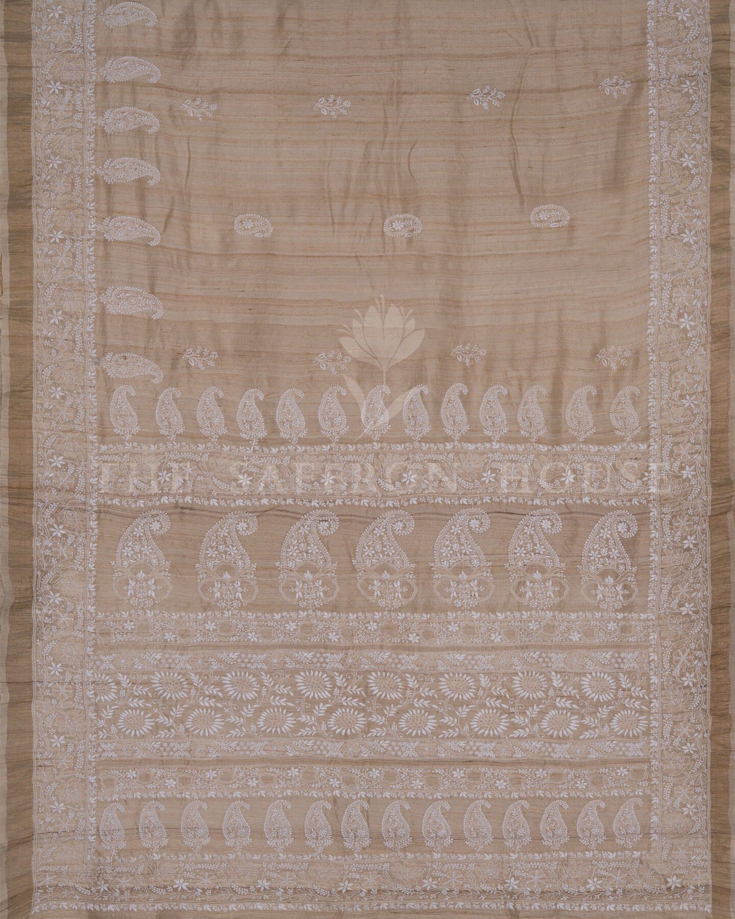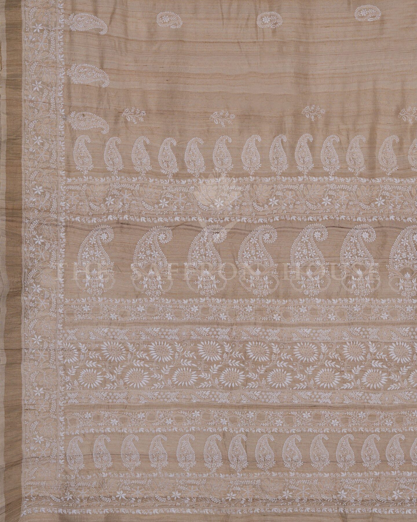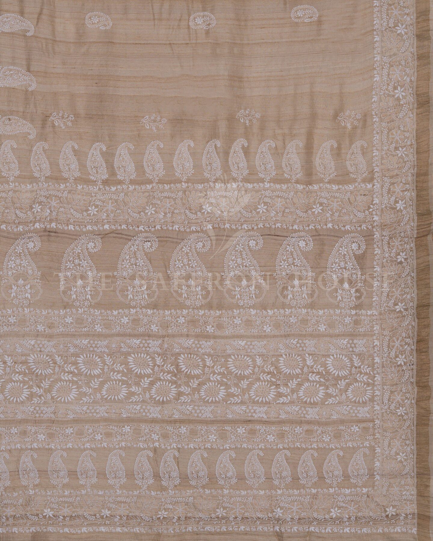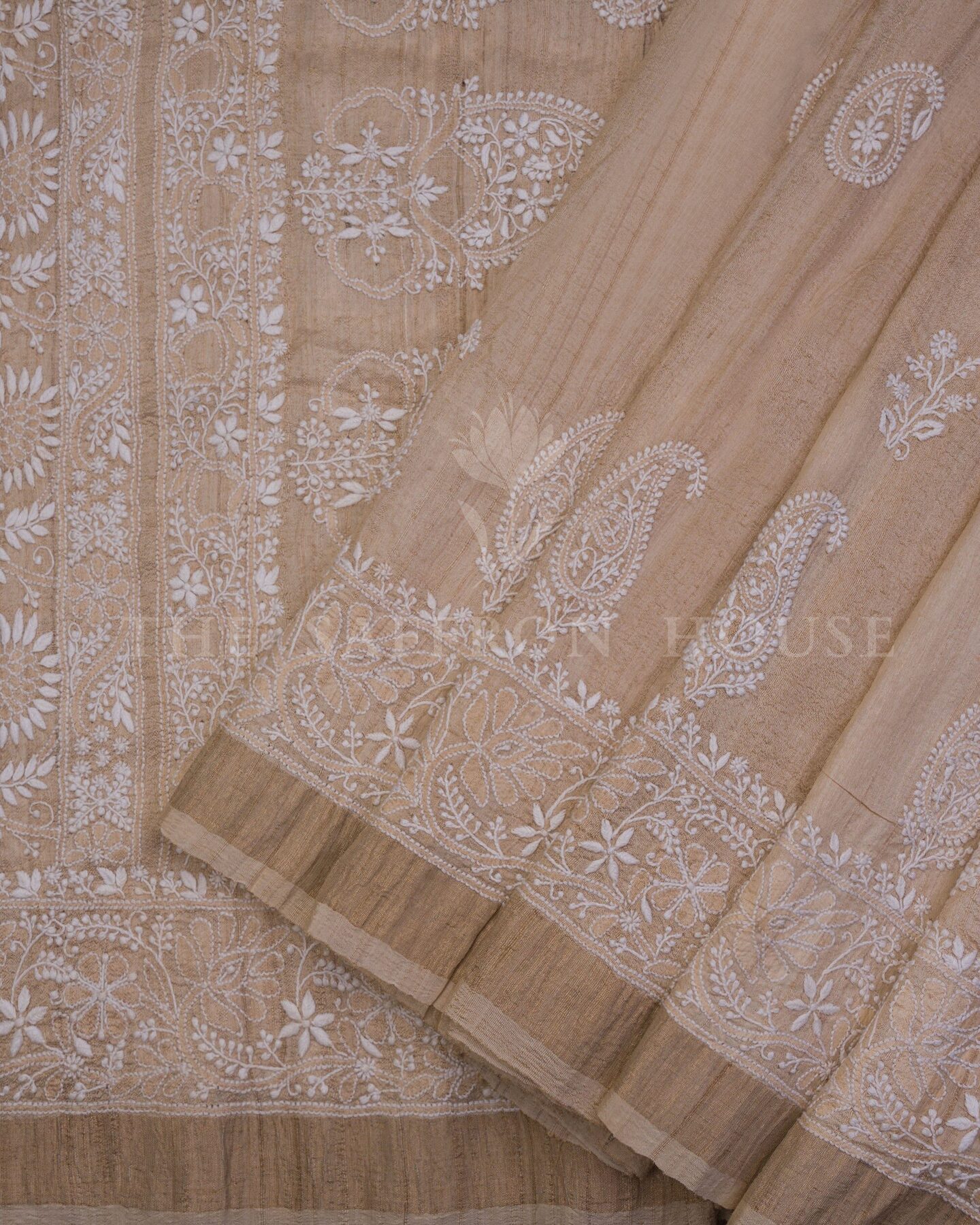 Desi Tussar silk is known for its natural texture, matte sheen, and breathability.. Woven in Bhagalpur, Bihar, and embroidered by skilled artisans in Lucknow, this saree brings together two legacies—Tussar weaving and Chikankari embroidery—in one graceful drape.