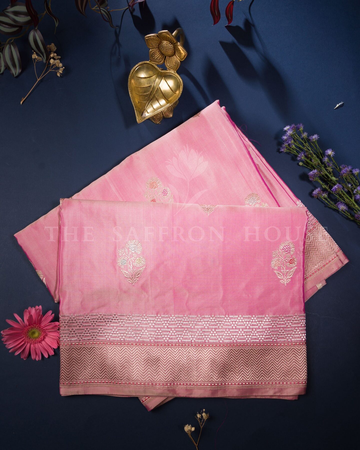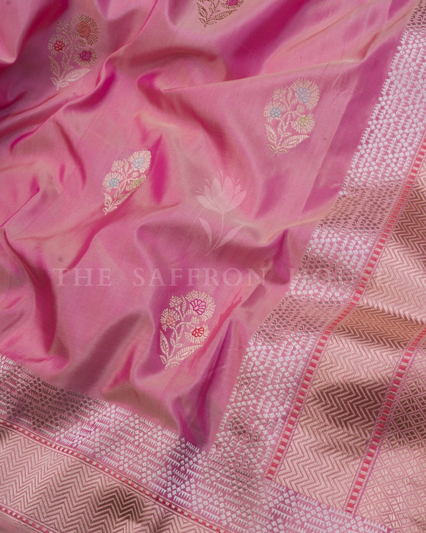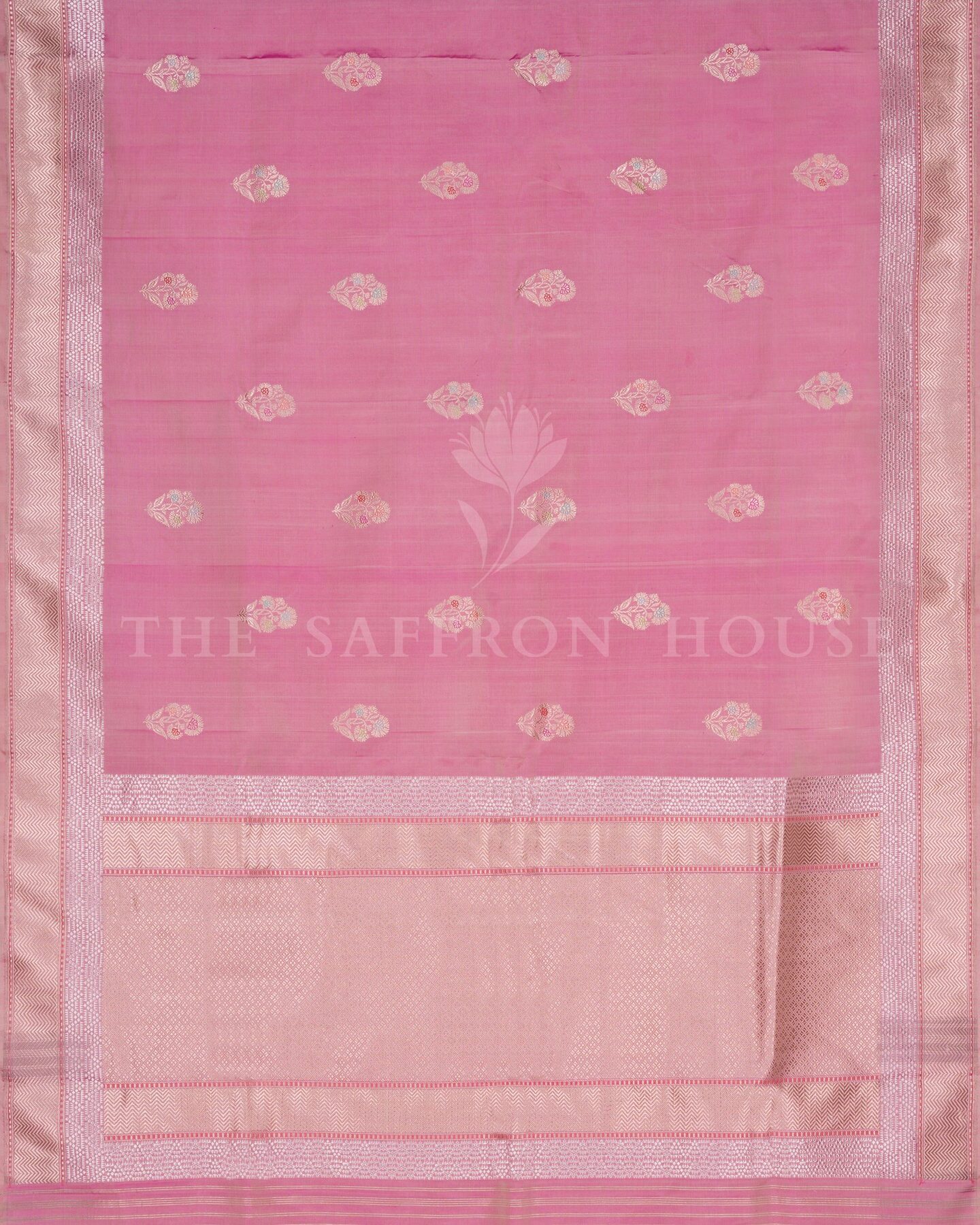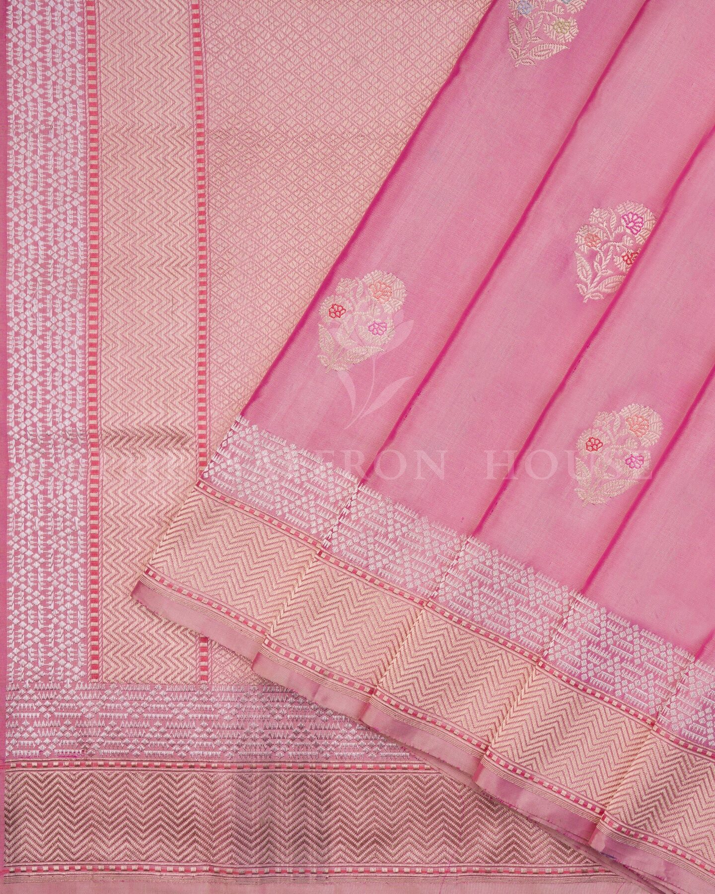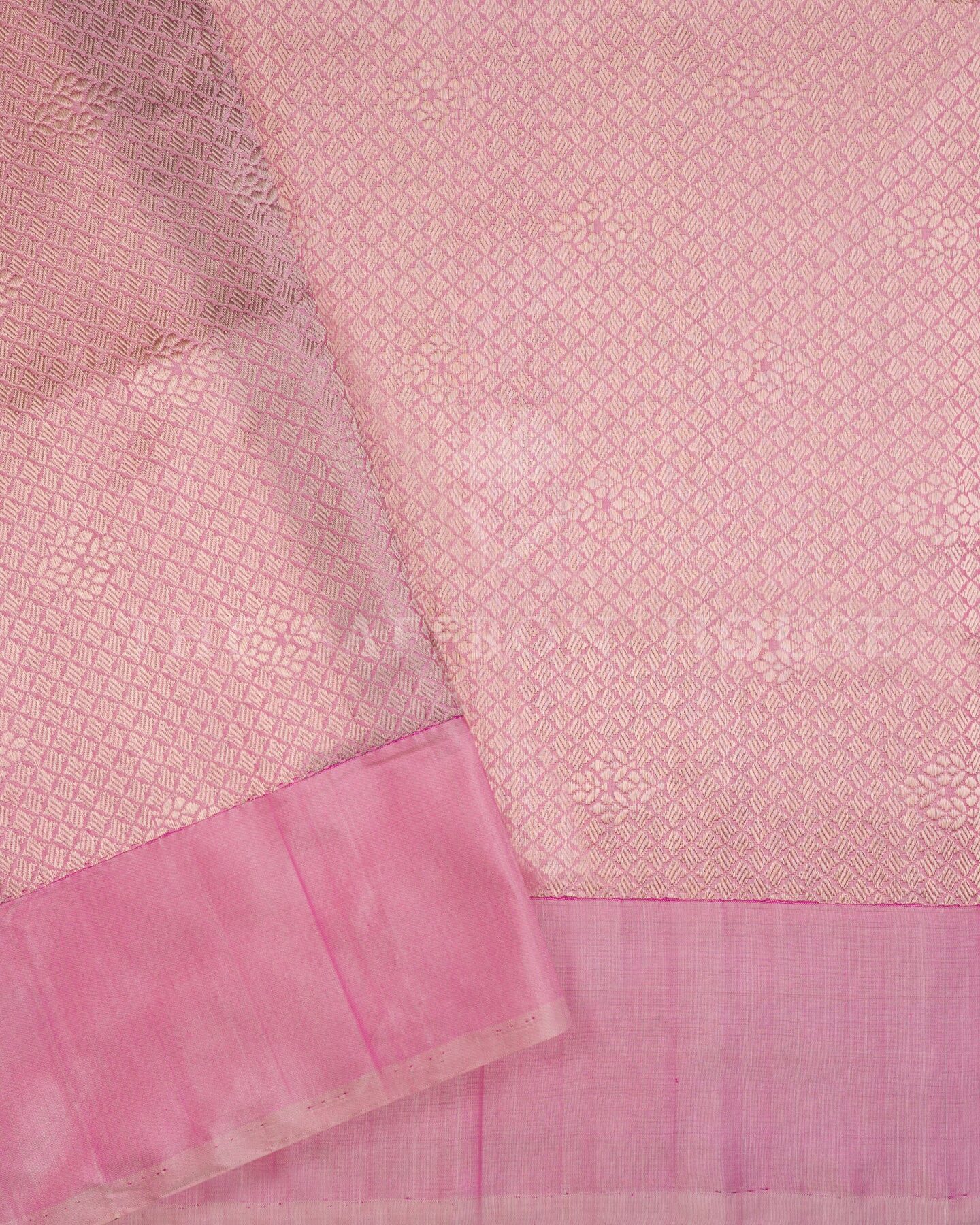Some colours hold memory. Pink — soft and luminous as rose petals — becomes something entirely new when woven into pure Kanjivaram silk. This Handwoven saree carries that colour with quiet authority and grace.