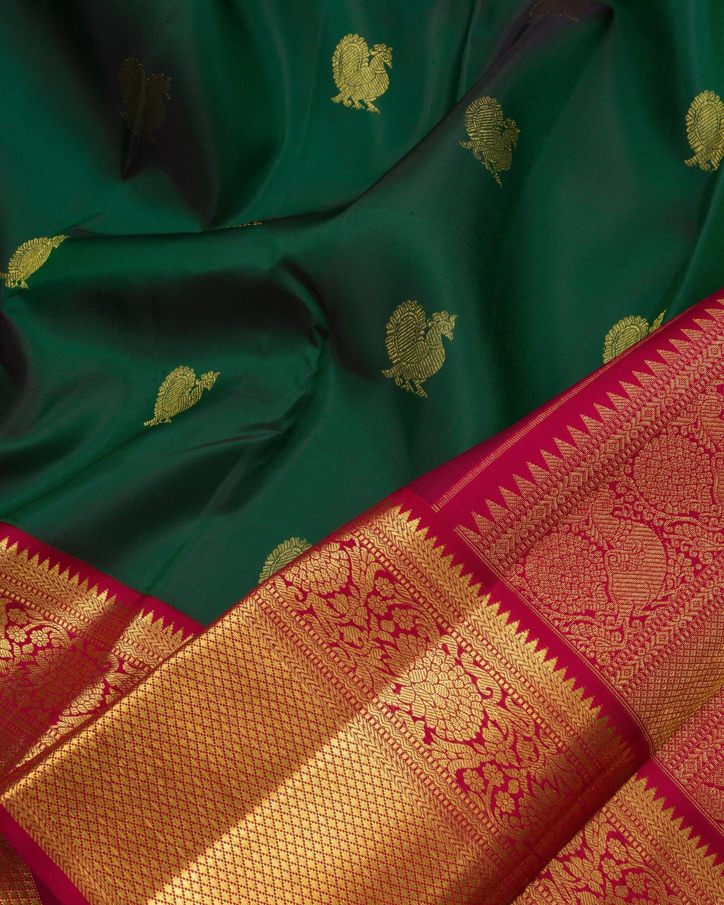 The body is adorned with peacock motifs, each thread placed with precision and purpose. The maroon border frames the drape with confident definition, while gold zari runs through the weave, catching light the way temple gold does — slowly, deeply, unforgettably.