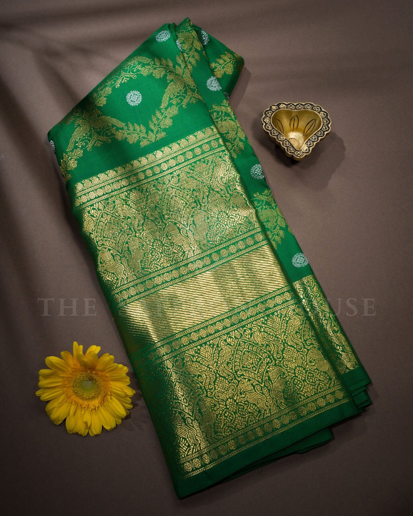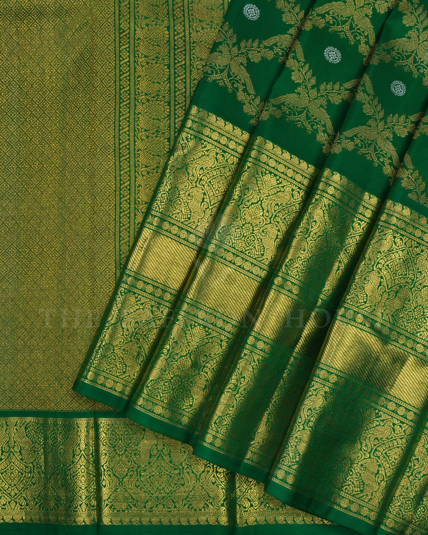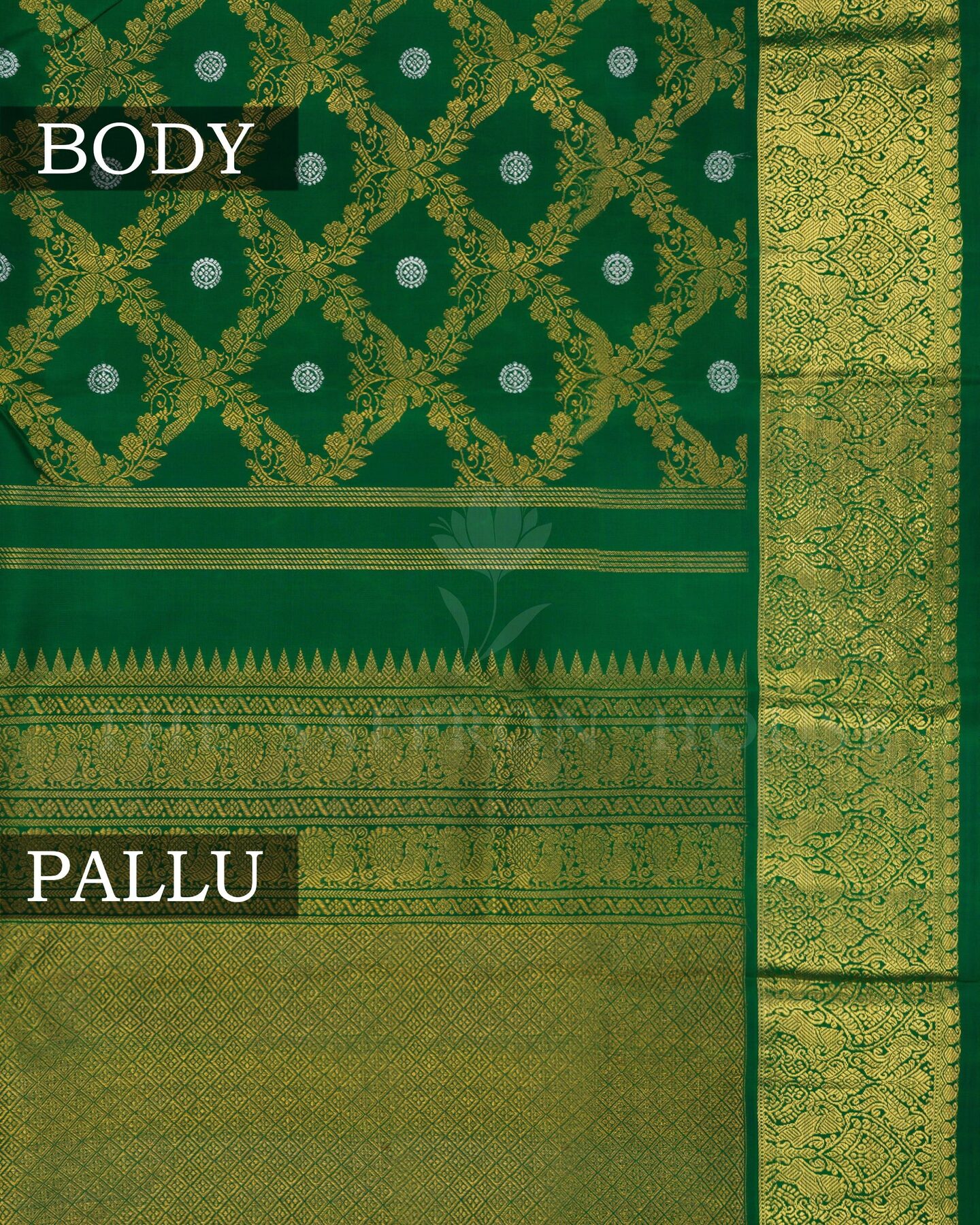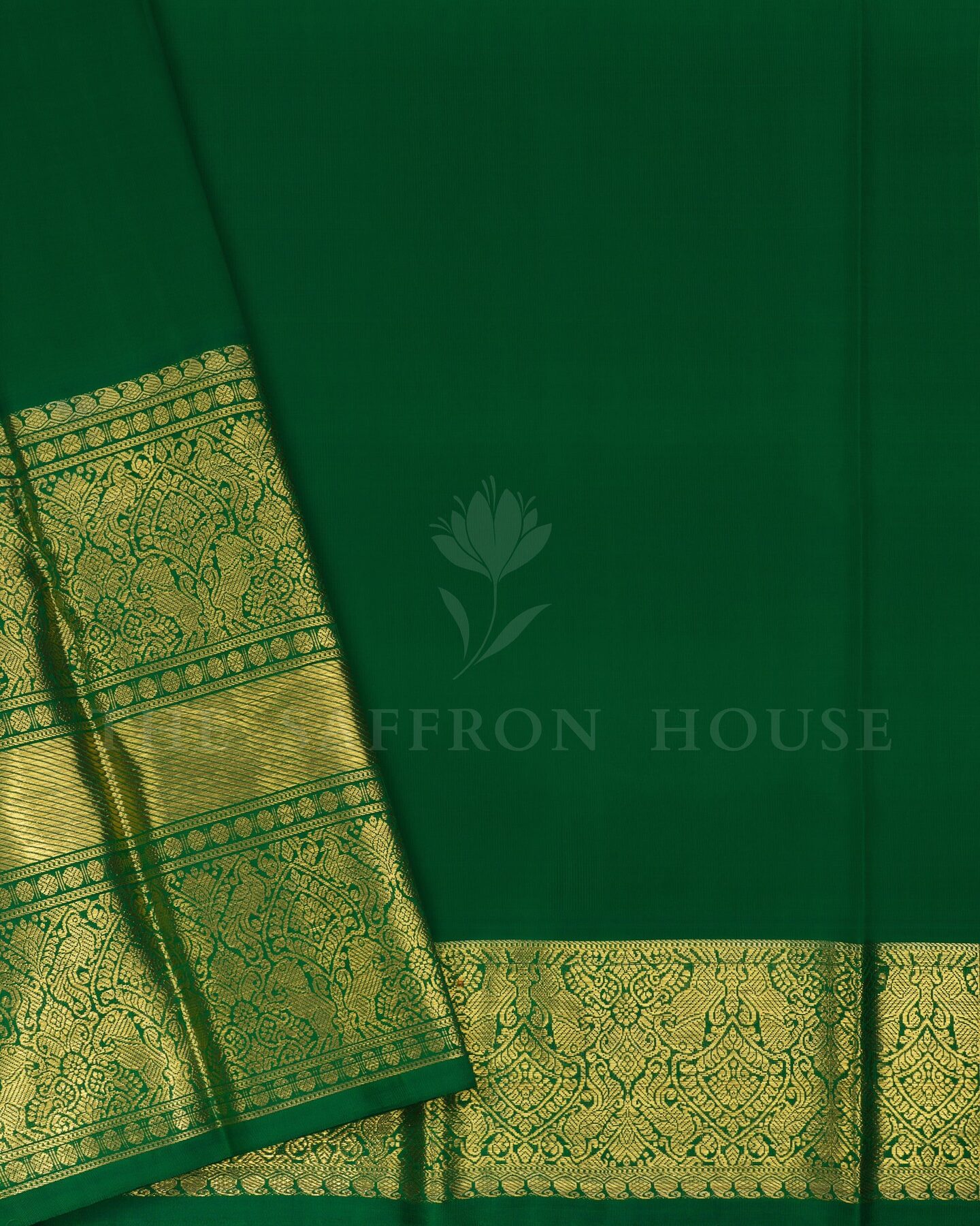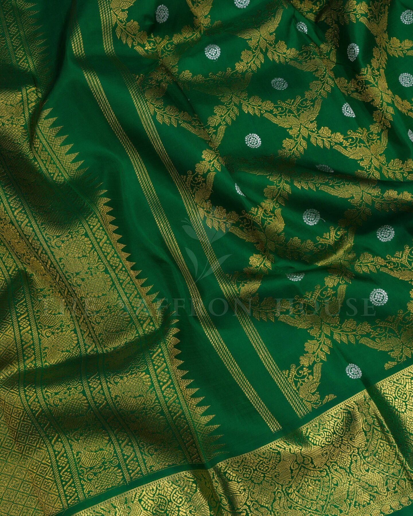The body is adorned with gold zari peacock jal design with silver traditional motifs, each thread placed with precision and purpose. The bottle green border frames the drape with confident definition, while silver and gold zari runs through the weave, catching light the way temple gold does — slowly, deeply, unforgettably.