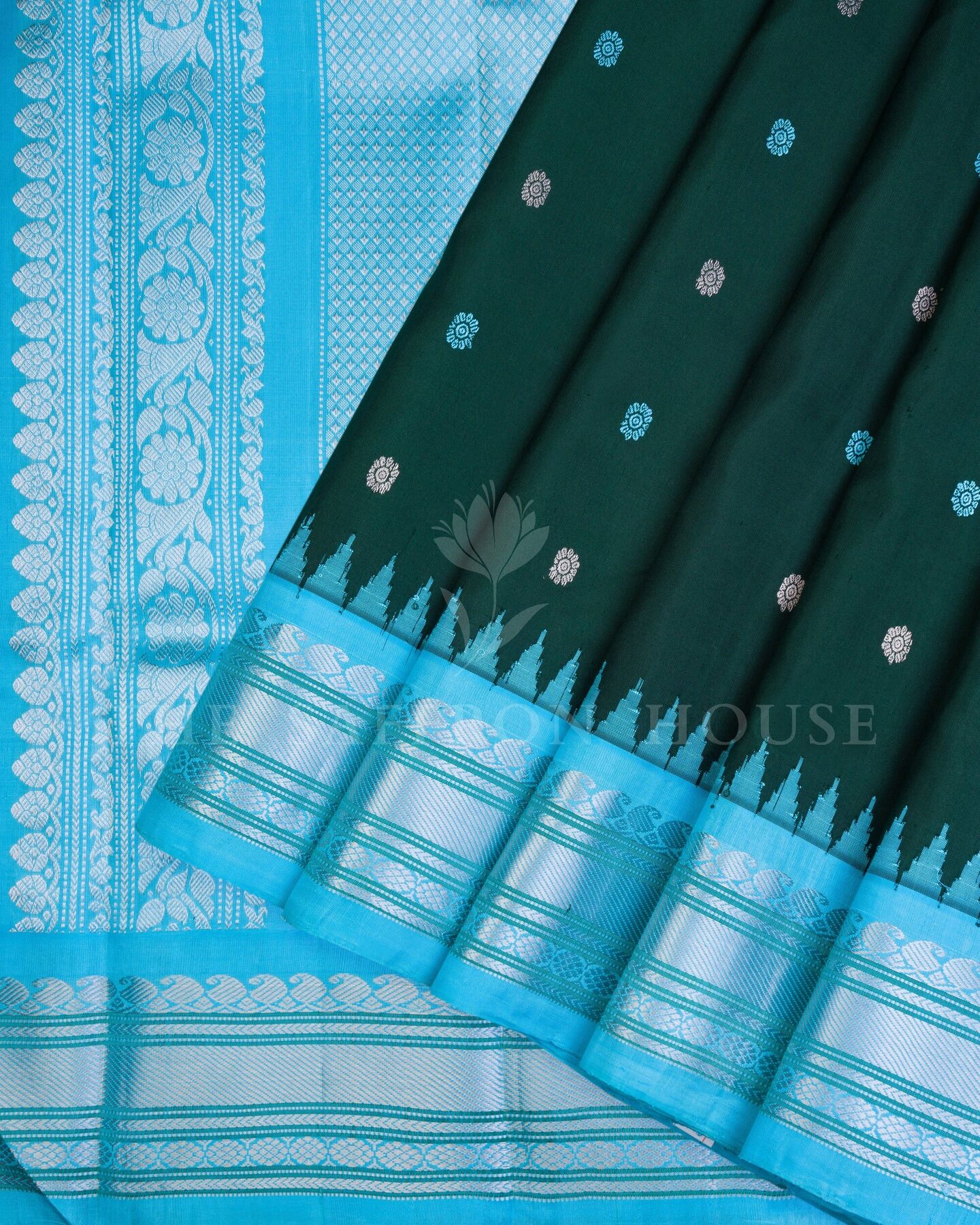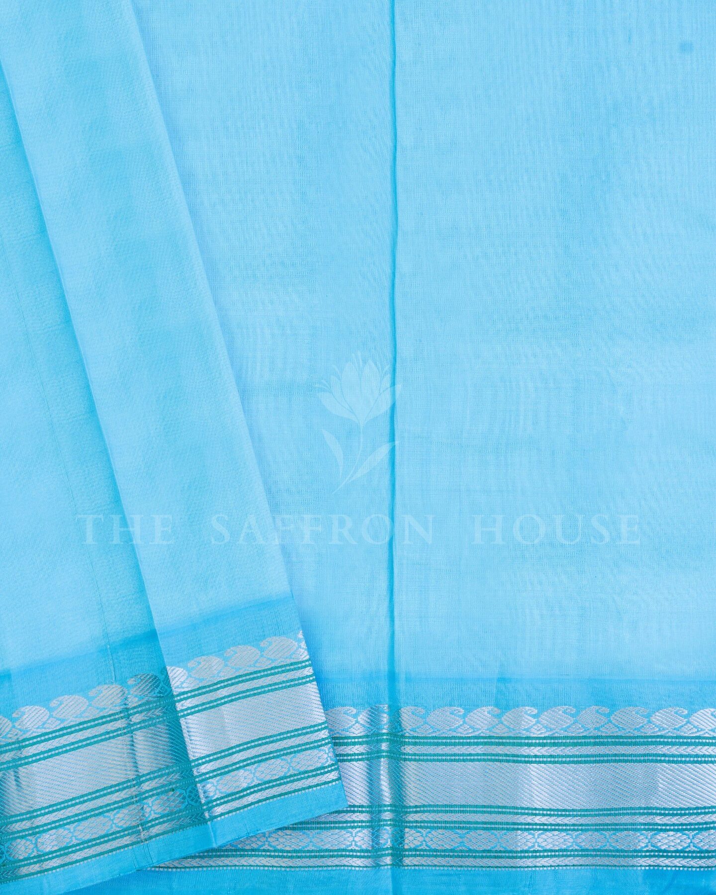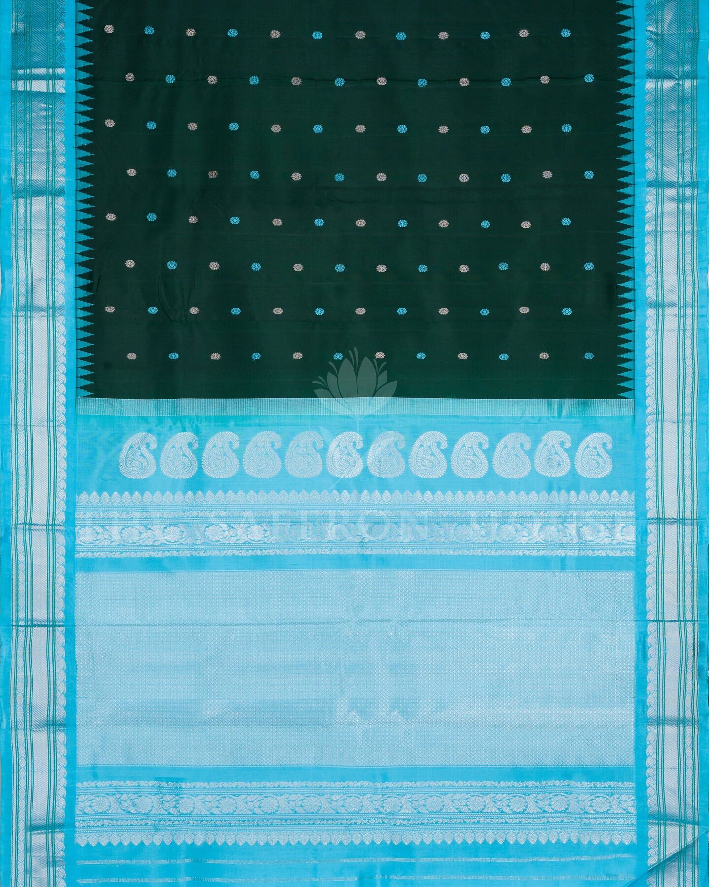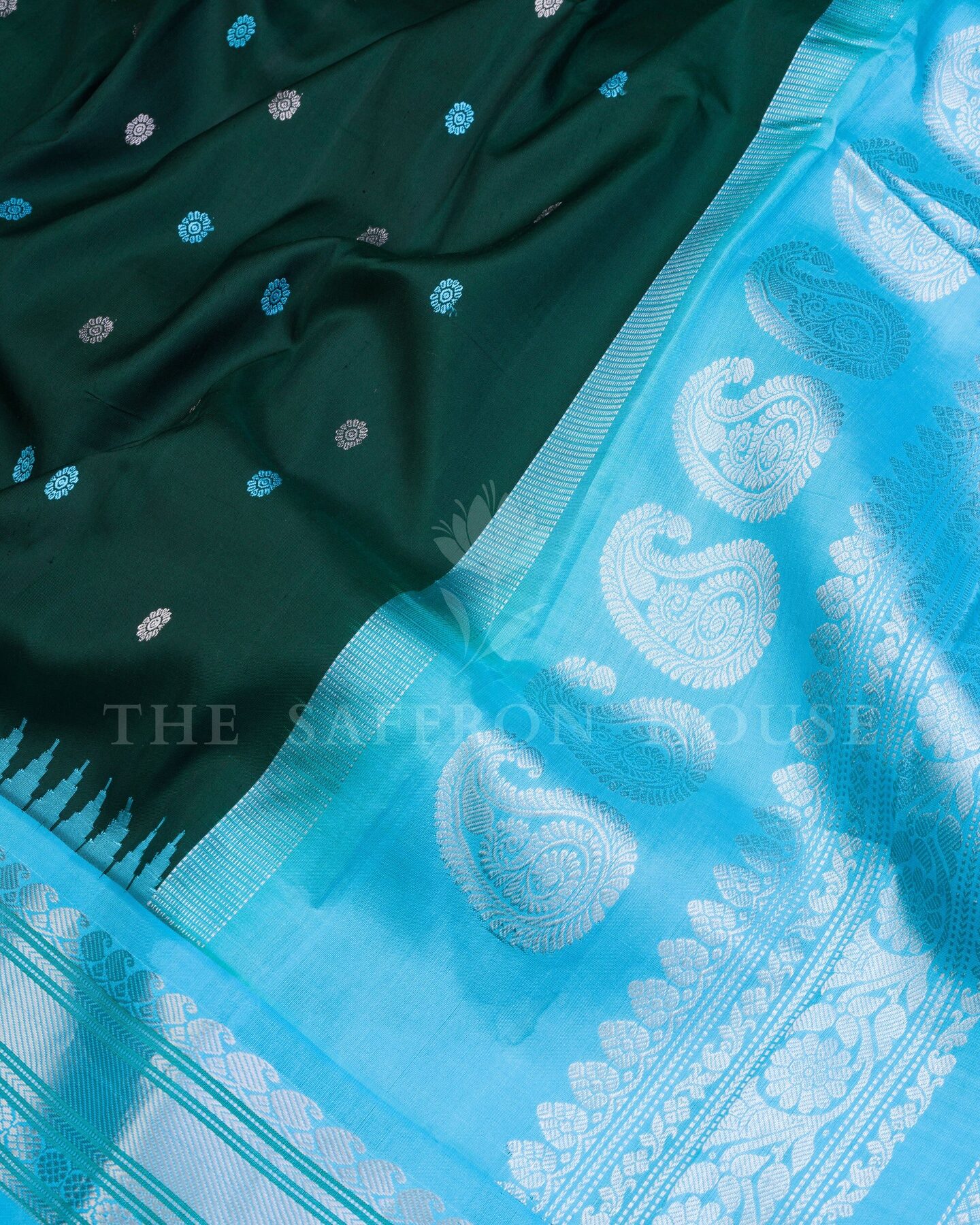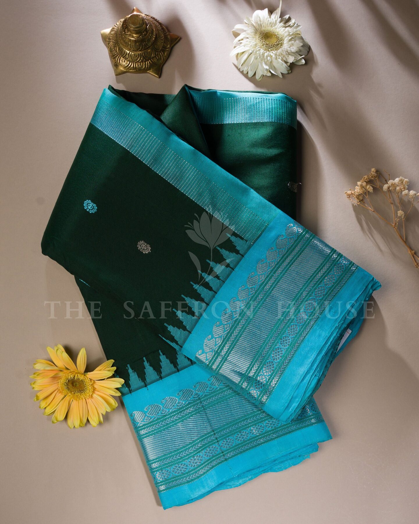 There is something about the interplay of bottle green and sky blue that feels both ancient and alive. This Korvai Kanjivaram silk saree opens with deep and contemplative as forest dusk, its surface shimmering with the unhurried rhythm of the loom.