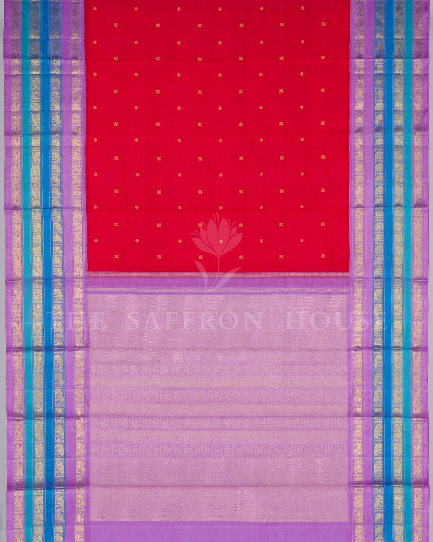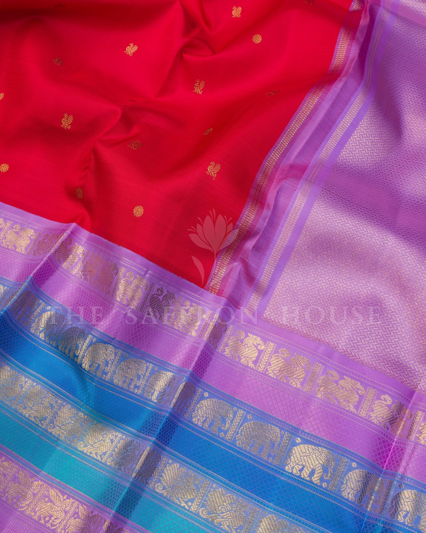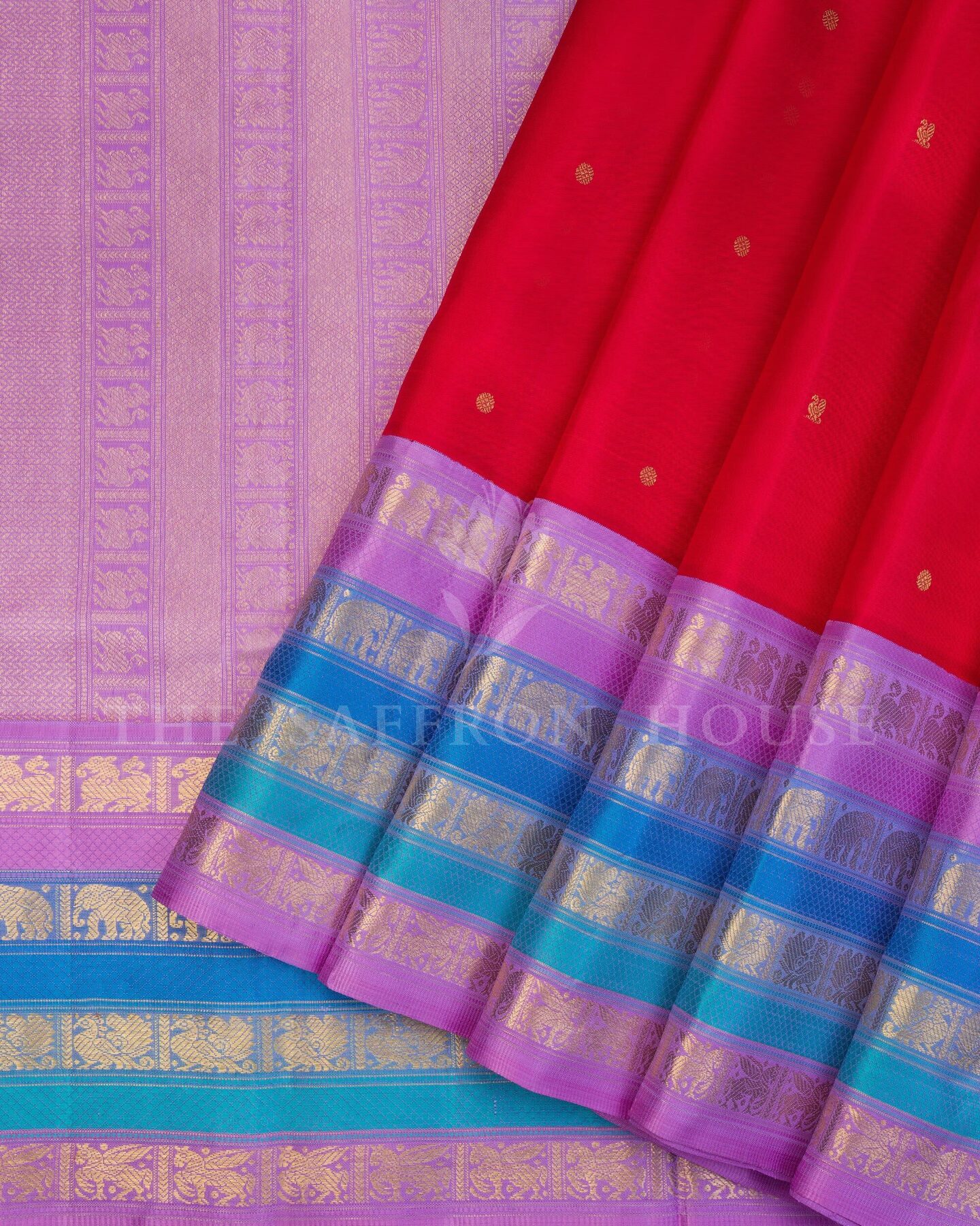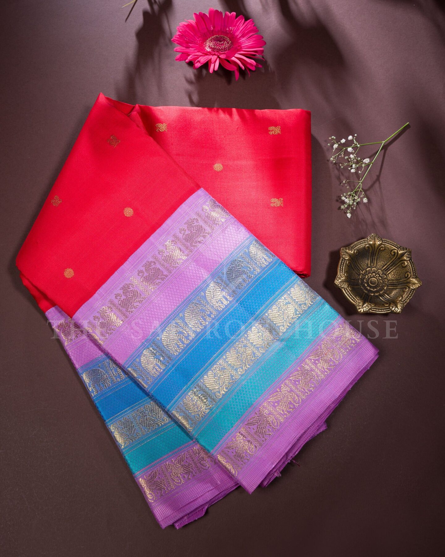 There is something about the interplay of red and ruby red that feels both ancient and alive. This Handwoven Kanjivaram silk saree opens with the colour of sindoor and auspicious beginnings, its surface shimmering with the unhurried rhythm of the loom.