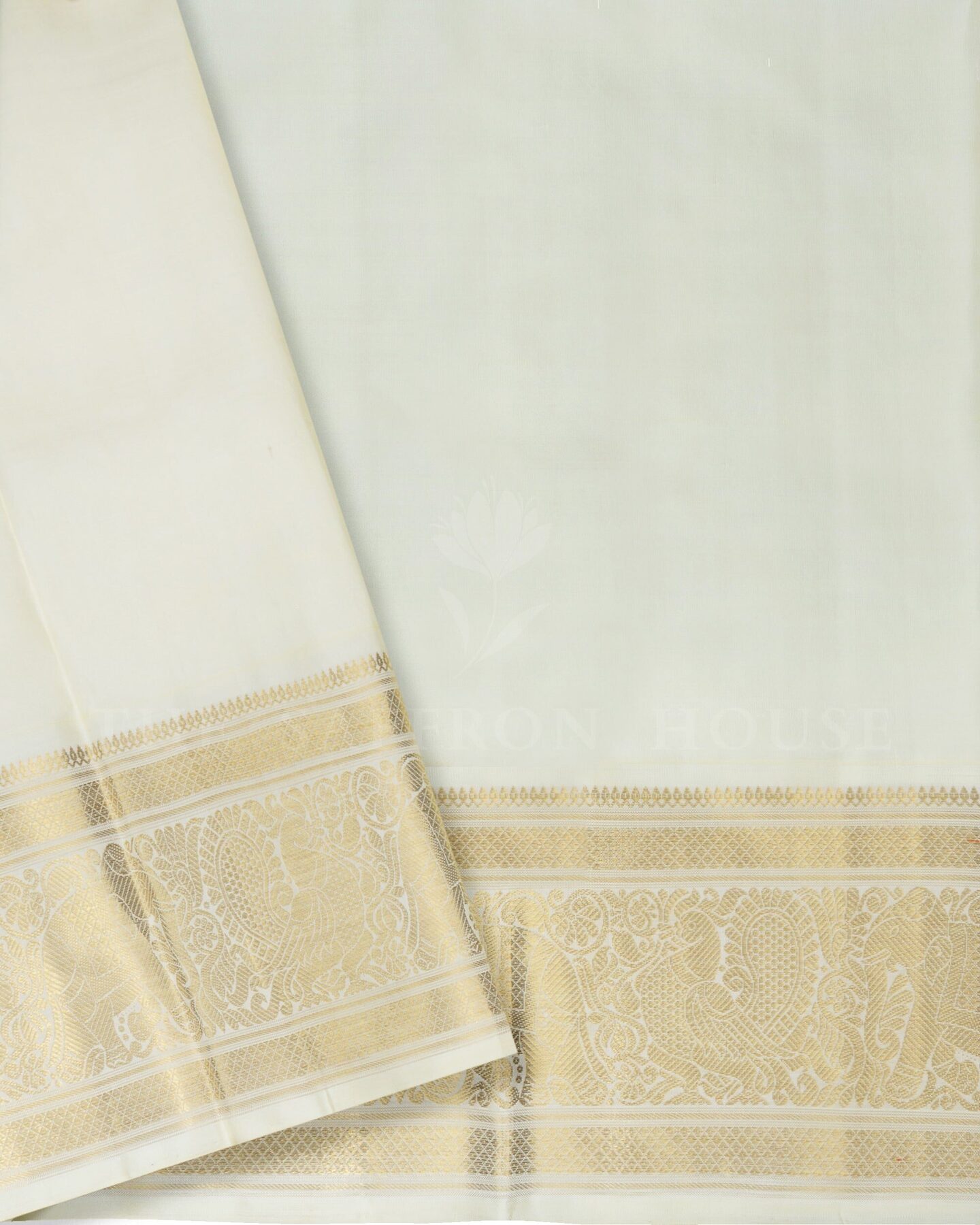 The body is adorned with zari motifs, each thread placed with precision and purpose. The cream border frames the drape with confident definition, while gold zari runs through the weave, catching light the way temple gold does — slowly, deeply, unforgettably.