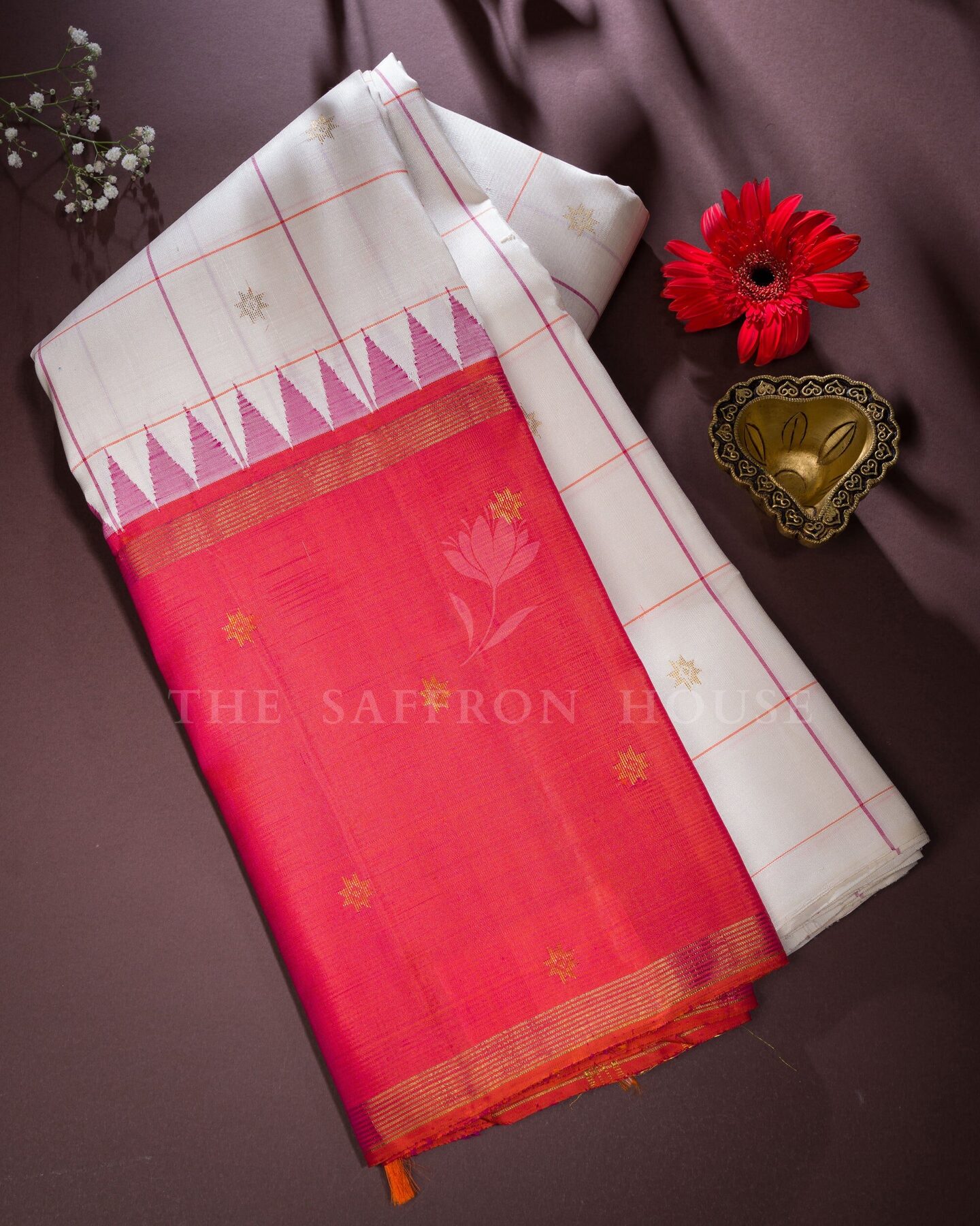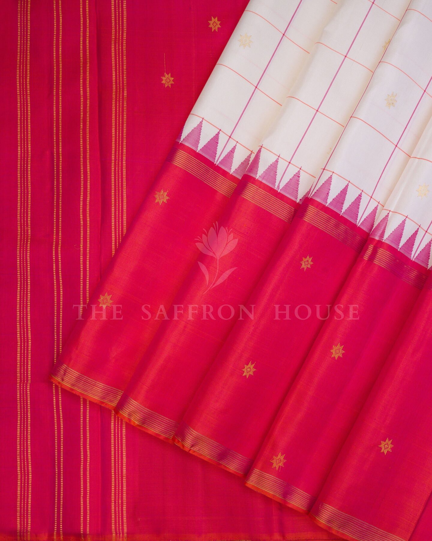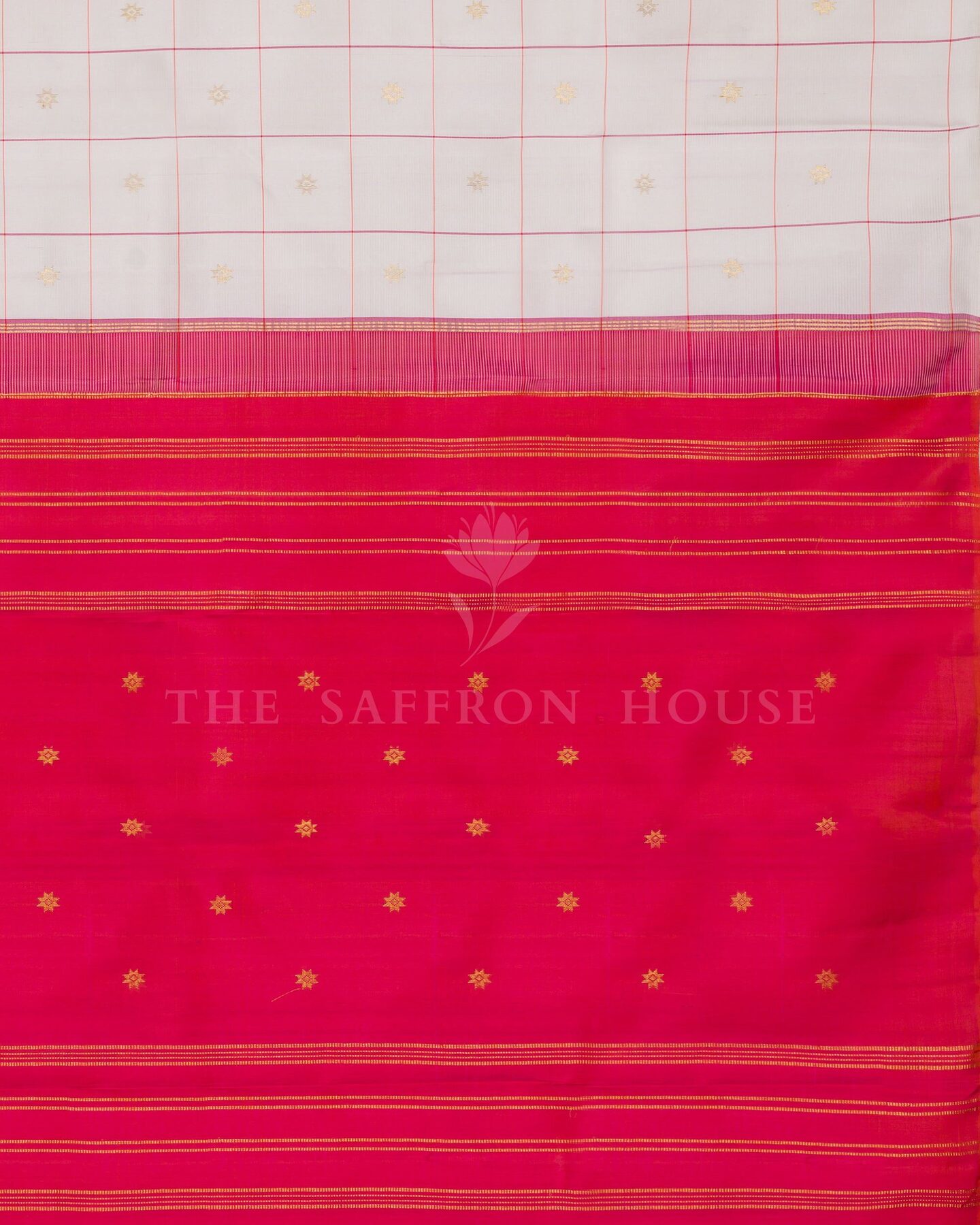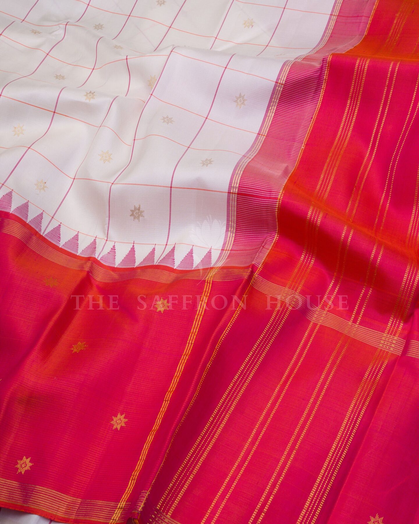 There is something about the interplay of white and red that feels both ancient and alive. This Korvai Kanjivaram silk saree opens with pure as freshly woven moonlight, its surface shimmering with the unhurried rhythm of the loom.