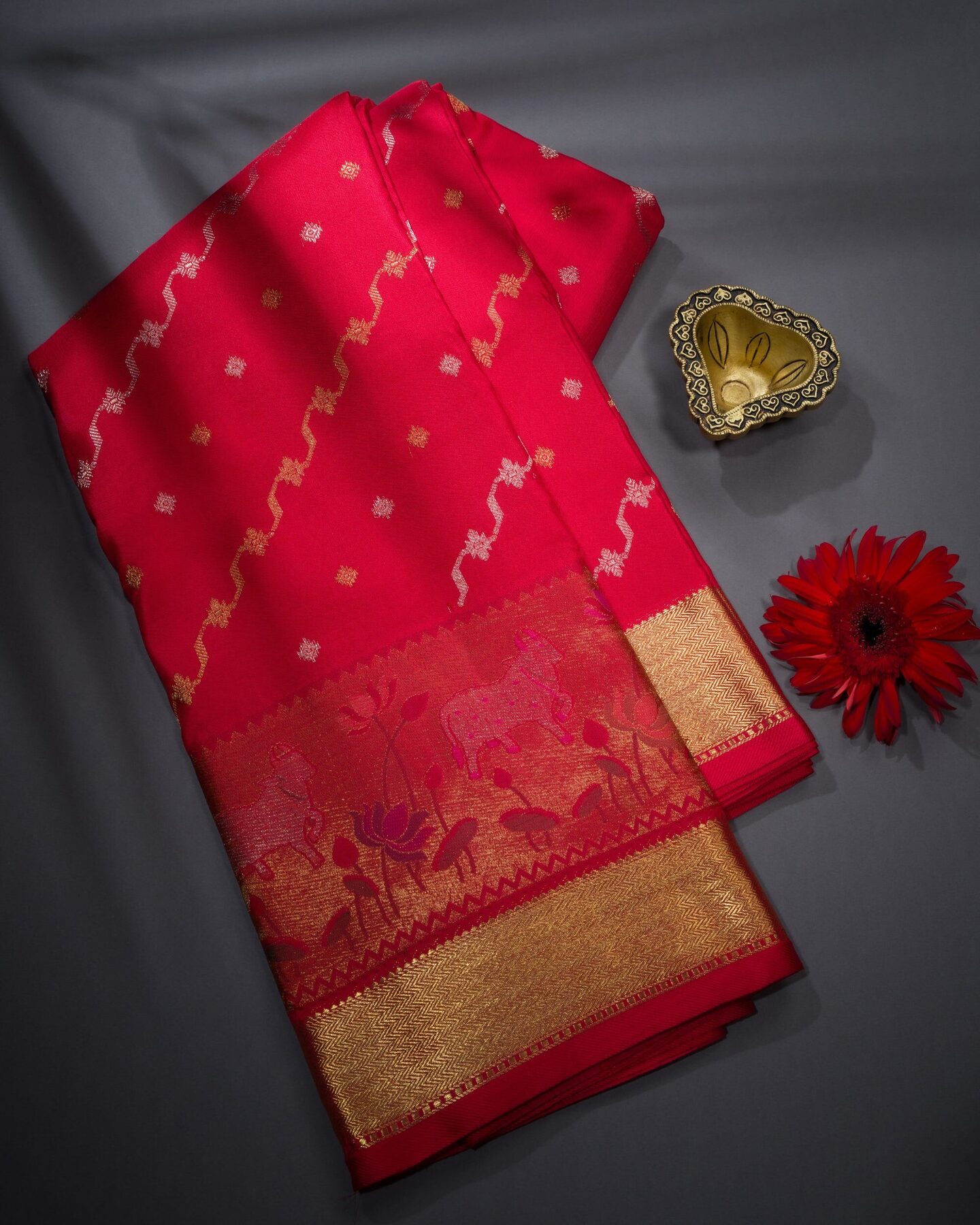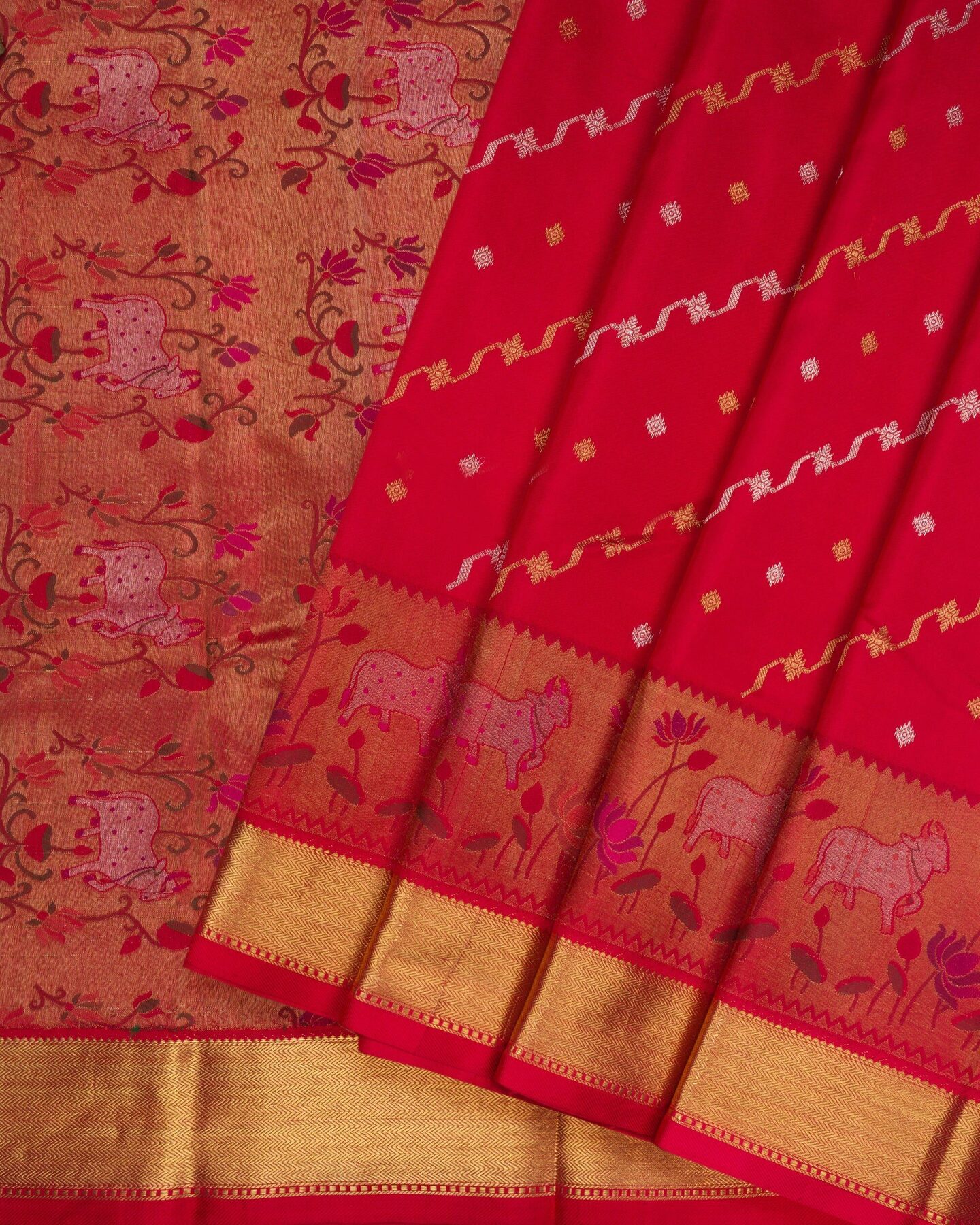There is something about the interplay of red and gold that feels both ancient and alive. This Brocade Kanjivaram silk saree opens with the colour of sindoor and auspicious beginnings, its surface shimmering with the unhurried rhythm of the loom.