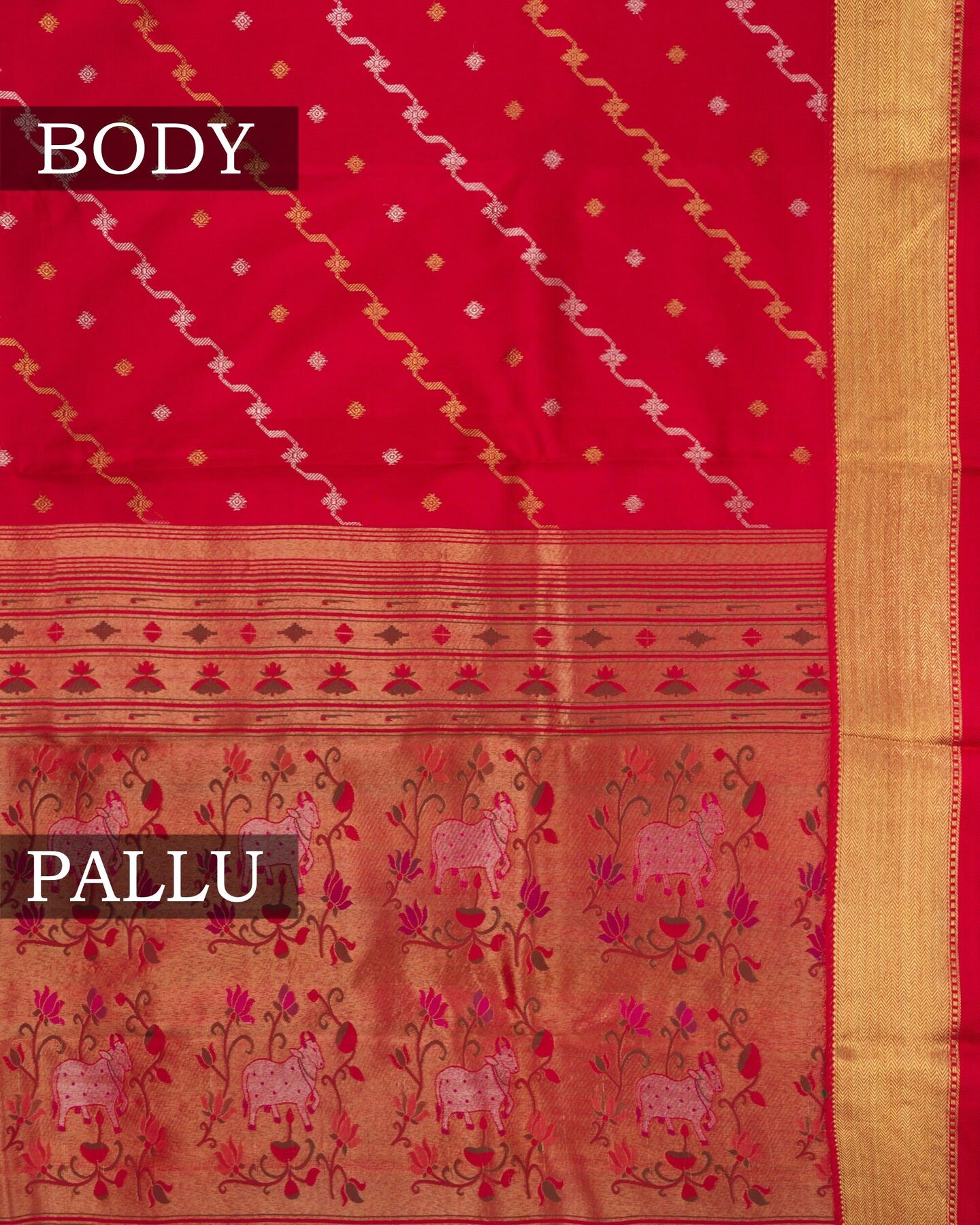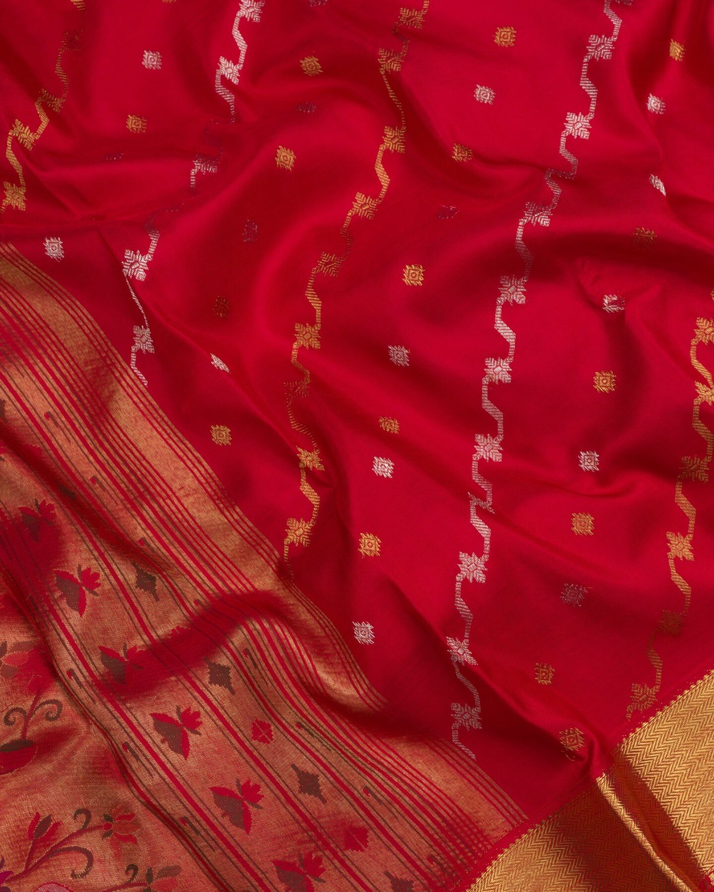 The body is adorned with silver & gold rangkat design with small motifs, each thread placed with precision and purpose. The gold zari border frames the drape with confident definition, while real zari runs through the weave, catching light the way temple gold does — slowly, deeply, unforgettably.