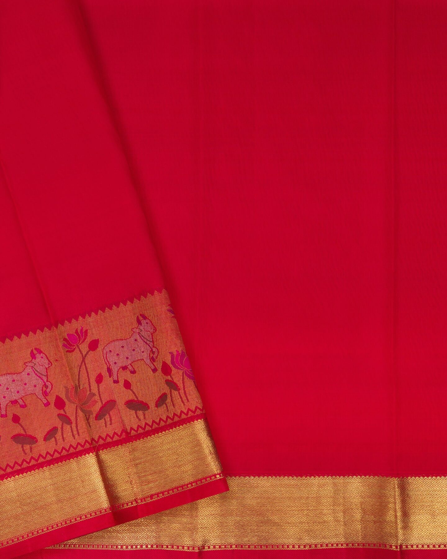 Pure mulberry silk with pure zari weaving, providing a rich, lustrous texture and structure that drapes like a dream — ideal for festive dressing.. From the looms of Kanchipuram, Tamil Nadu, where master weavers have passed down their skills over generations.