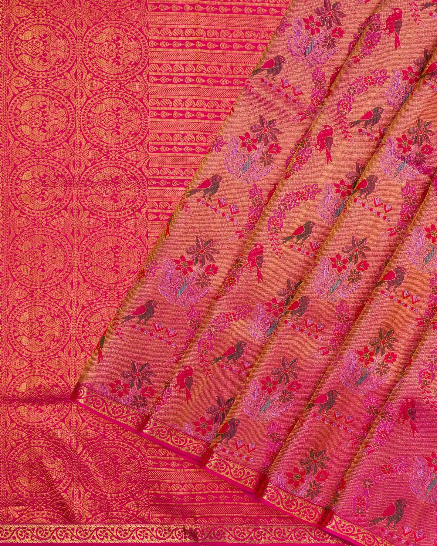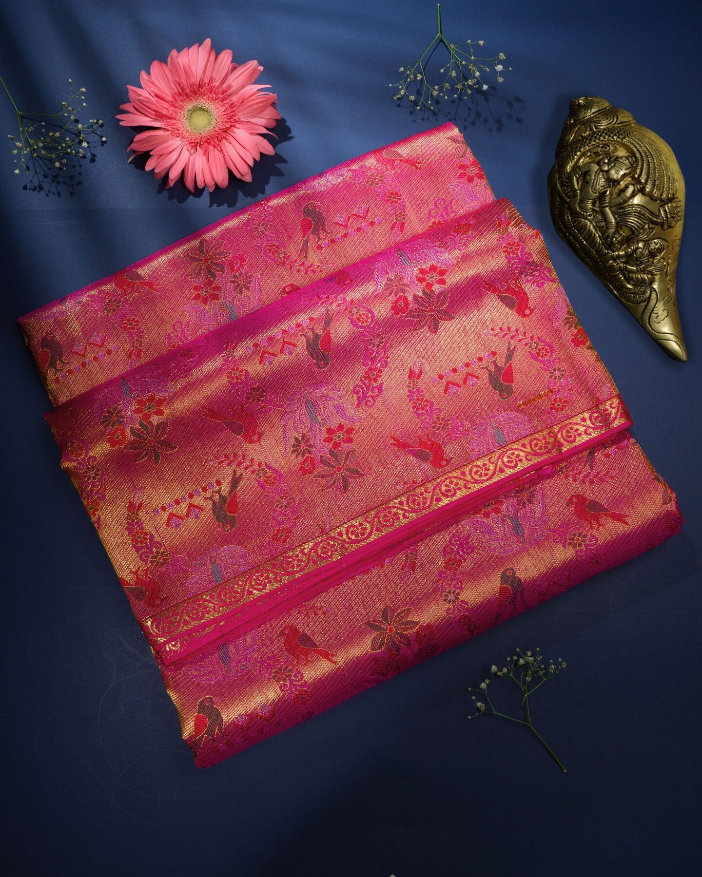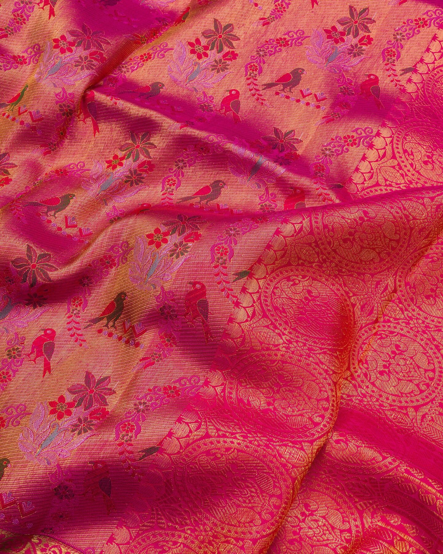 gold zari runs through the weave, catching light the way temple gold does — slowly, deeply, unforgettably.
