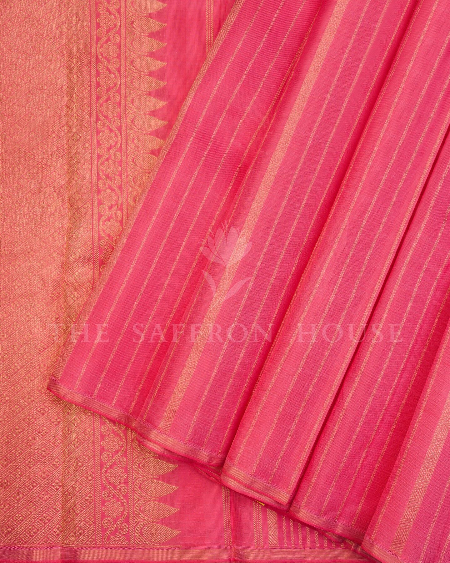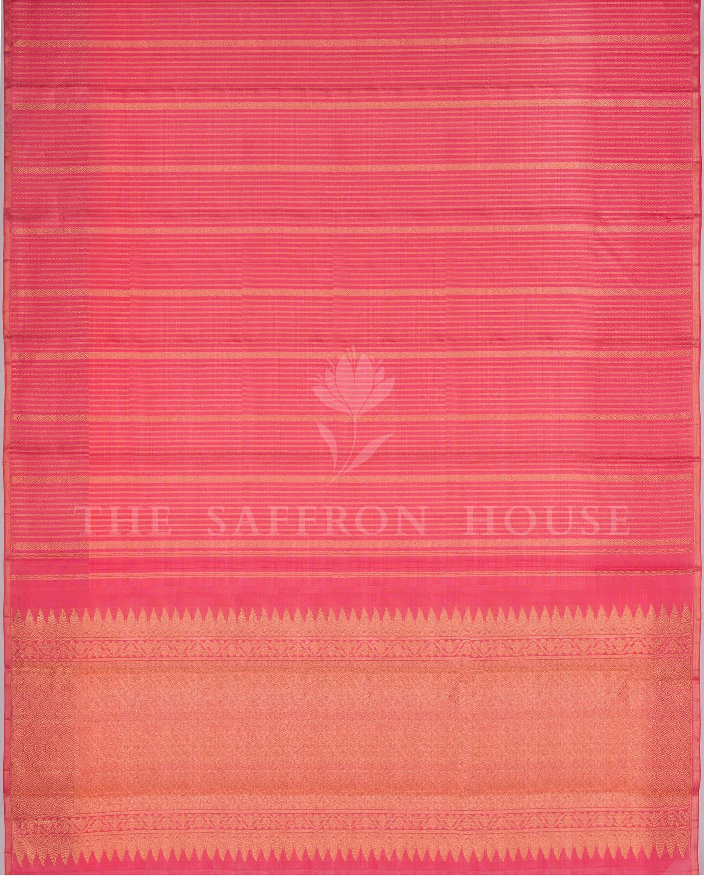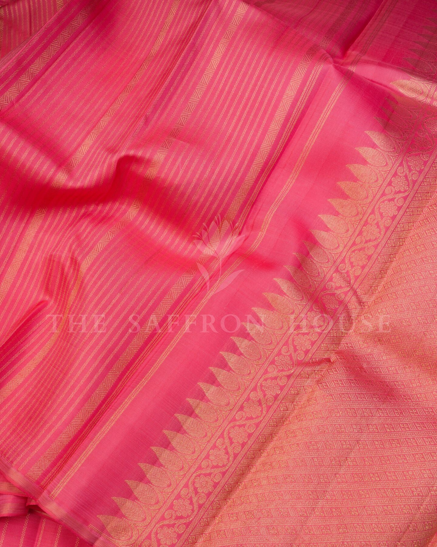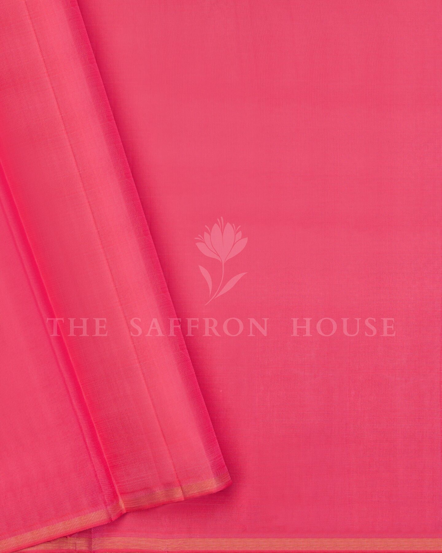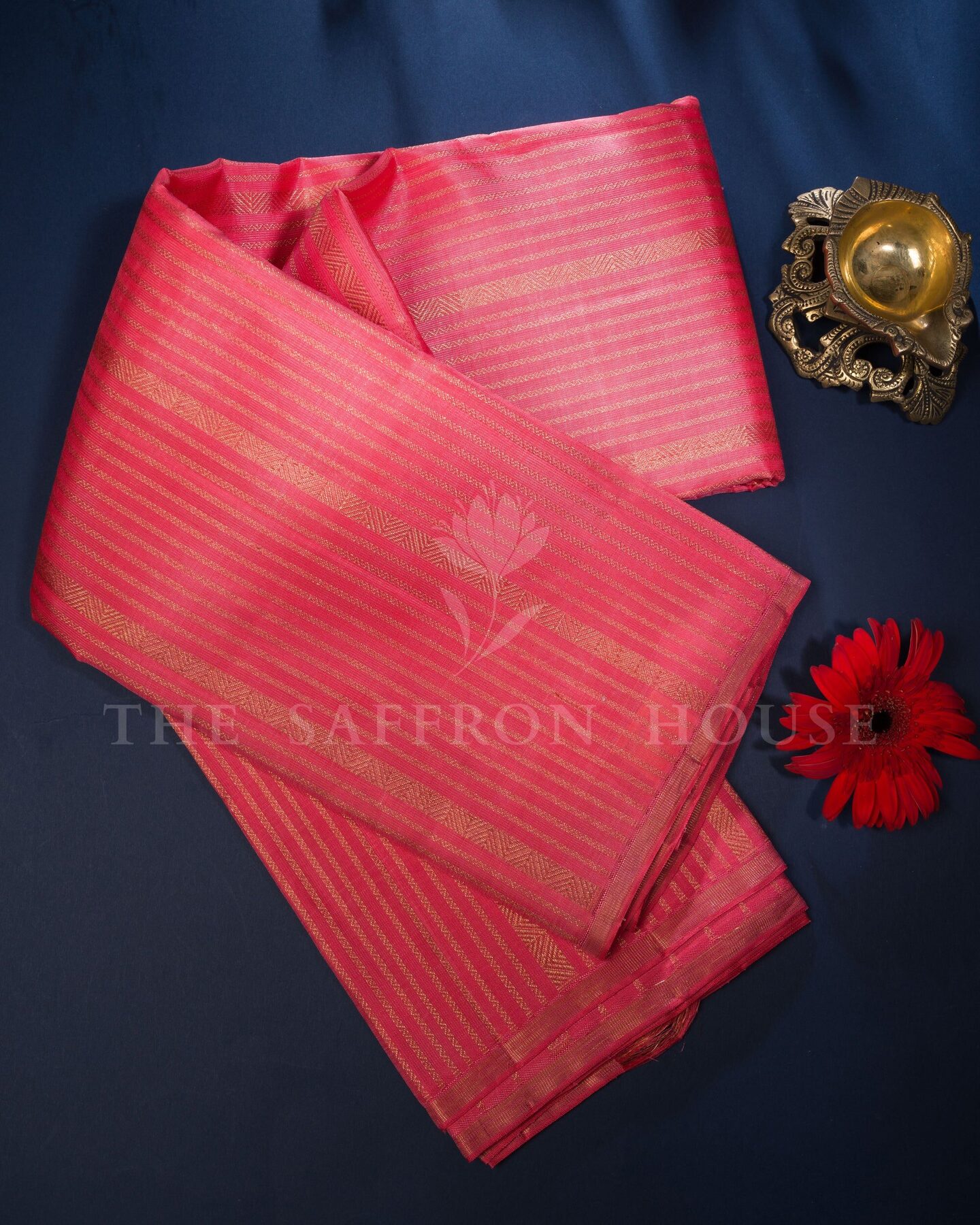 There is something about the interplay of coral and pink that feels both ancient and alive. This Kattam Kanjivaram silk saree opens with warm as terracotta kissed by afternoon sun, its surface shimmering with the unhurried rhythm of the loom.