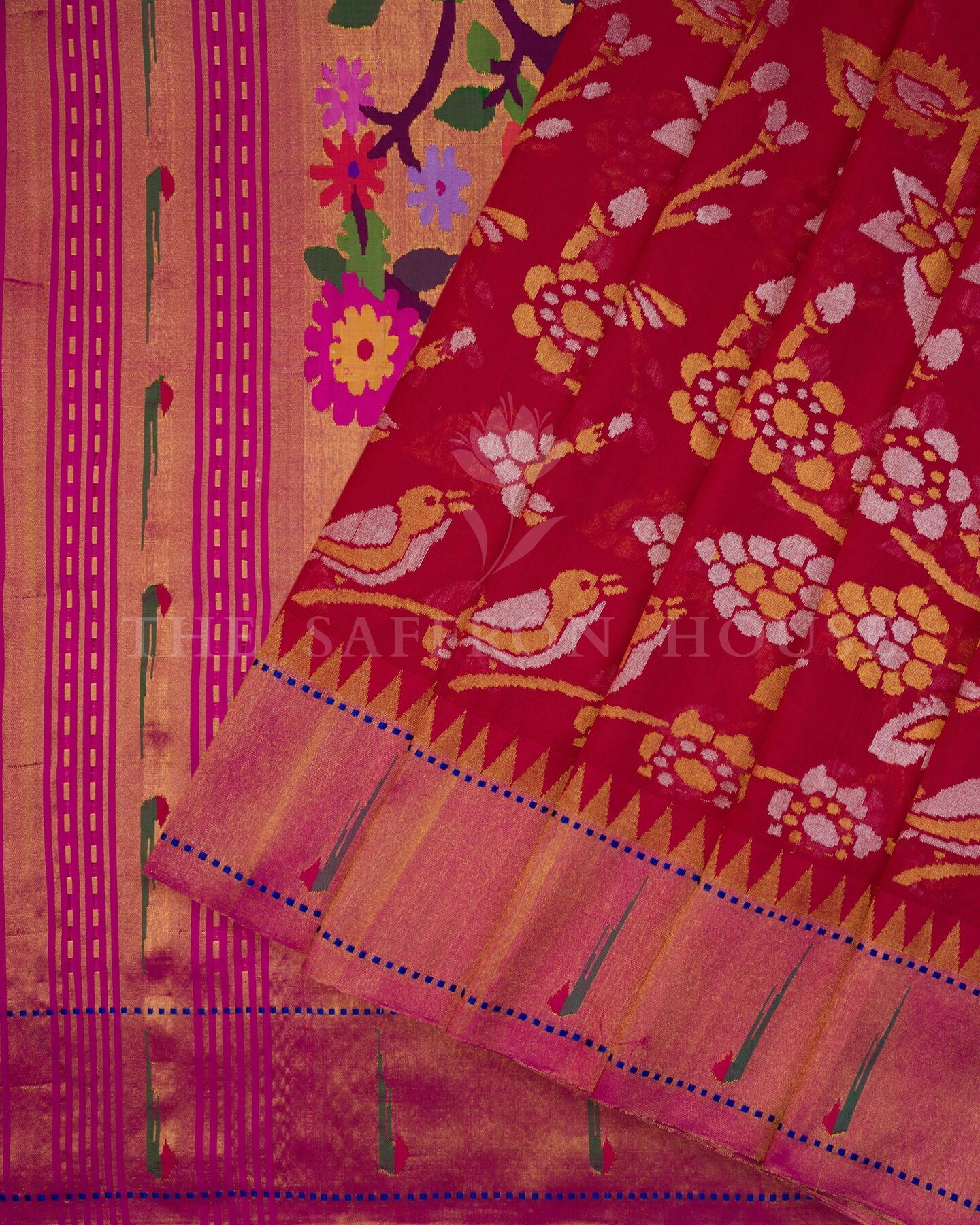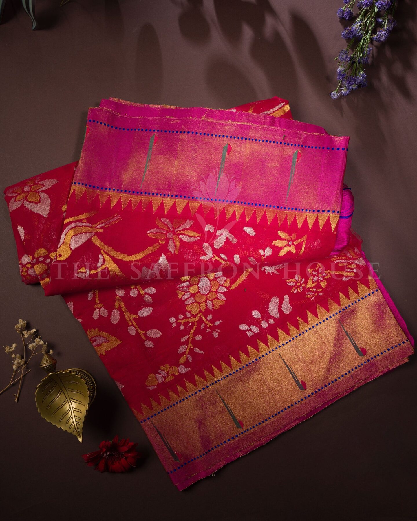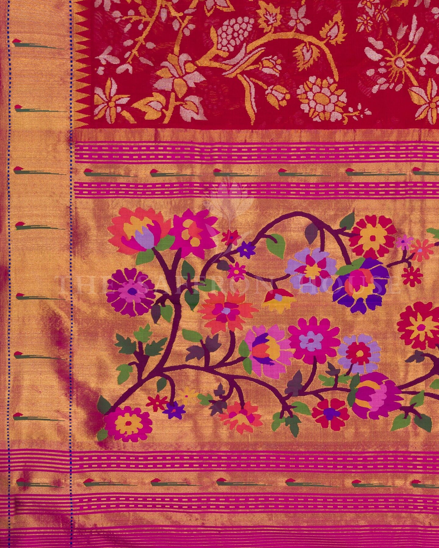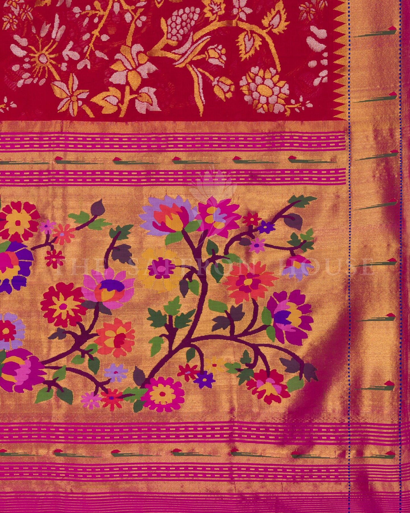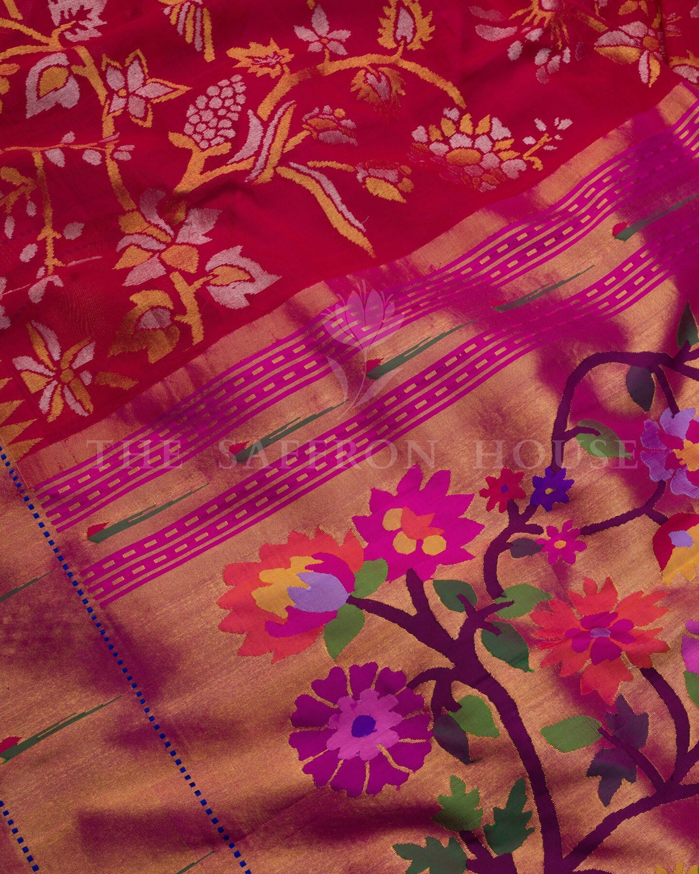 There is something about the interplay of crimson red and multicolor that feels both ancient and alive. This Paithani Kanjivaram silk saree opens with radiant in its own quiet way, its surface shimmering with the unhurried rhythm of the loom.