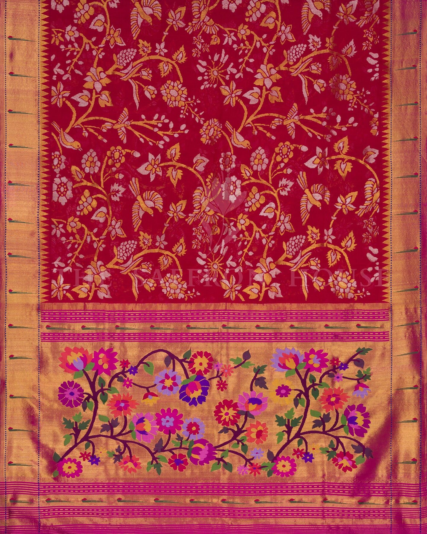 Pure Silk with Pure Zari. Uppada (Andhra Pradesh): Revered for its gossamer-soft silks and labor-intensive Jamdani technique where motifs are inlaid by hand using extra weft.
