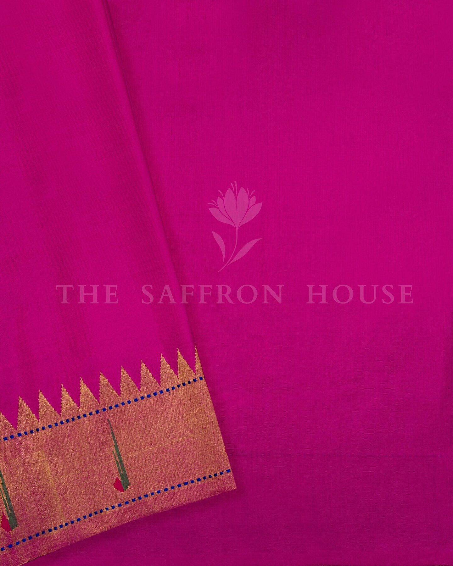 The body is woven with intricate traditional motifs, each thread placed with precision and purpose. A richly woven border frames the drape with confident definition, while gold zari runs through the weave, catching light the way temple gold does — slowly, deeply, unforgettably.
