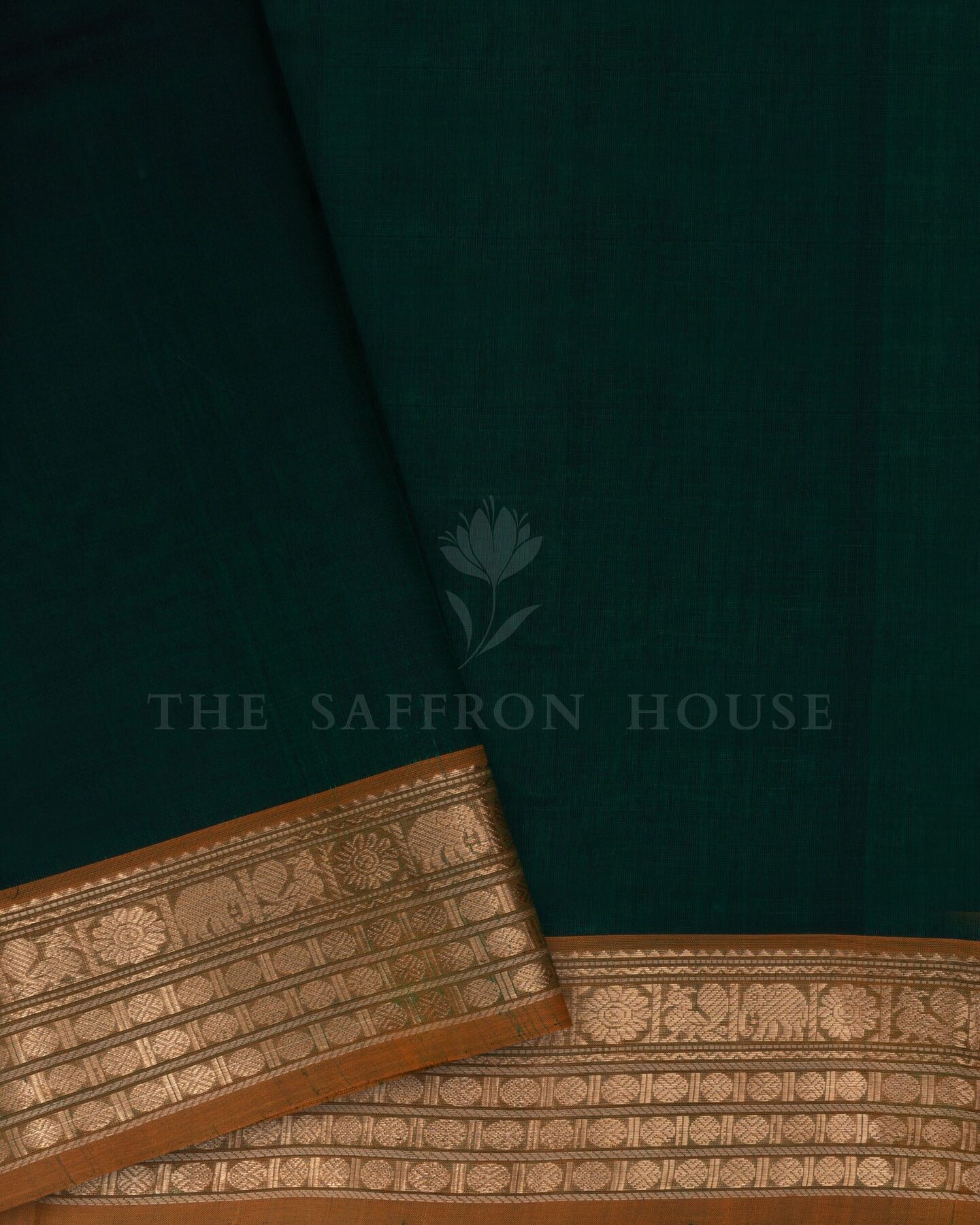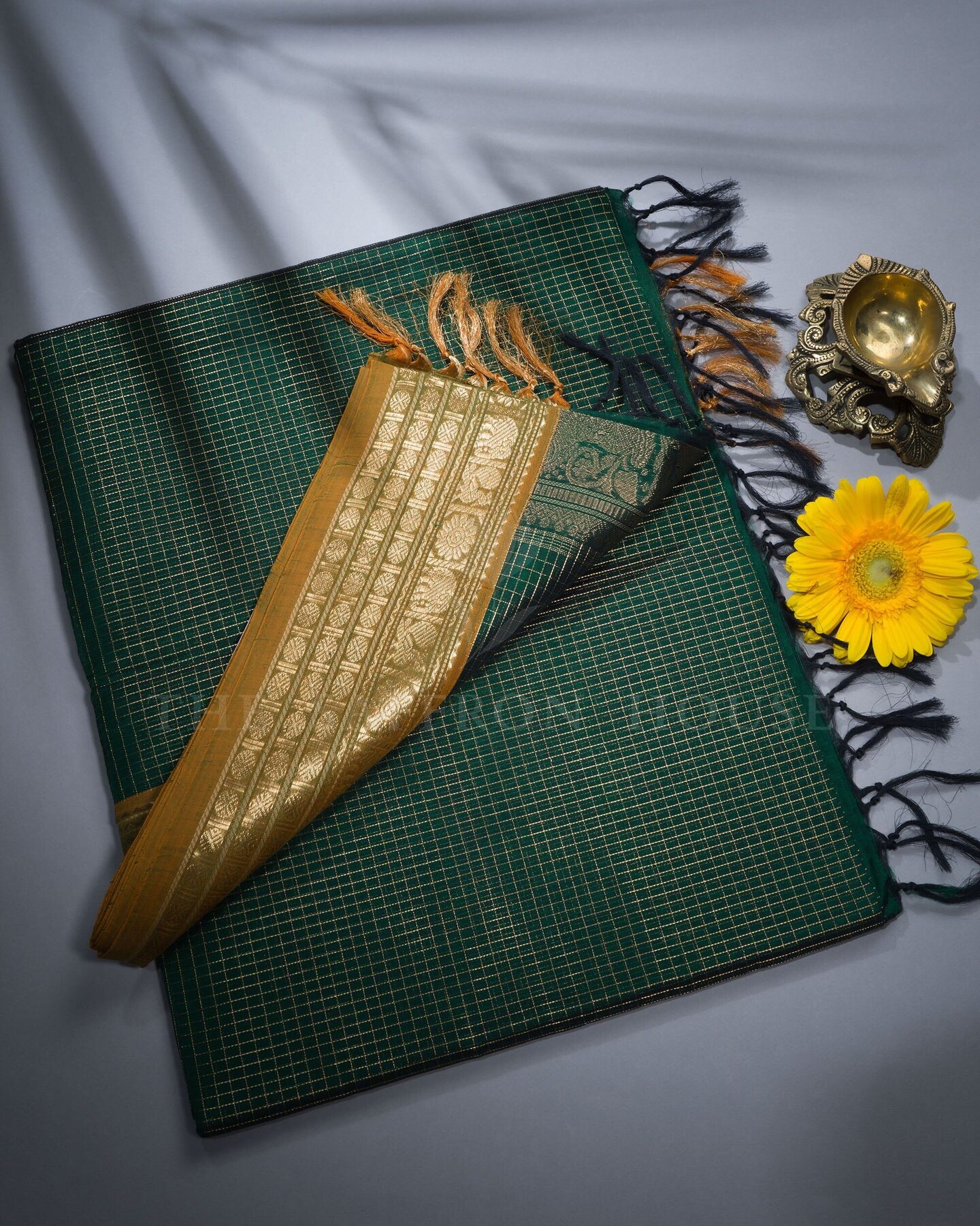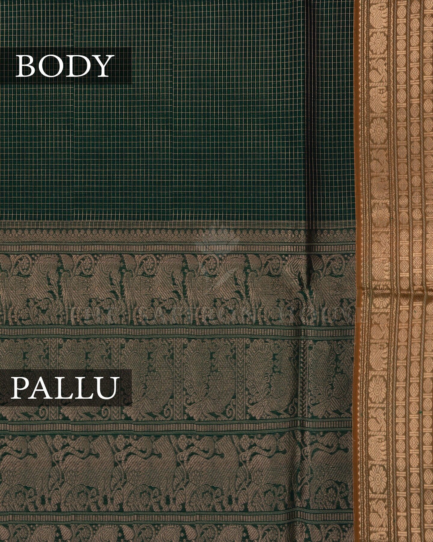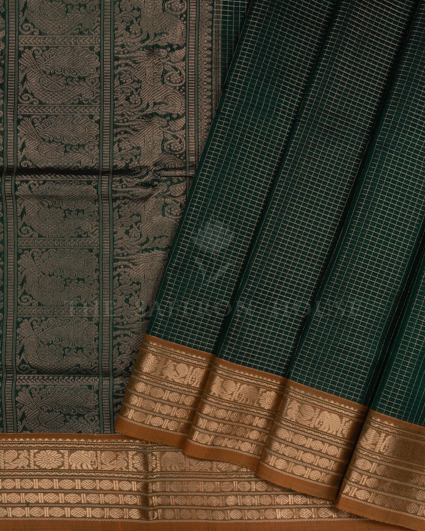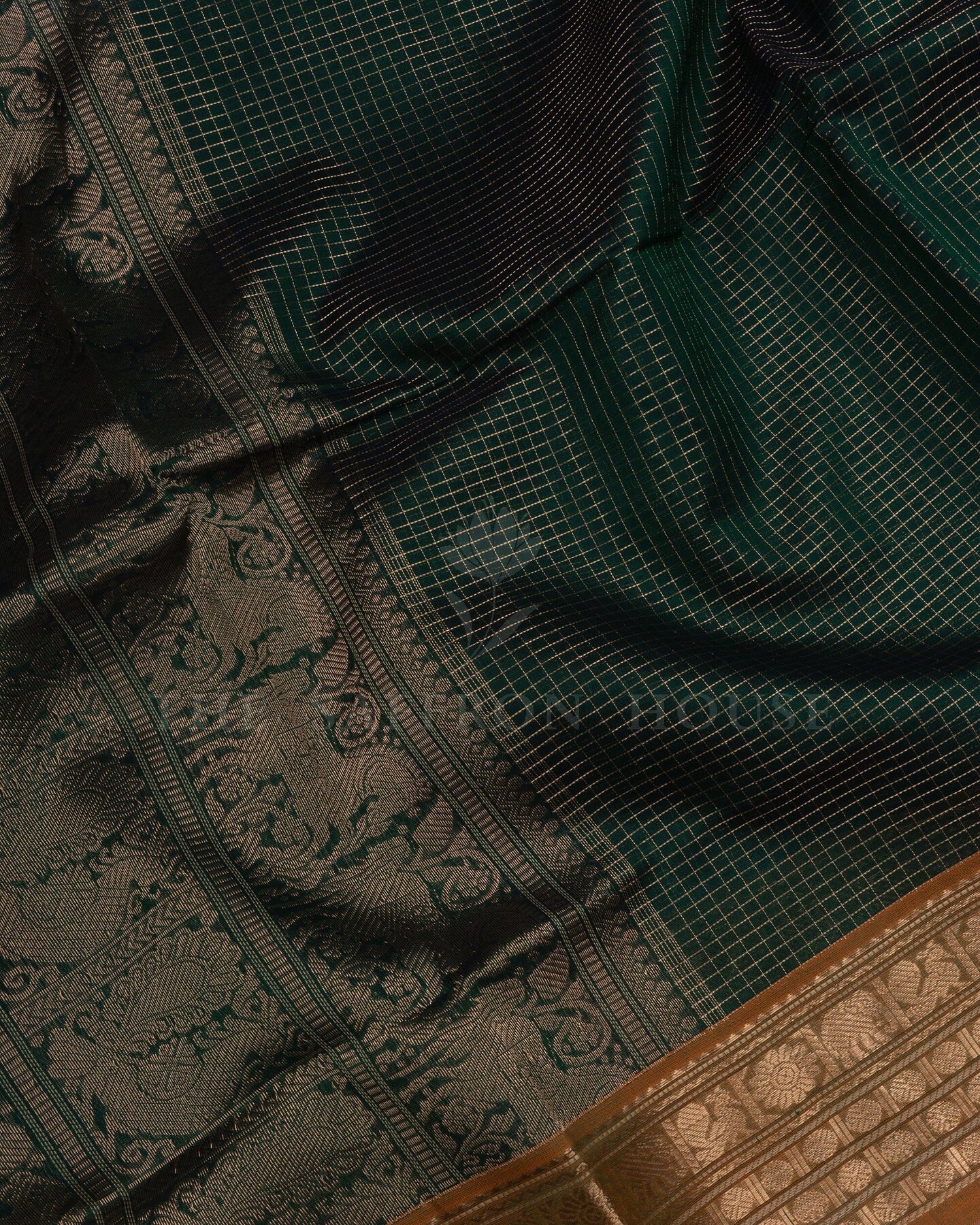 There is something about the interplay of bottle green and mustard yellow that feels both ancient and alive. This Checks Kanjivaram silk saree opens with deep and contemplative as forest dusk, its surface shimmering with the unhurried rhythm of the loom.