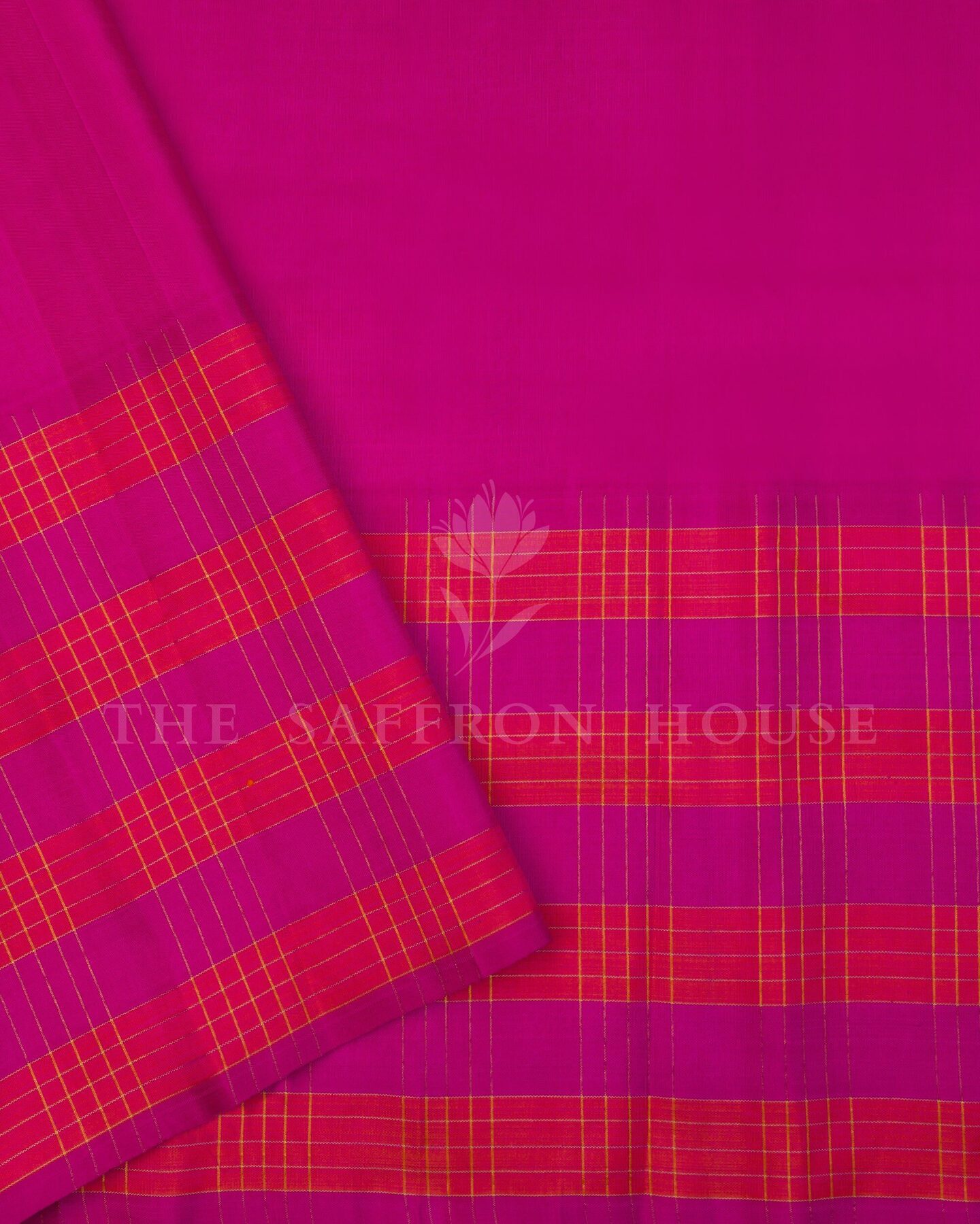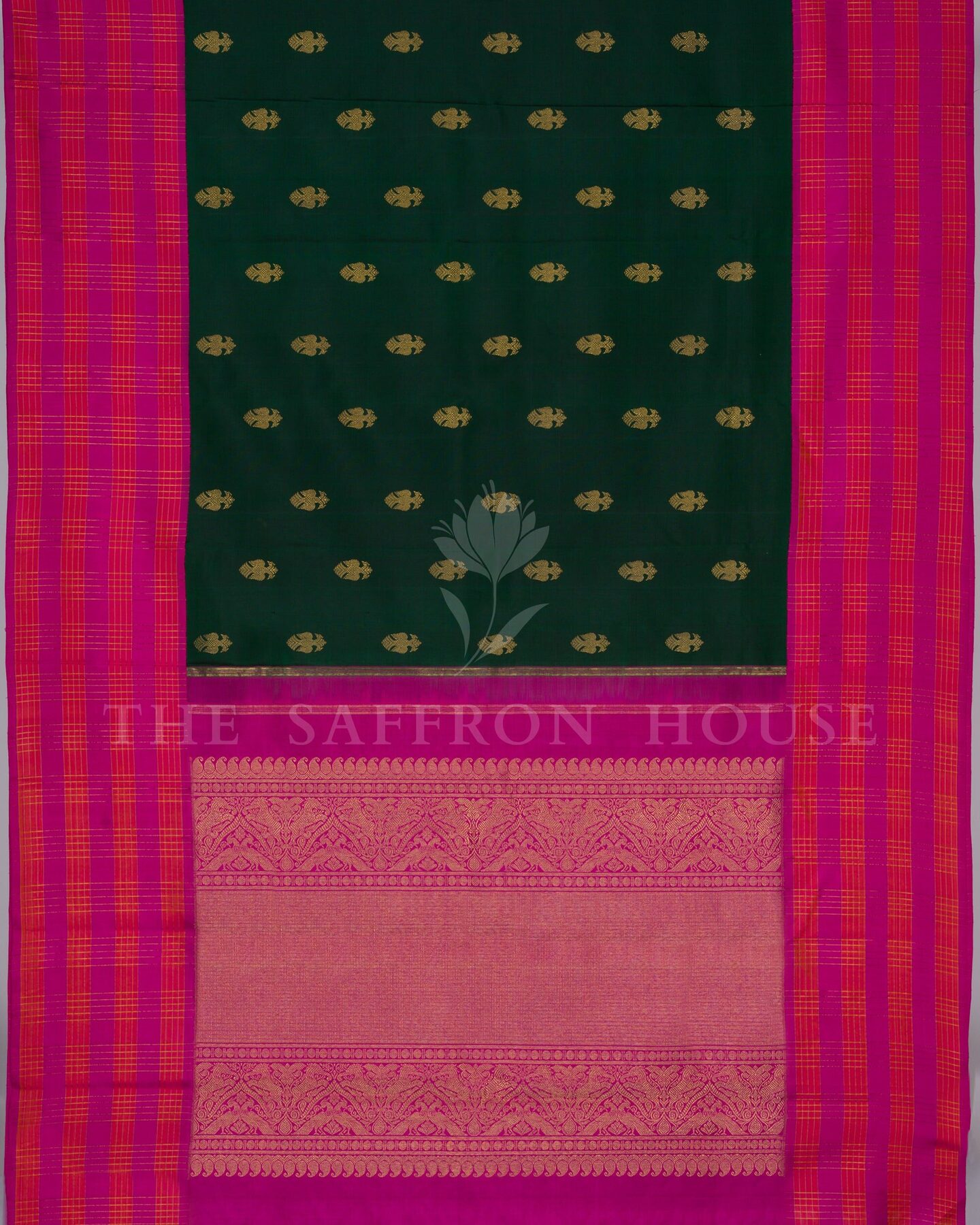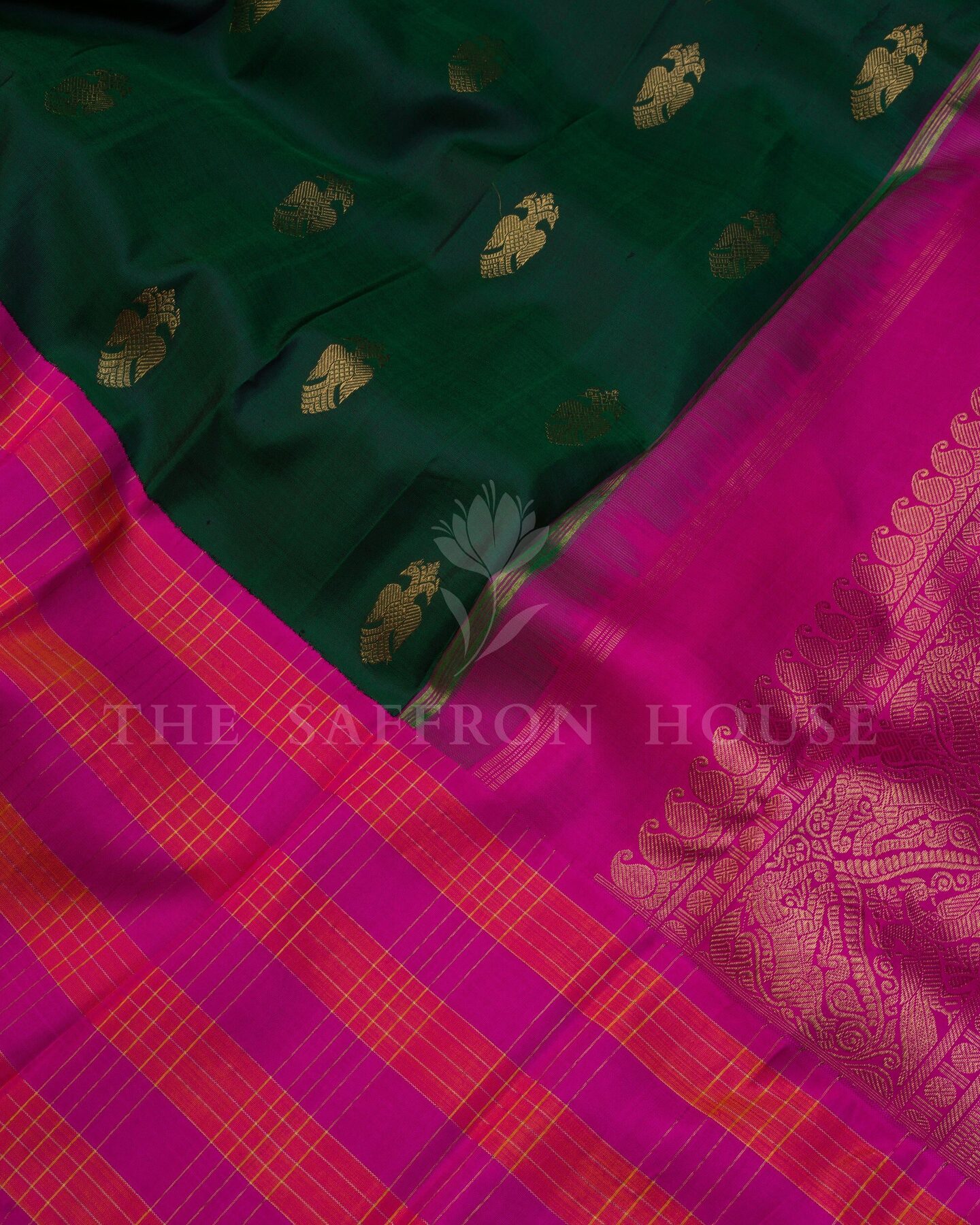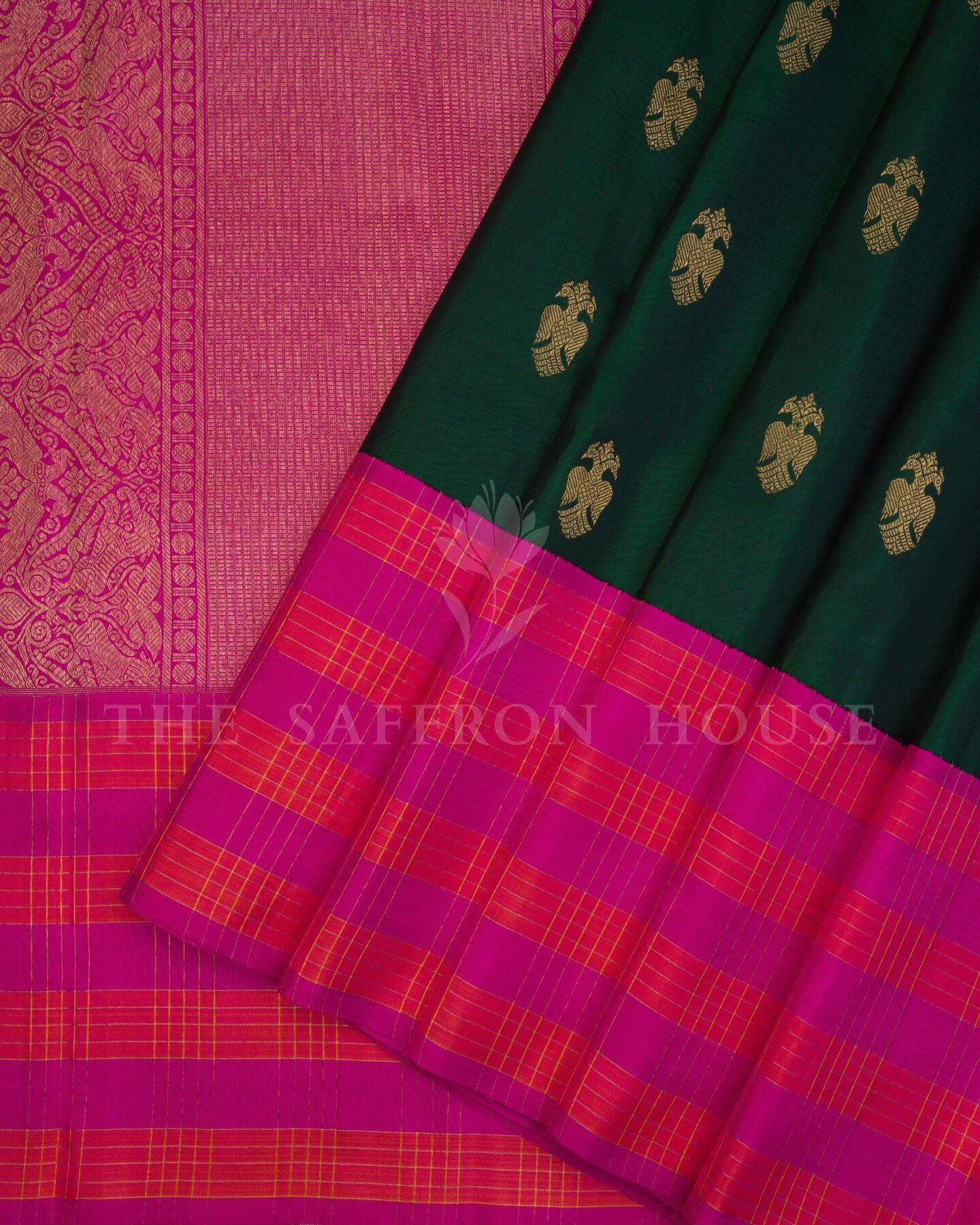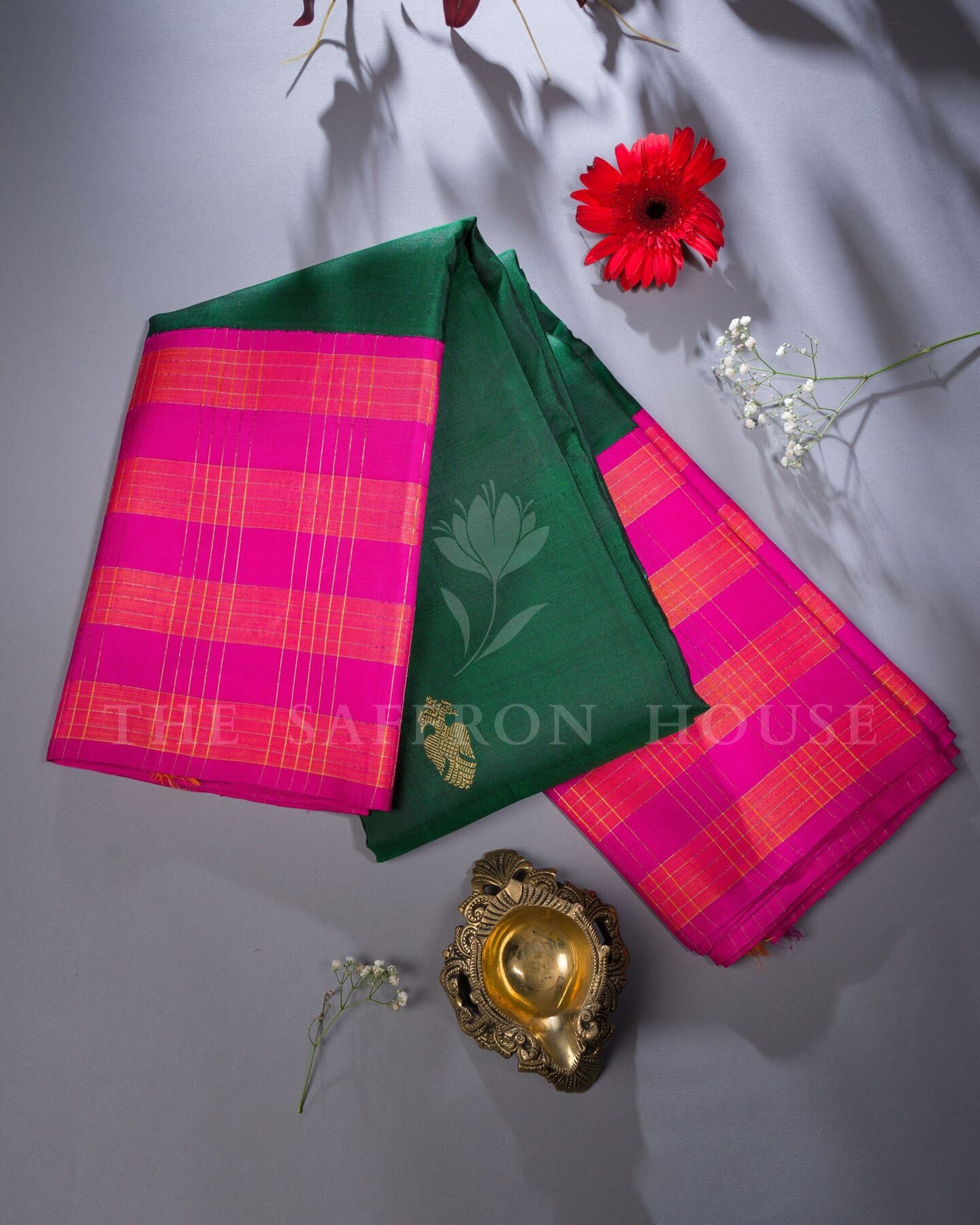 There is something about the interplay of bottle green and pink that feels both ancient and alive. This Handwoven Kanjivaram silk saree opens with deep and contemplative as forest dusk, its surface shimmering with the unhurried rhythm of the loom.