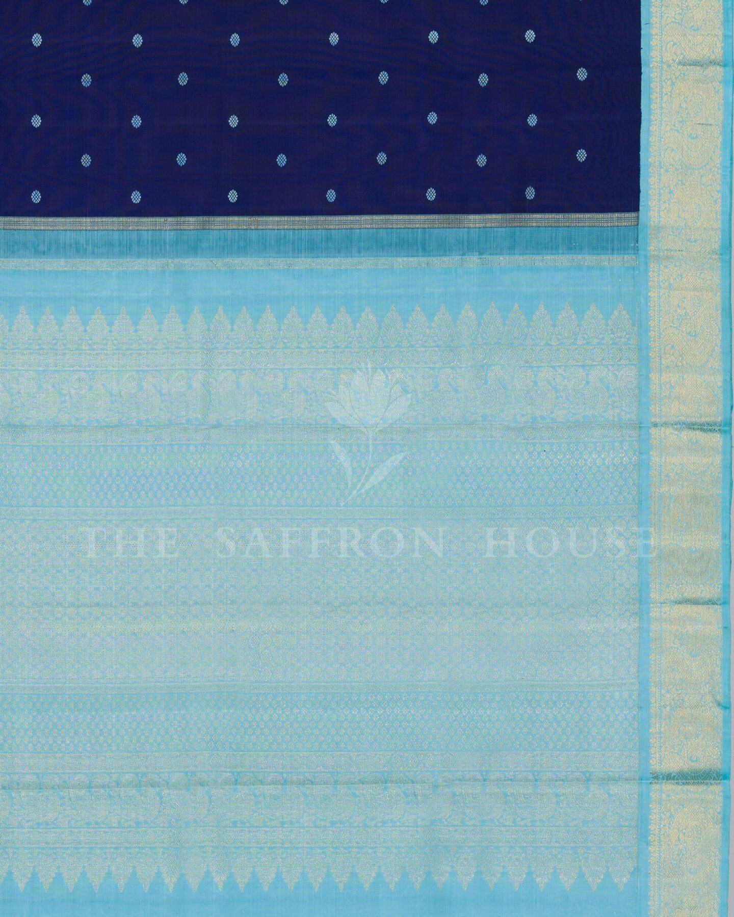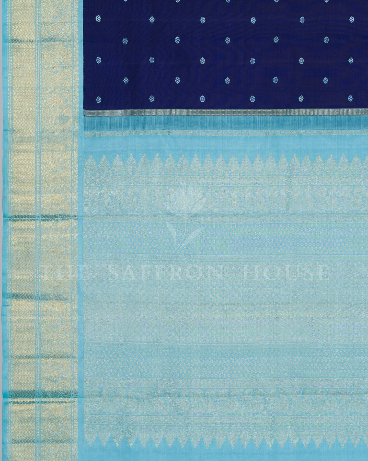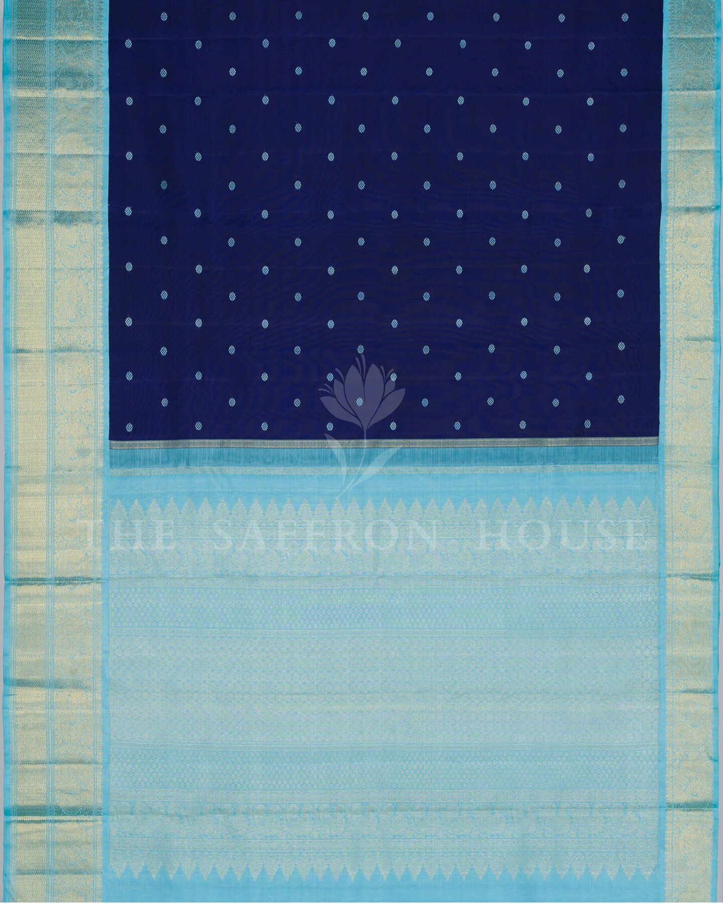 There is something about the interplay of navy blue and sky blue that feels both ancient and alive. This Handwoven Kanjivaram silk saree opens with radiant in its own quiet way, its surface shimmering with the unhurried rhythm of the loom.
